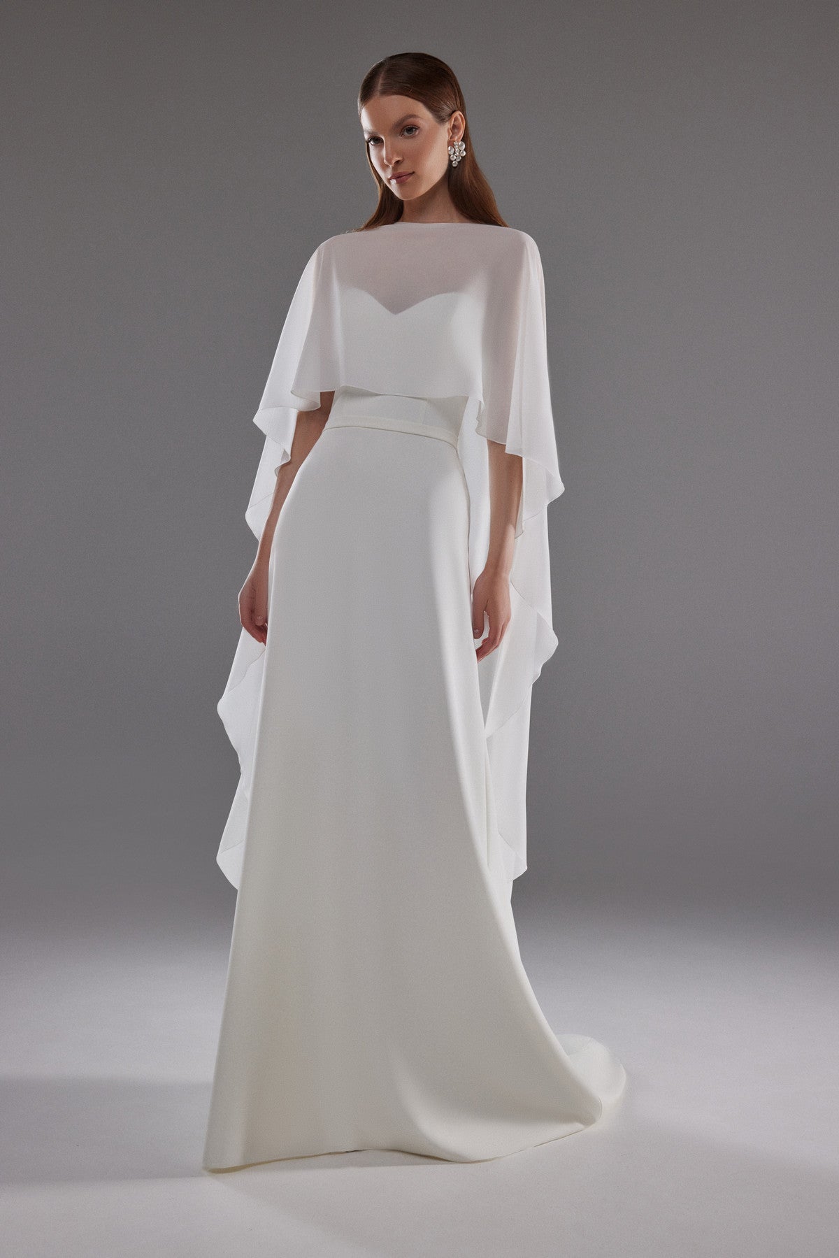 A contemporary chiffon cape with a classic round neckline, it is a simple alternative to...