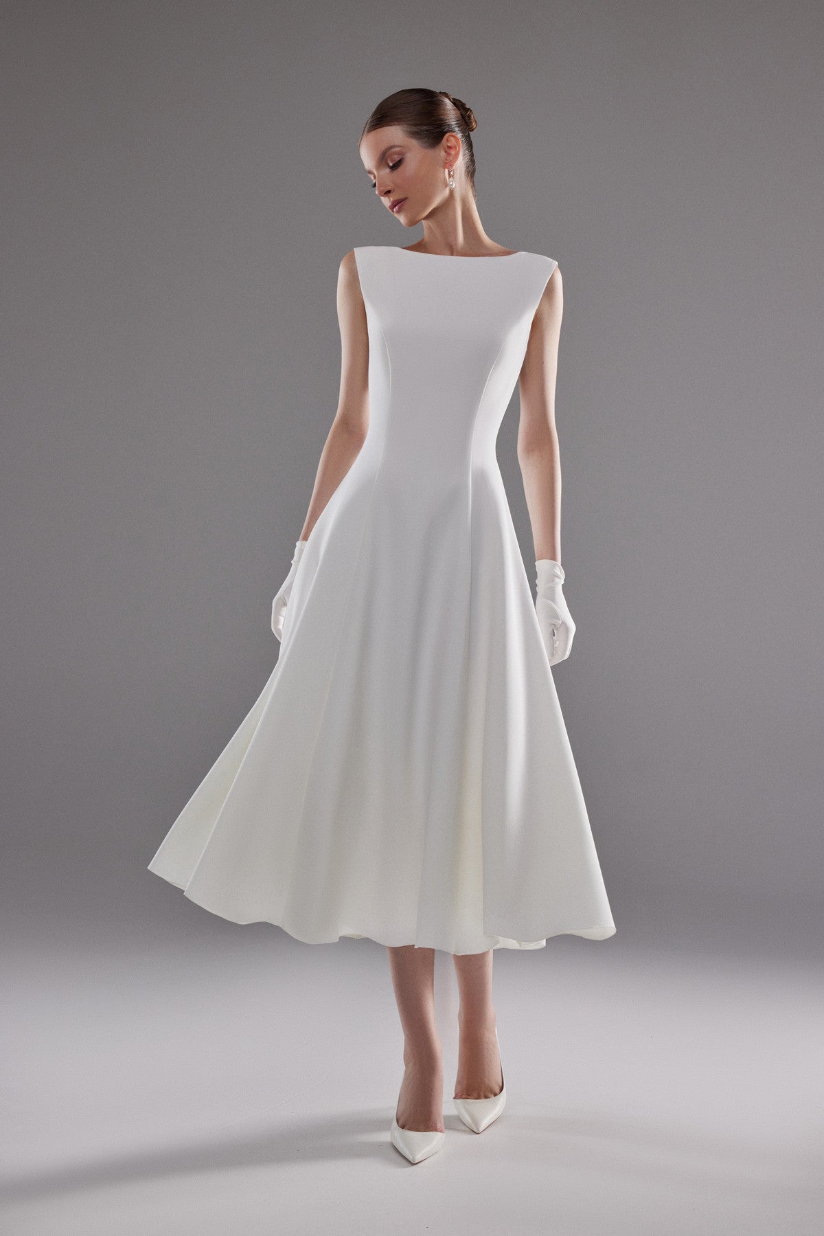 Minimalist Tea-Length White Crepe Wedding Dress Stacy