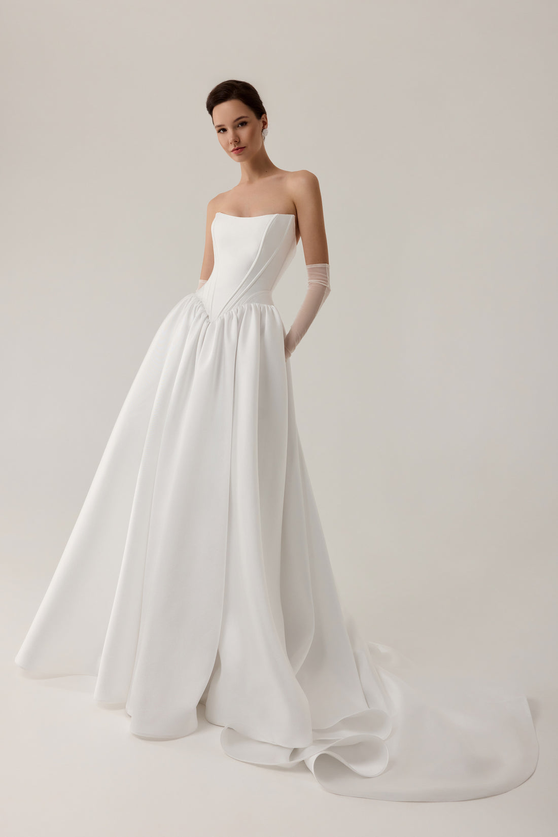 Strapless Drop Waist Mikado Wedding Dress Faith with Cathedral train