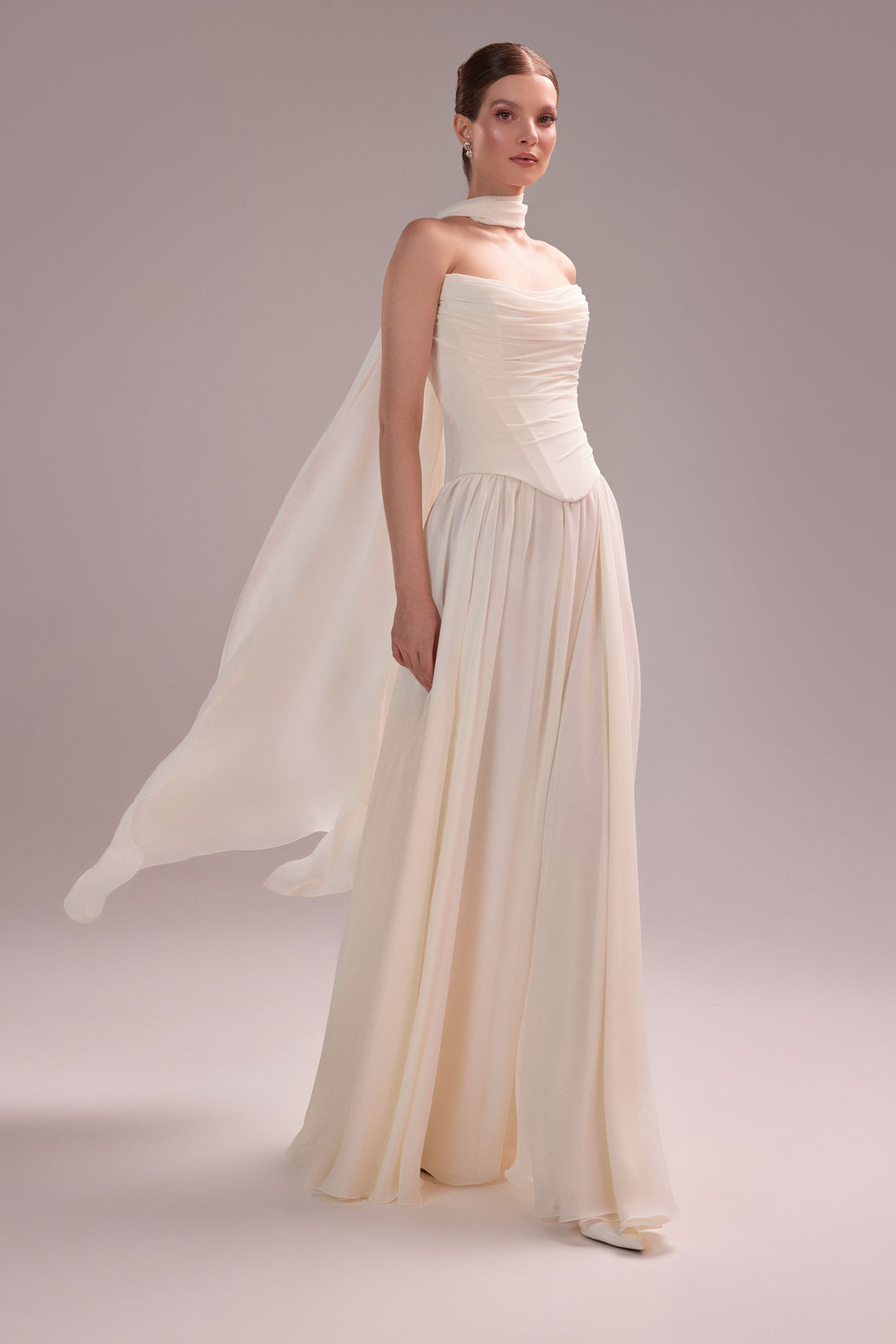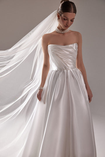 Elegant Ivory Strapless Wedding Dress Aphrodite | Satin Drop Waist Corset and Silk Pleated Skirt