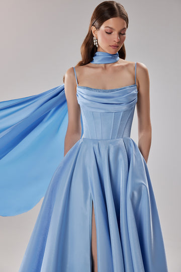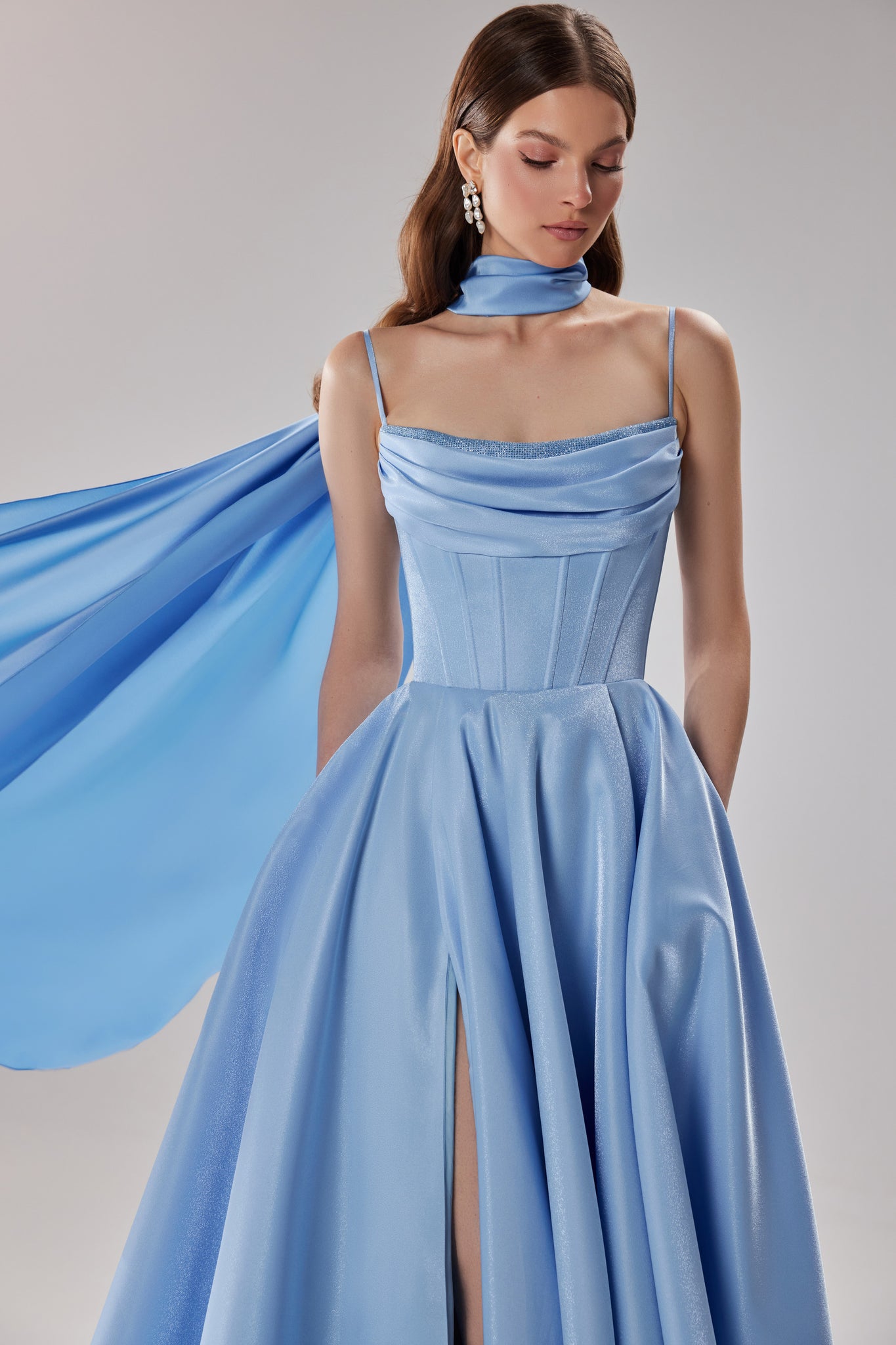 A long satin dress with an embossed corset and a square neckline, wide straps and...