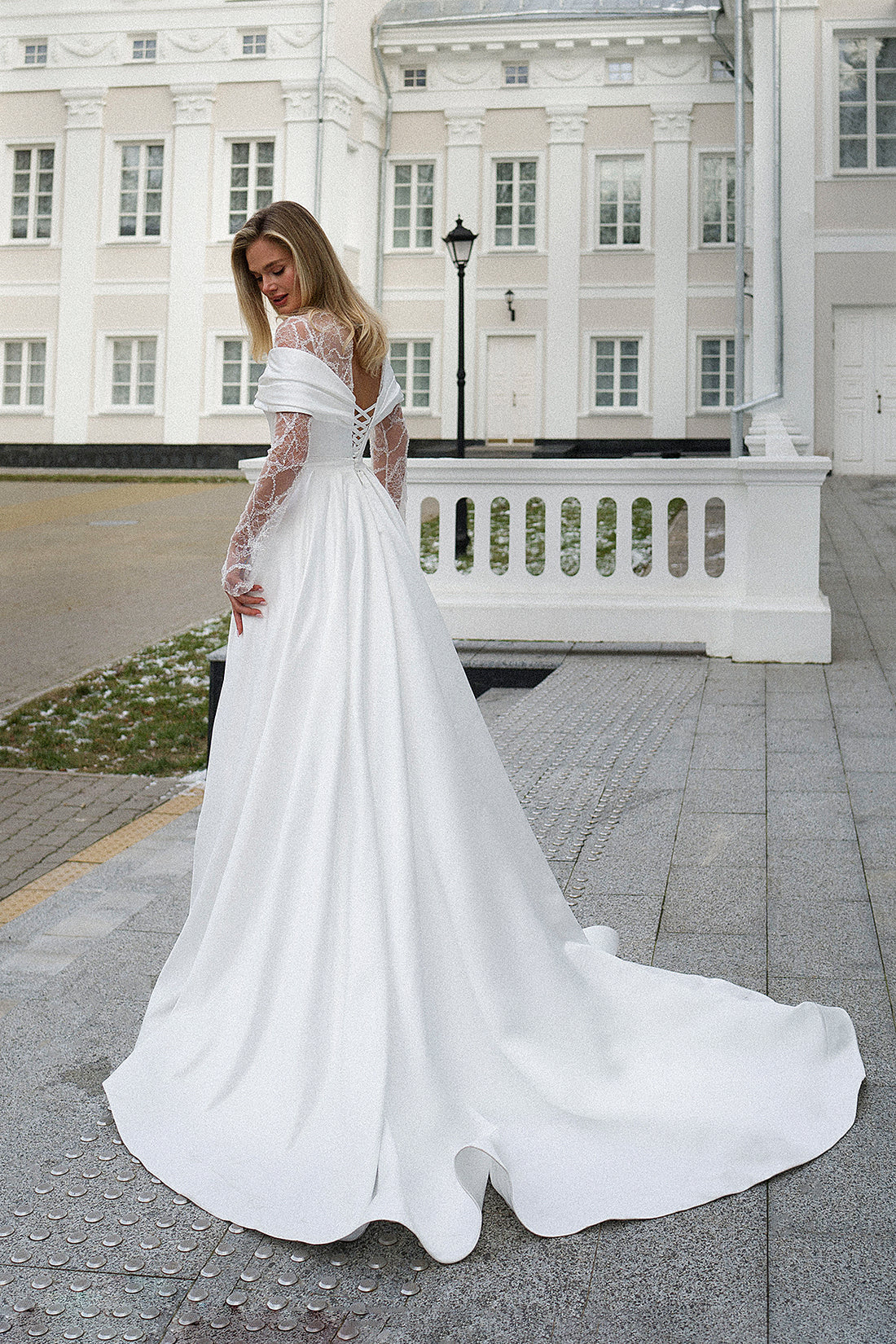 Elegant Satin A-Line Long Sleeve Wedding Dress Alberta-1 with High Lace Neck