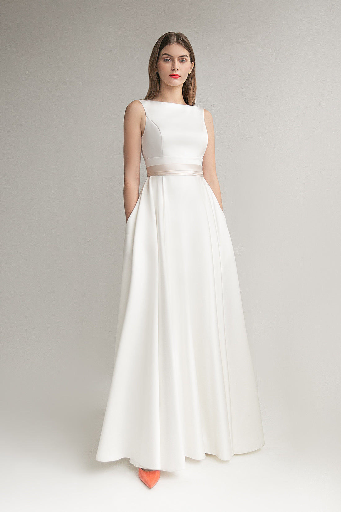 Satin Open Back Wedding Dress Goldie with Boat Neckline