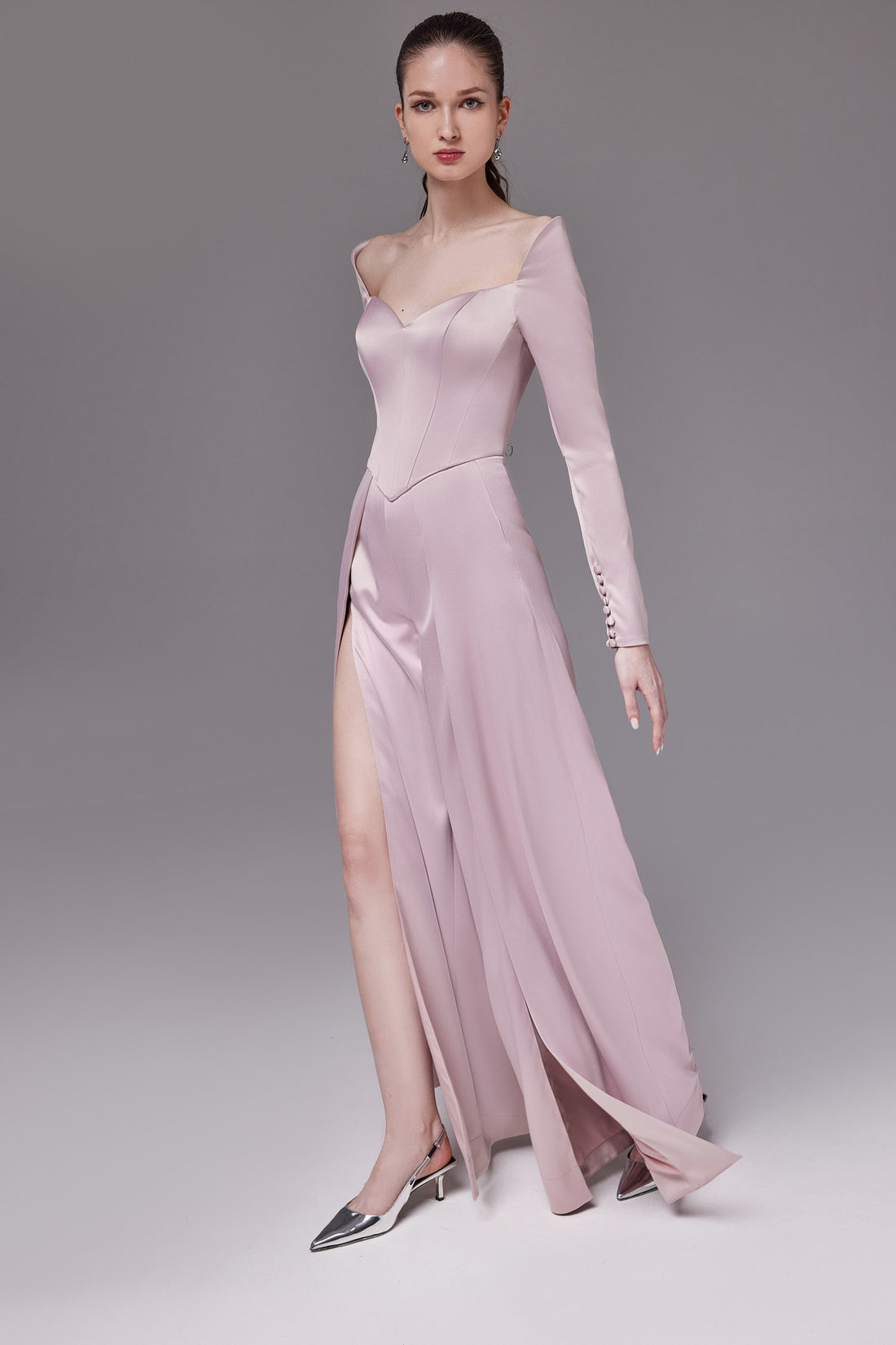 Powder Pink Satin Two-Piece Long Sleeve Corset Dress Giana with Mini Skirt