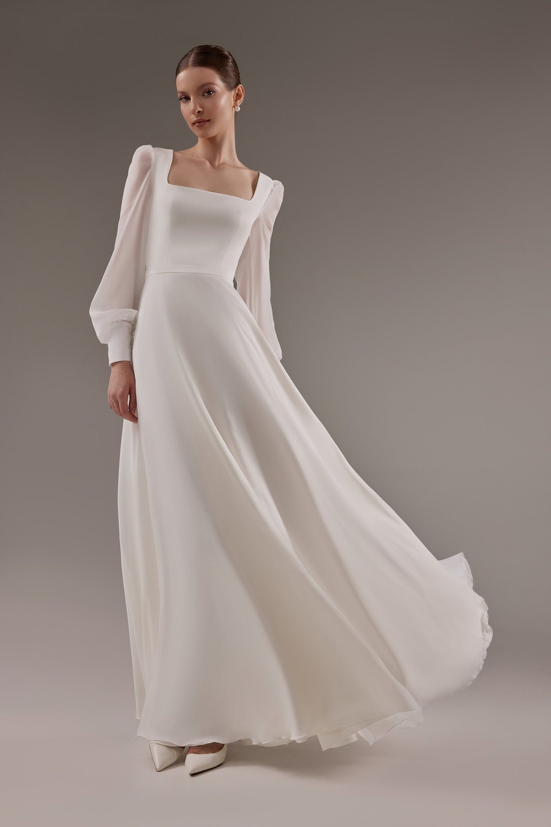 Modest A-line Square Neck Wedding Dress Edita with Long Chiffon Sleeves