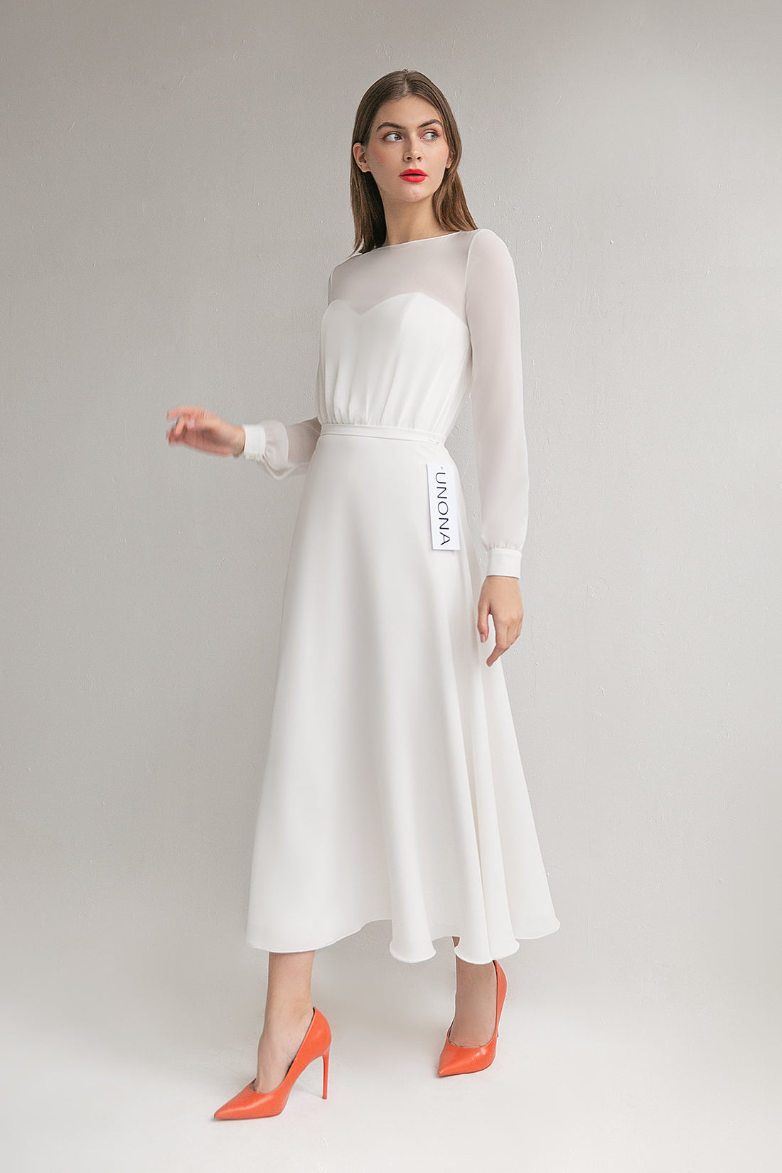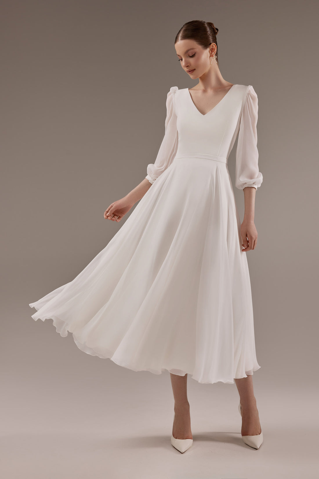 Modest A-line Midi Wedding Dress Valerie with Chiffon Sleeves