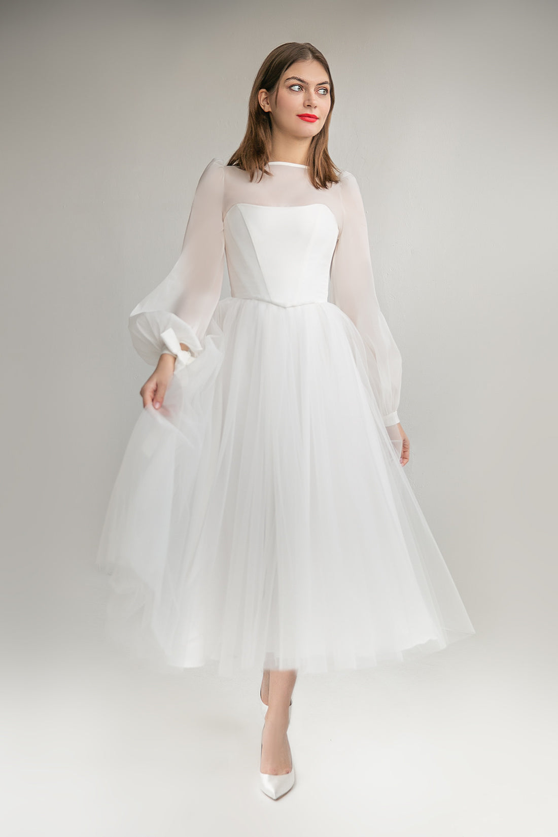 A-line Midi Wedding Dress Adele With Long Sleeves and Lace-up Corset