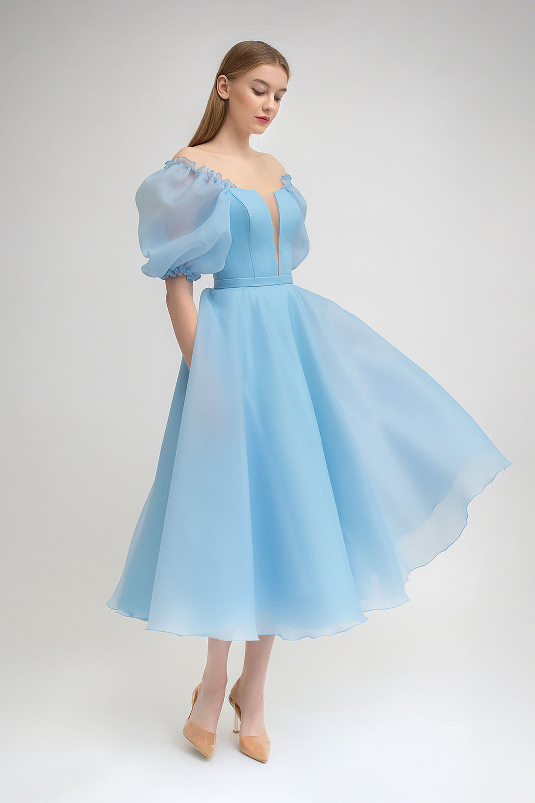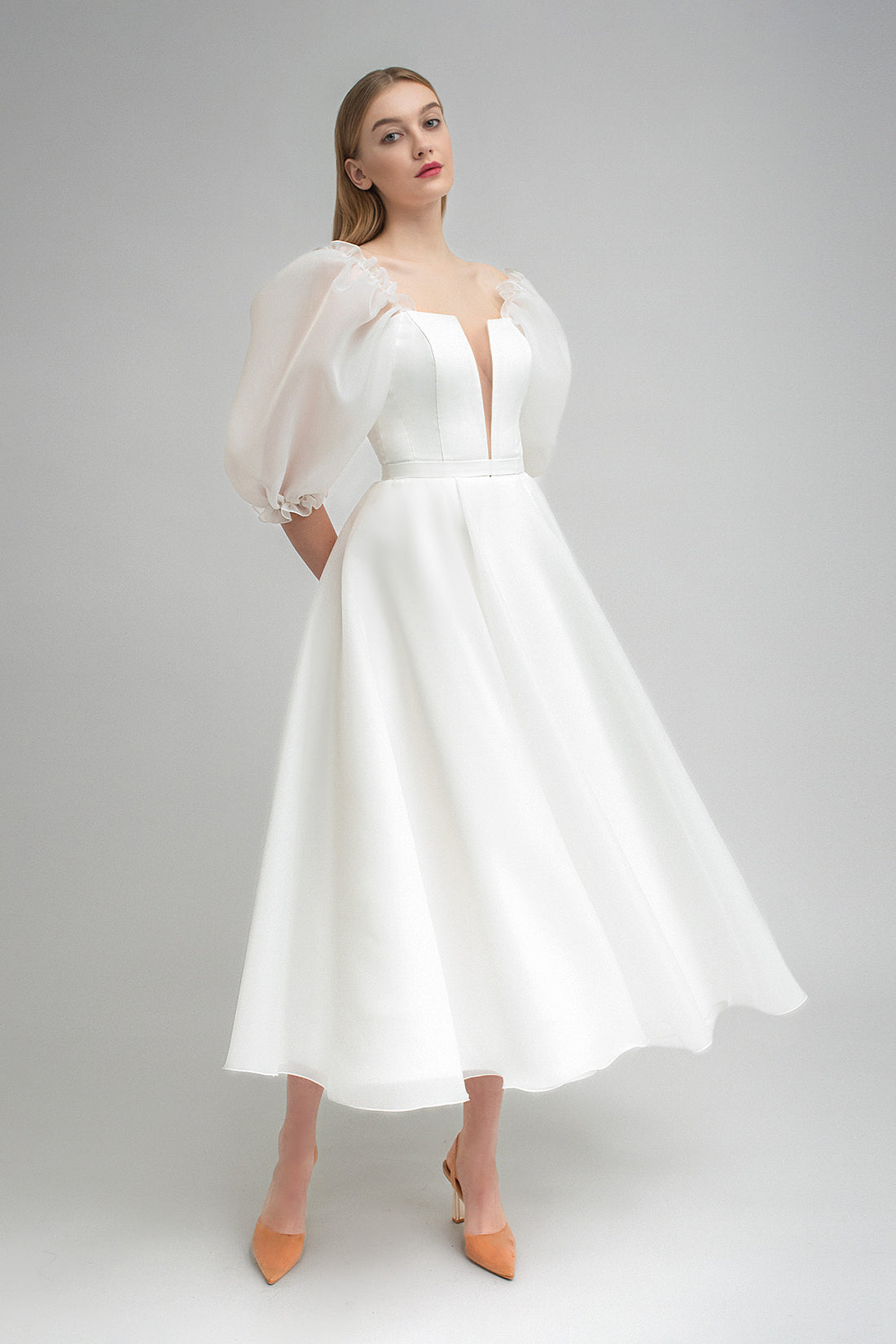 Organza Plunge Neck Midi Wedding Dress Katarina With Puffy Sleeves