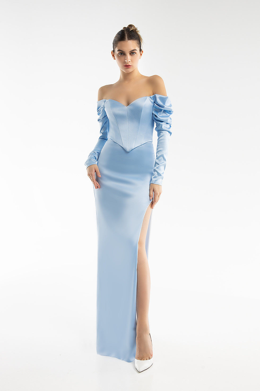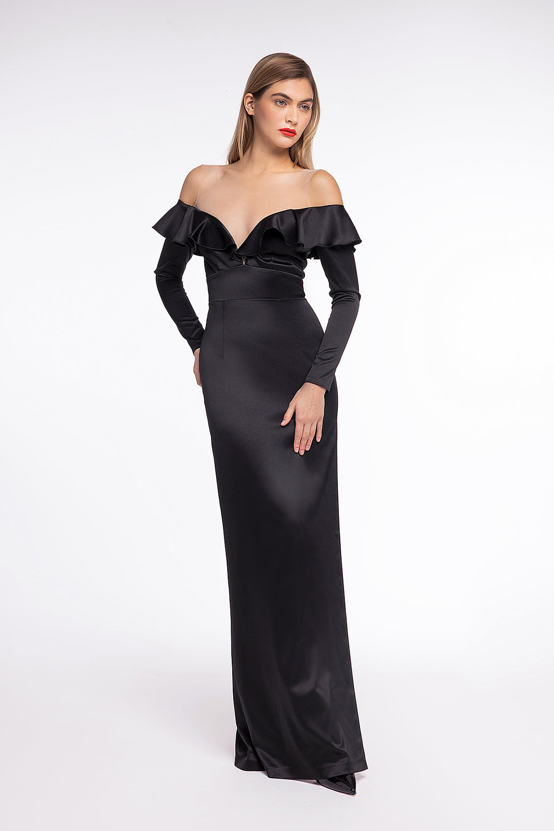 Off-Shoulder Satin Gown Celine with Illusion Neckline