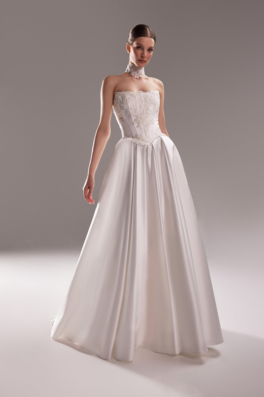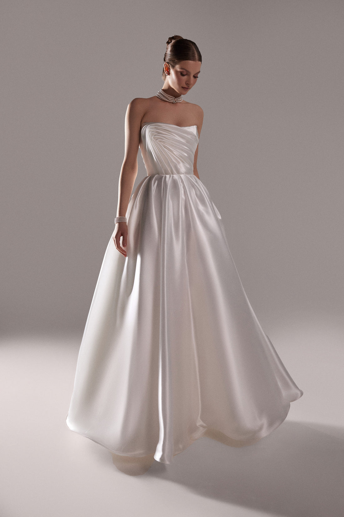 Satin Wedding Dress Demna with Embroidered Lace Corset | A-line Strapless Bridal Gown
