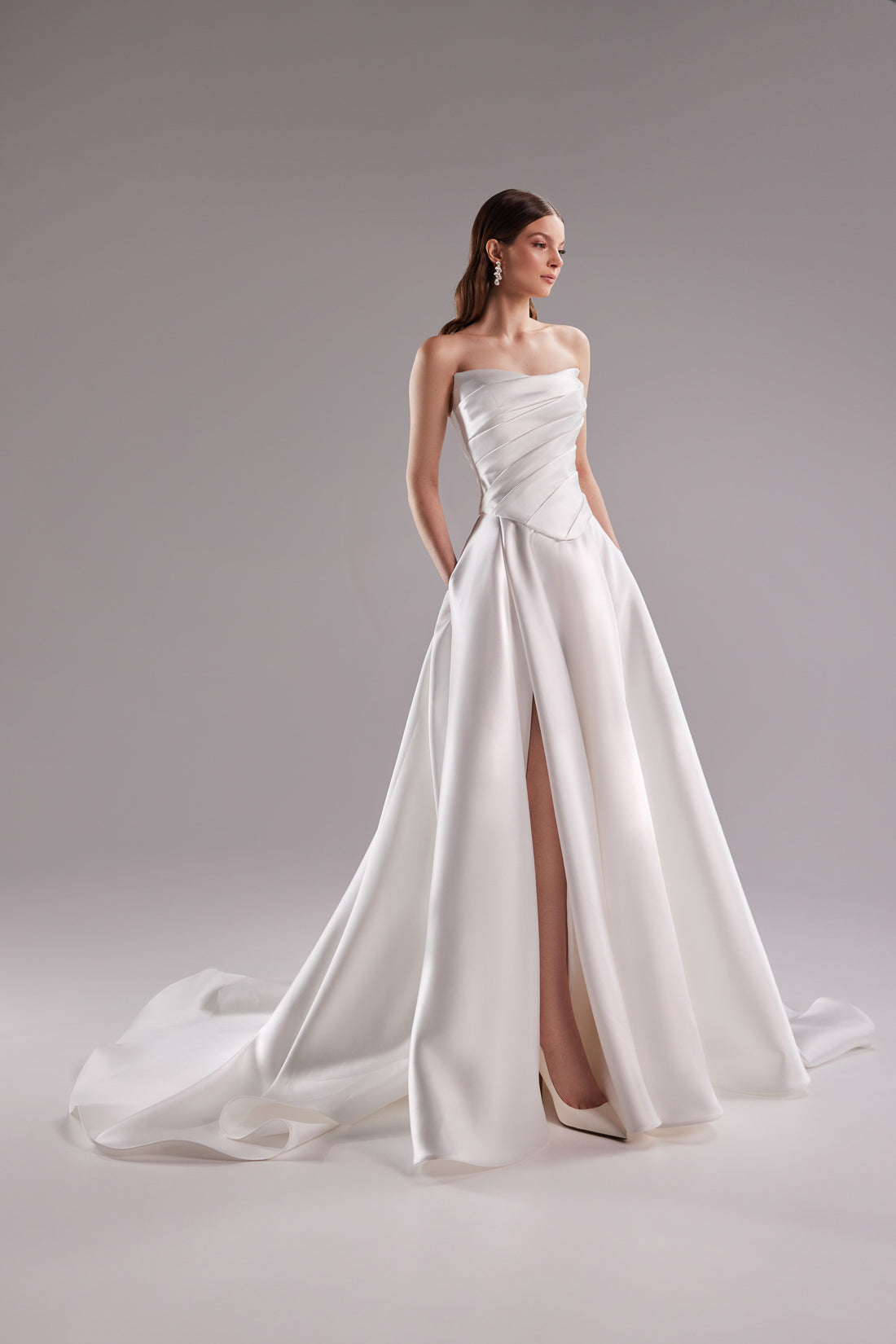 Strapless Mikado Wedding Dress Sunny | A-Line Corset Off-Shoulder Bridal Gown with Slit