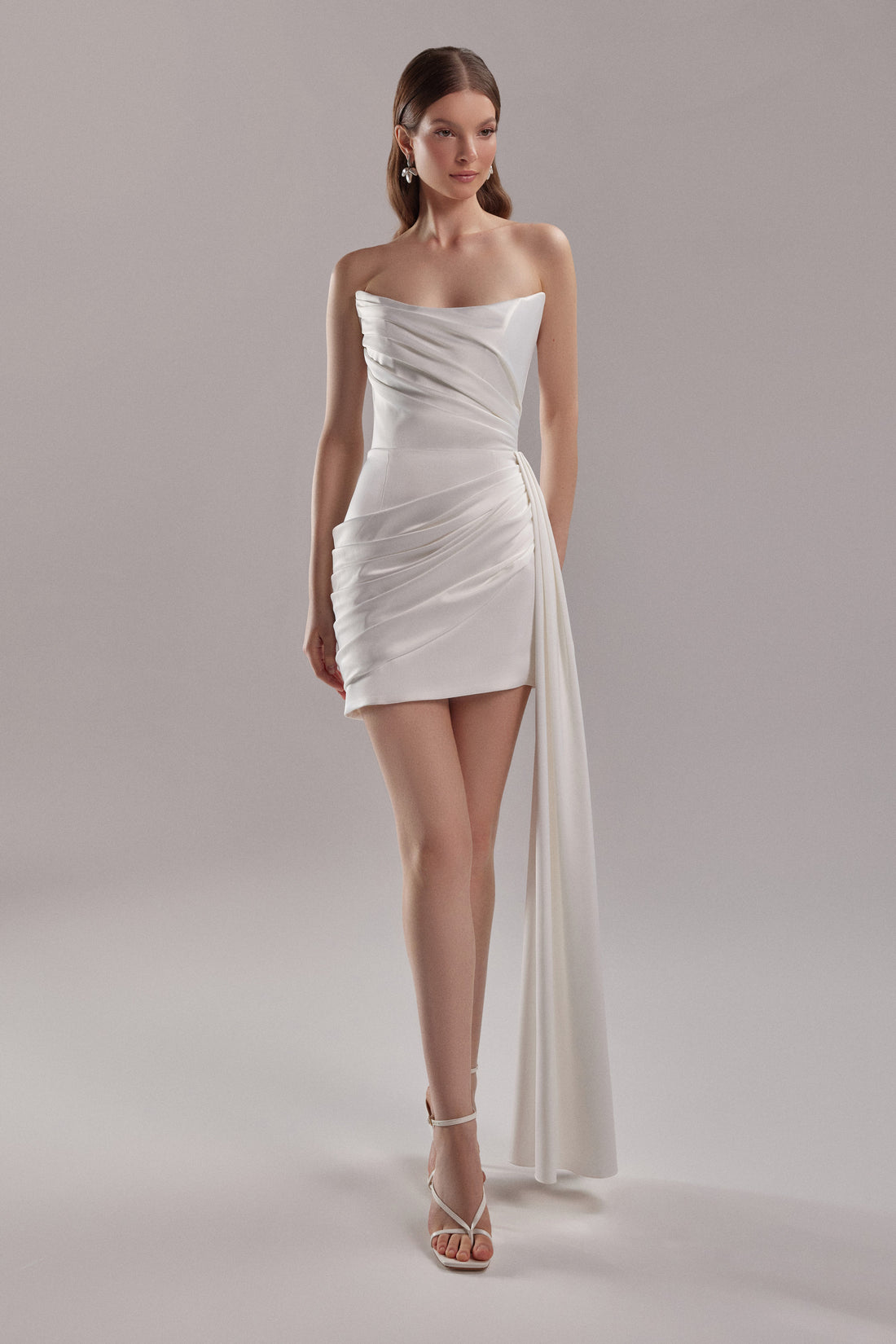 Textured Ruched Satin White Mini Wedding Dress Gabi | Corset Reception & Bachelorette Party Dress