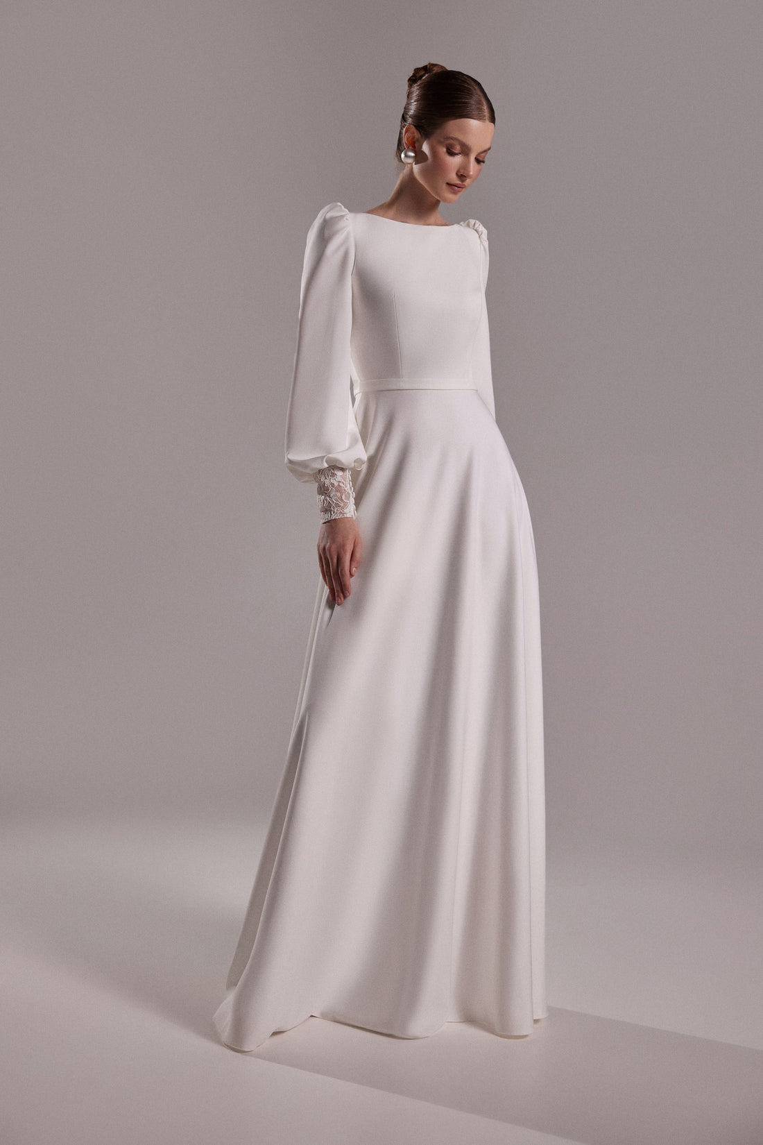 Modest Crepe A-line Wedding Dress Camalia | Boat Neck Dress with Long Bishop Sleeves