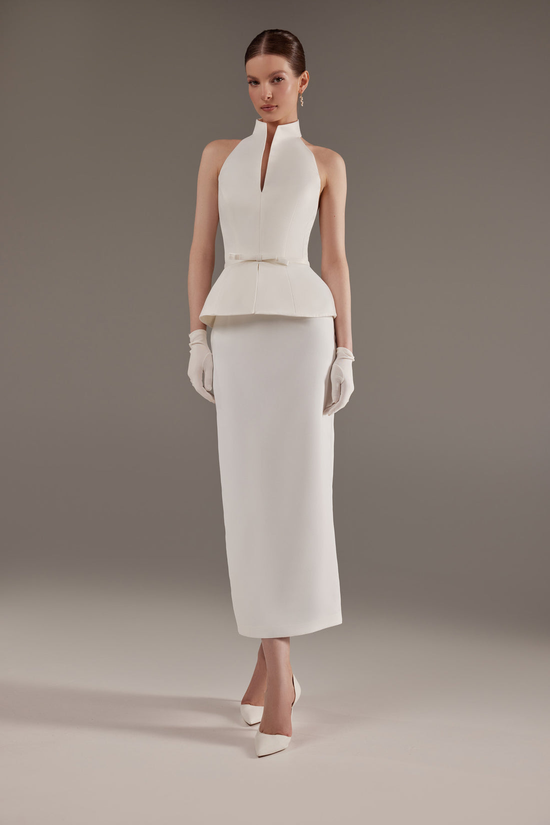 Two Piece Wedding Dress Salma | Halter Neck Peplum Corset And Satin Tea Length Skirt