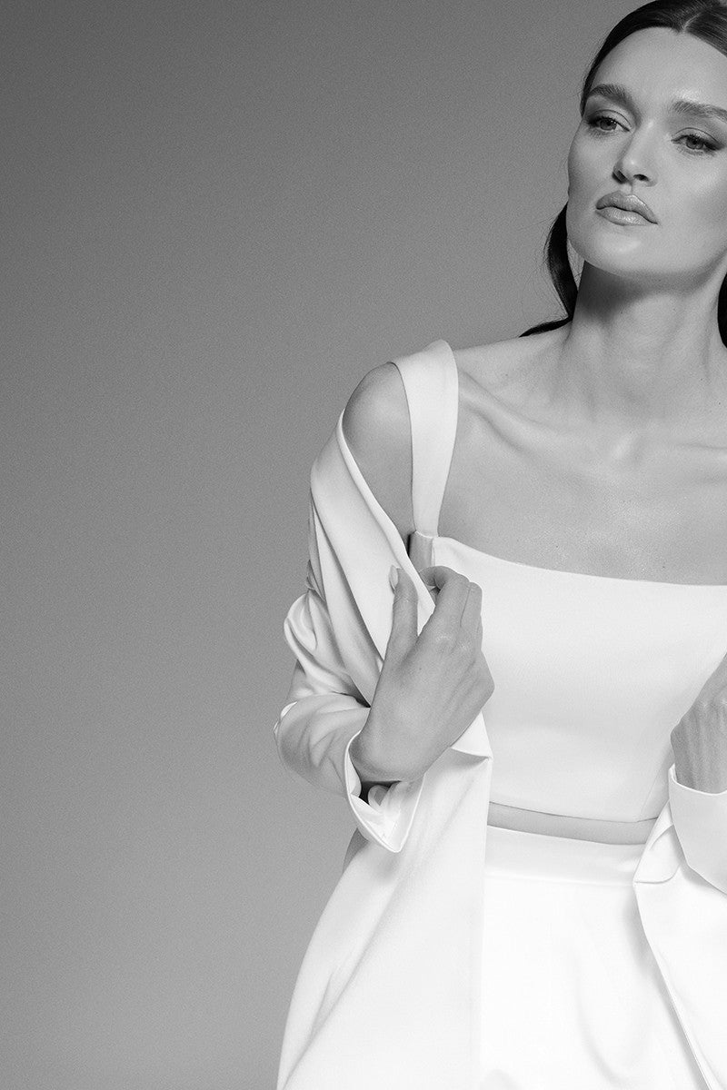 An oversized straight-cut jacket in glossy satin would be a perfect choice for a modern bride. Made from a viscose blend stretch satin fabric, this single-breasted blazer has peak lapels to add a touch of volume. You can wear it as a suit with matching Andrea pants.