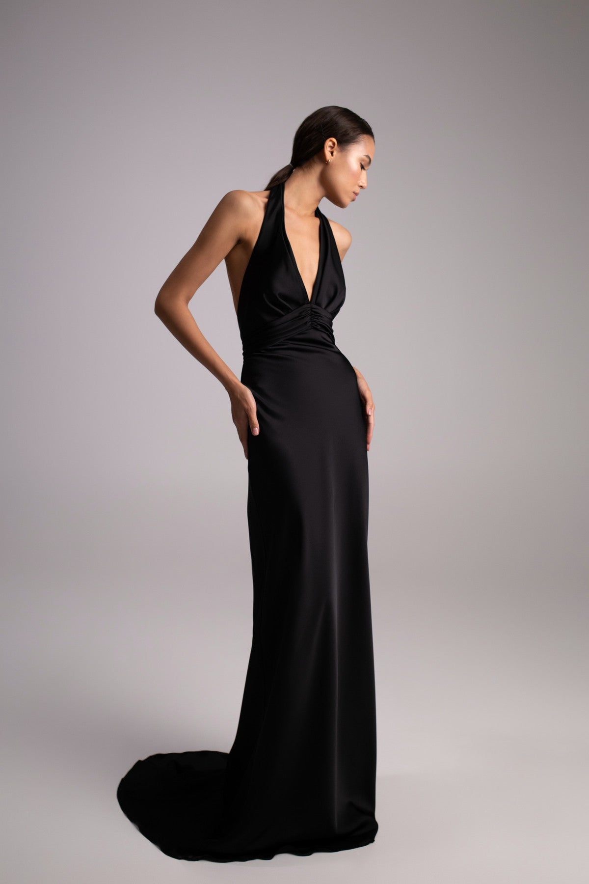 A stunning satin wedding dress will suit any celebration, whether it's a small intimate party or a big extravagant event. It'll make the bride look like a true star! Minimalist dress with a deep V-neckline, an open back, and a small train. The top of the dress is cut just below the bust and is accentuated by a large, body-hugging belt. The neckline is secured with buttons on the inside to ensure a secure fit.
