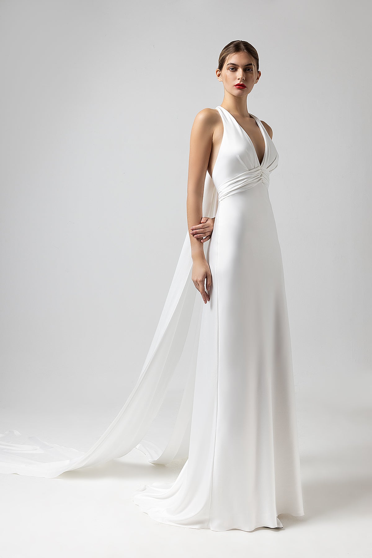 A stunning silk wedding dress will suit any celebration, whether it's a small intimate party or a big extravagant event. It'll make the bride look like a true star! Minimalist dress with a deep V-neckline, an open back, and a small train. The top of the dress is cut just below the bust and is accentuated by a large, body-hugging belt. The neckline is secured with buttons on the inside to ensure a secure fit. A long, wide scarf-like ribbon frames the neck, or can be fixed under the collar as a train, giving you different looks with the same dress.