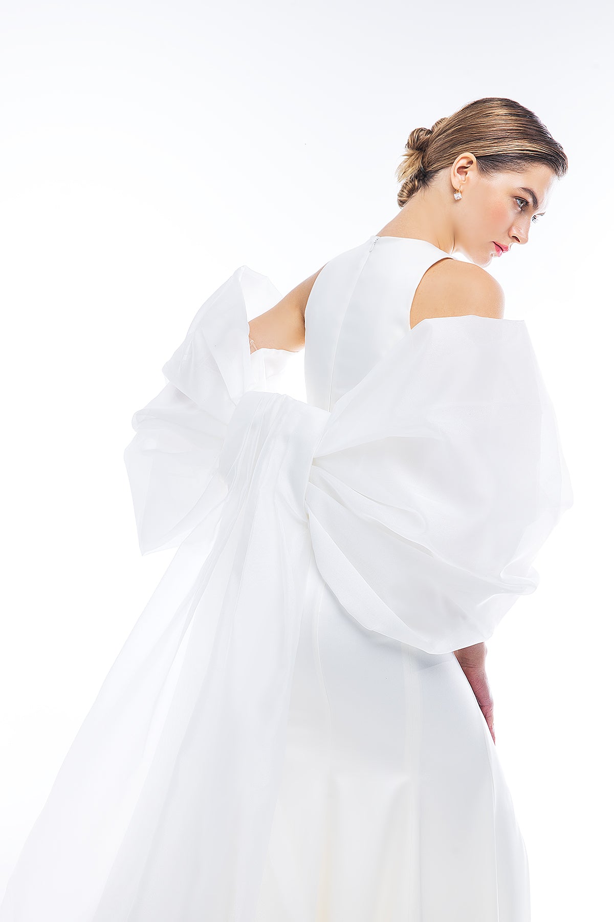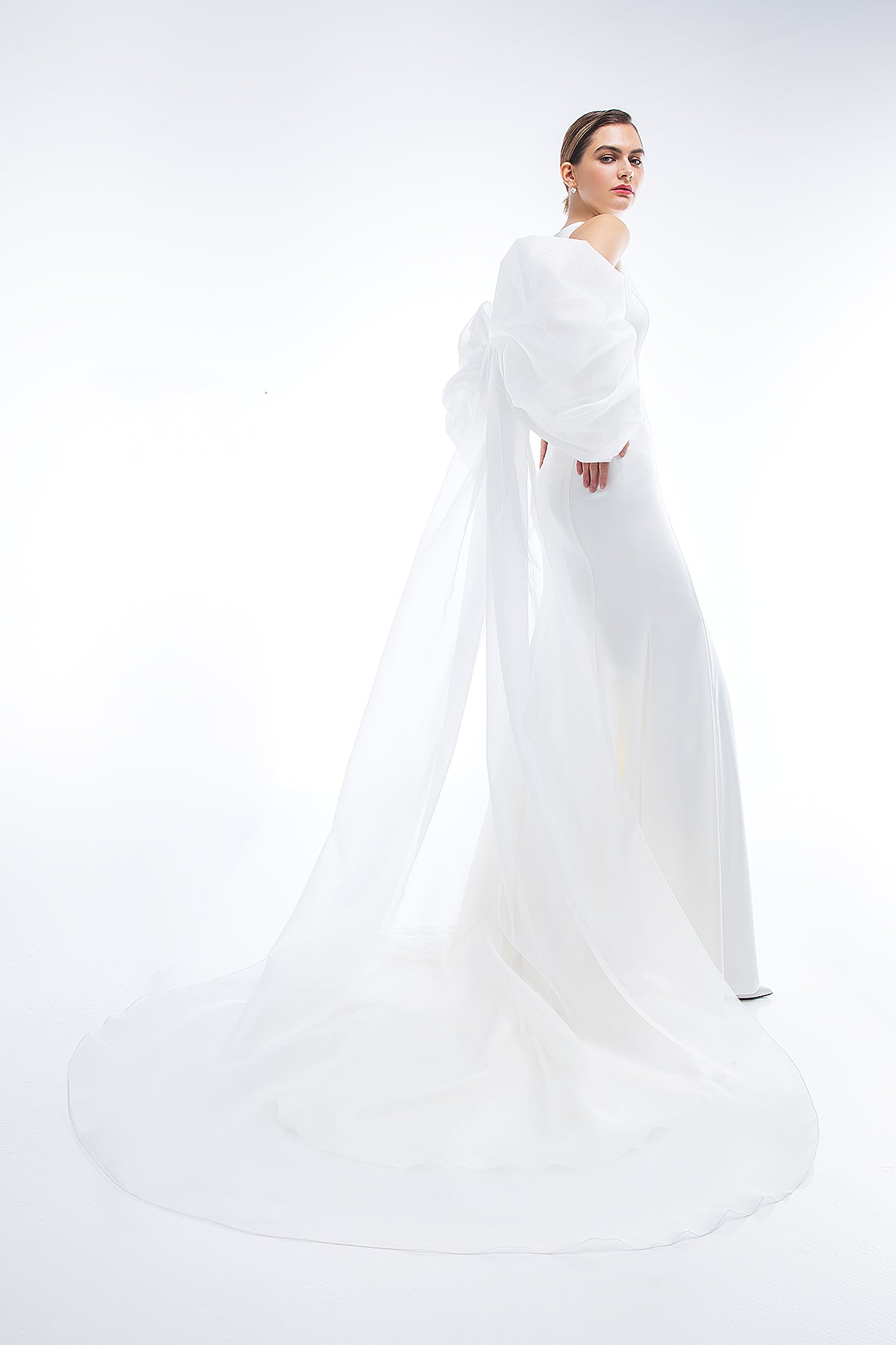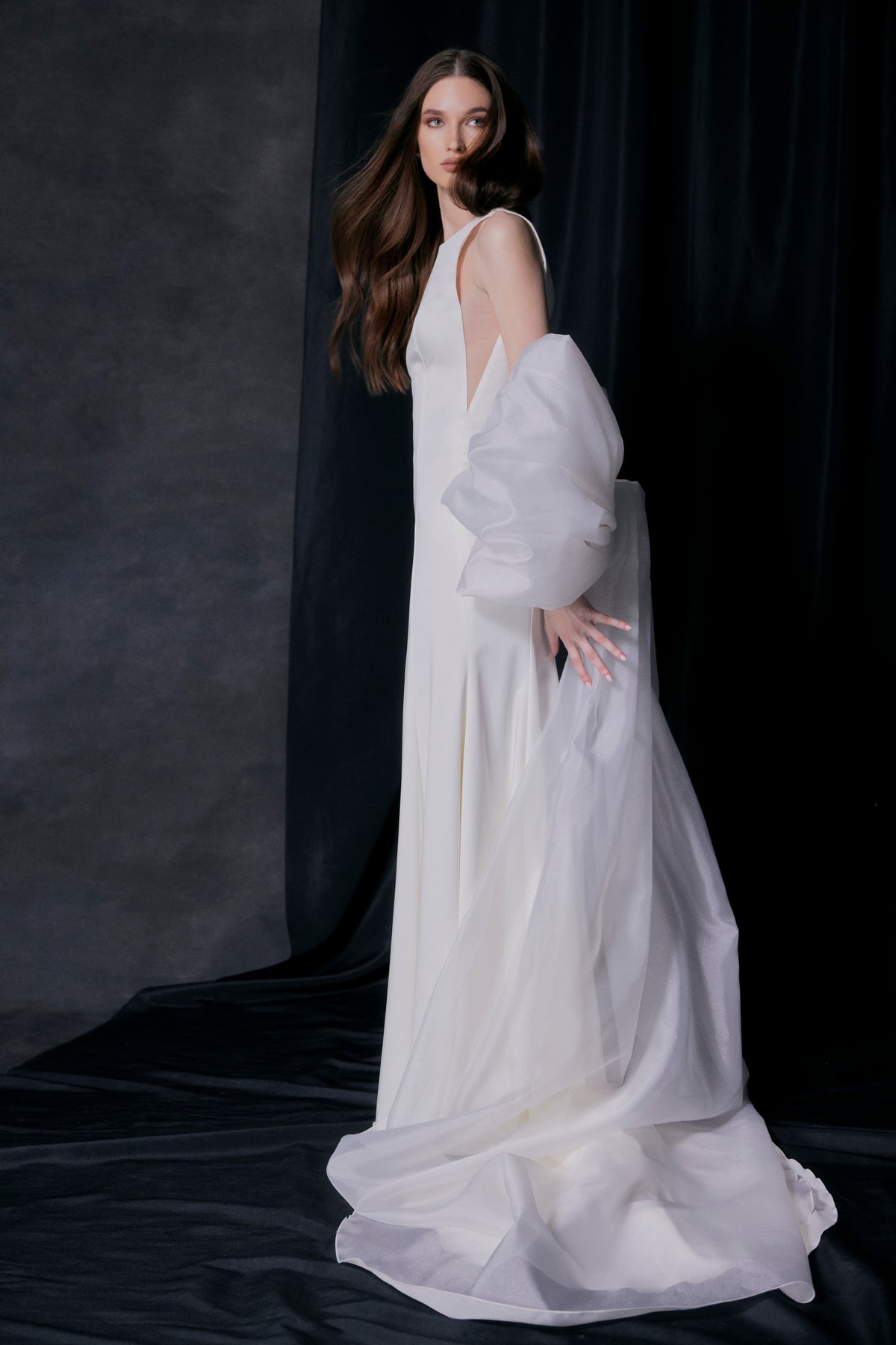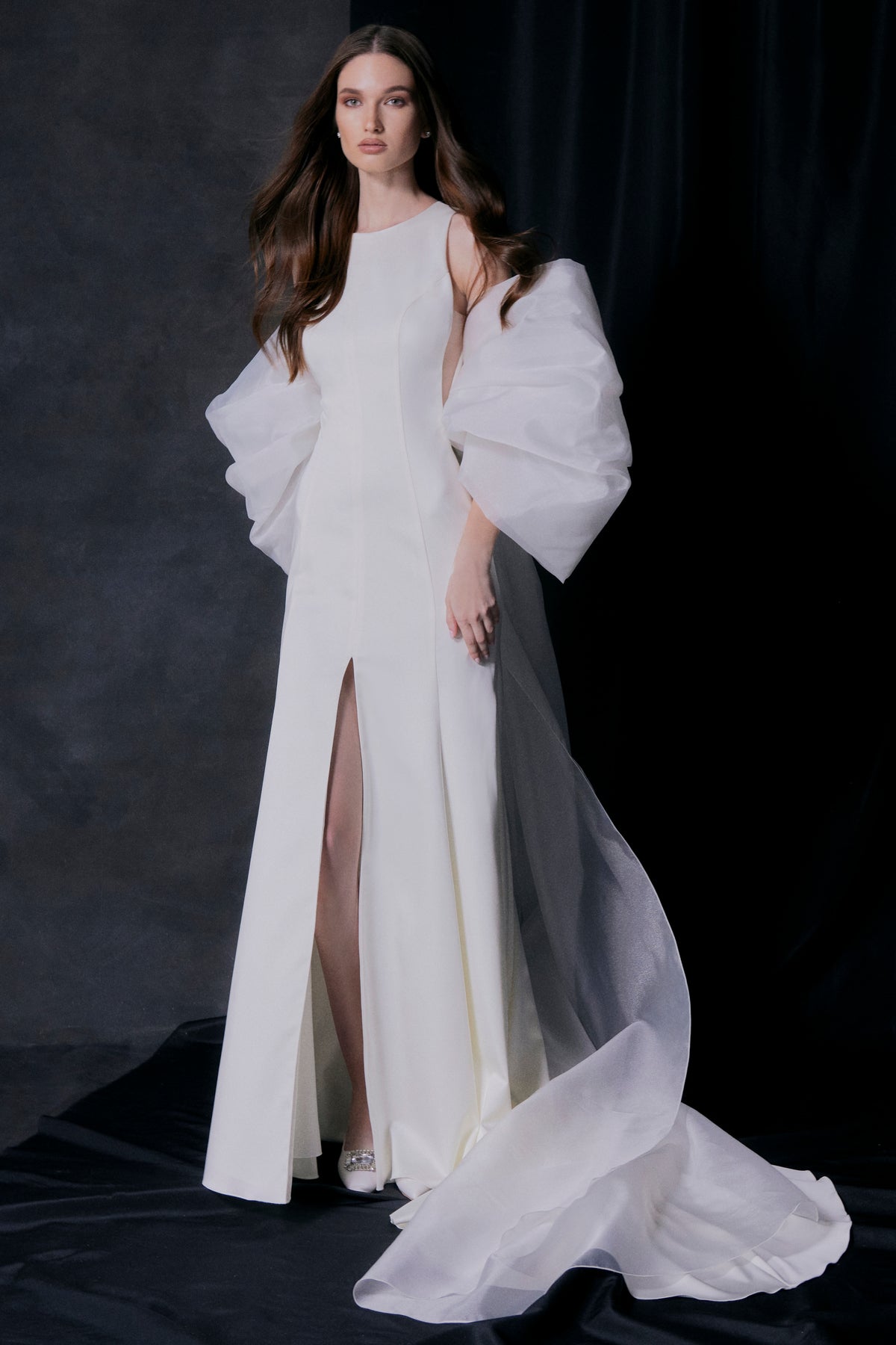 The unusual cape featuring a train is crafted from organza and features spectacular flowing sleeves that drape over the back, forming a bow.