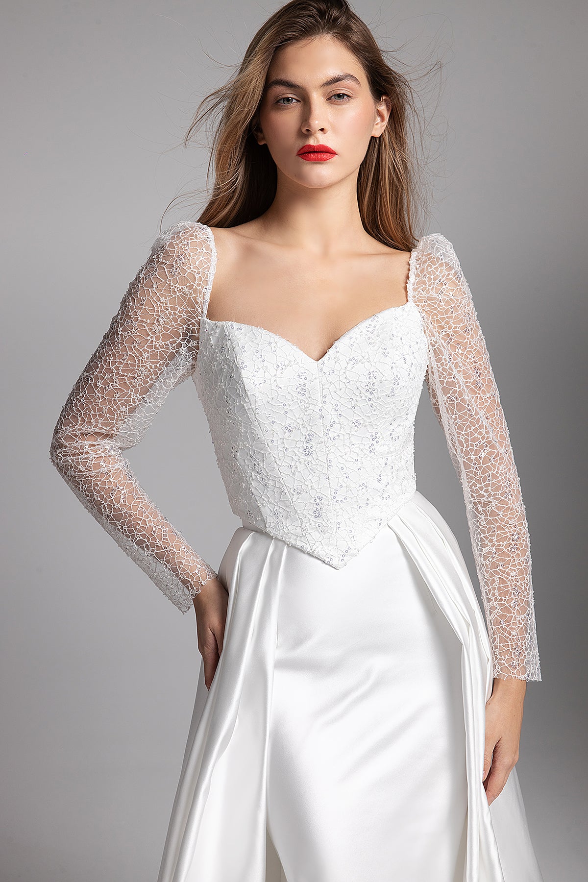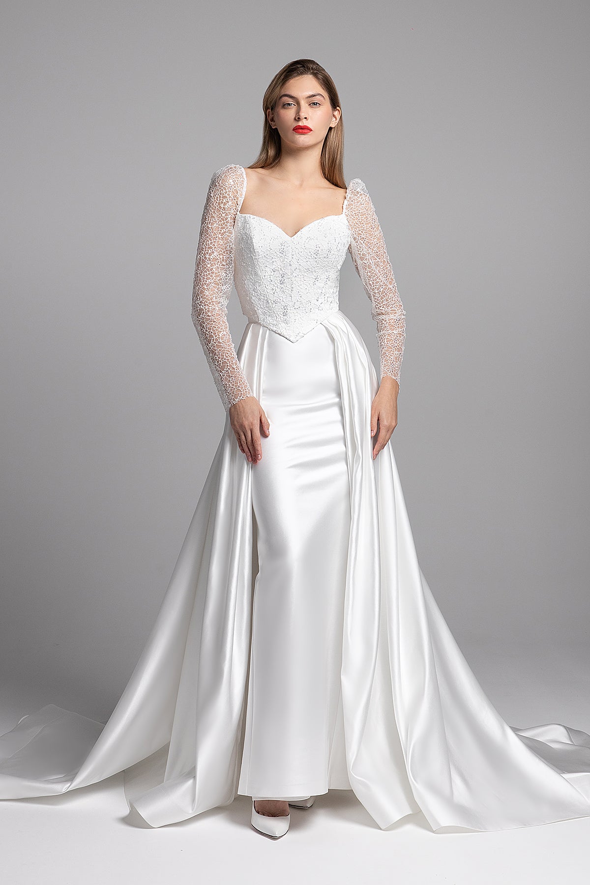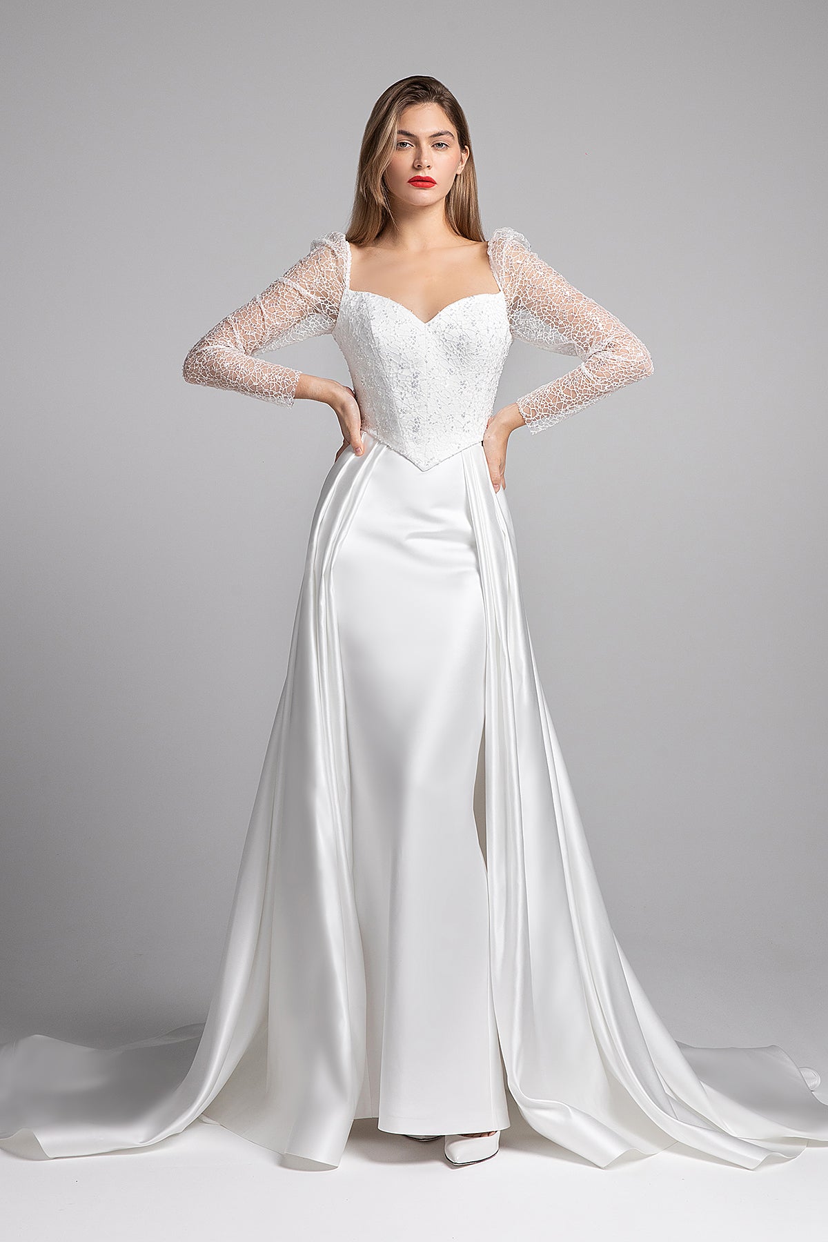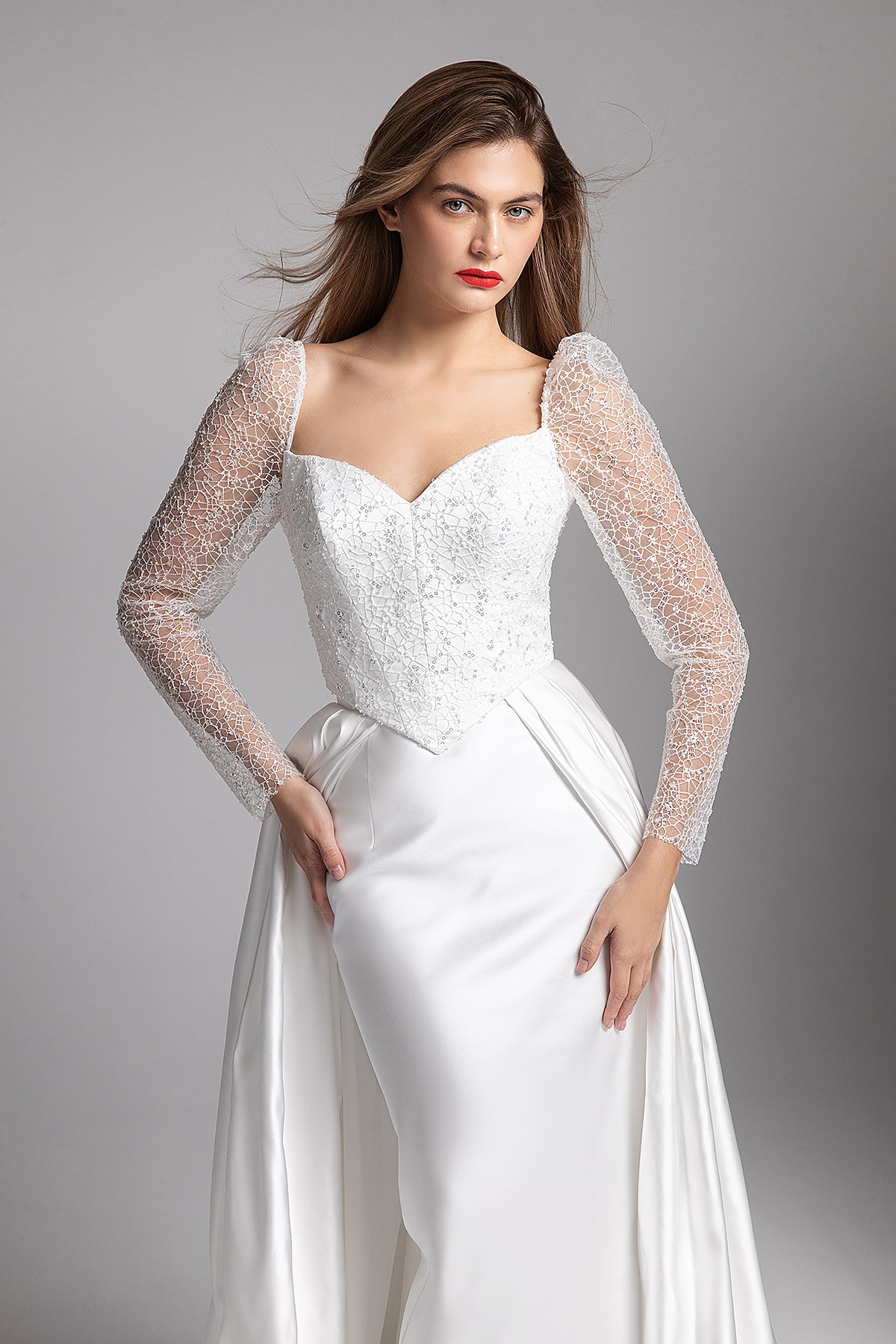 The Charlotte set is all about that retro vibe. It's got thissatin corset with embossing and shimmery lace down the front. The sleeves are long and gathered at the shoulders, and the back is laced up with see-through lace straps and a button closure. The skirt is a sleek pencil style in satin with an A-line detachable skirt with a train.