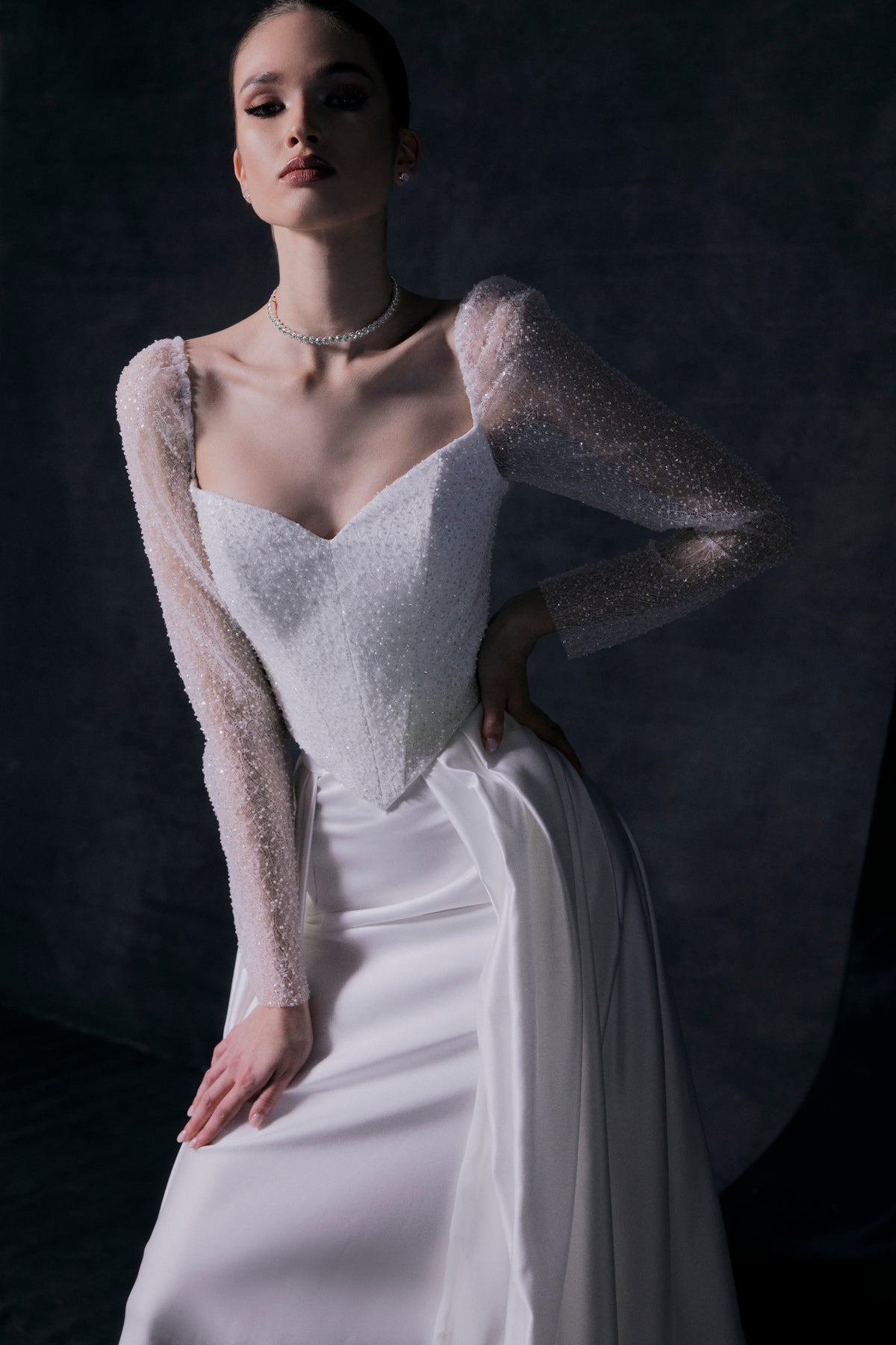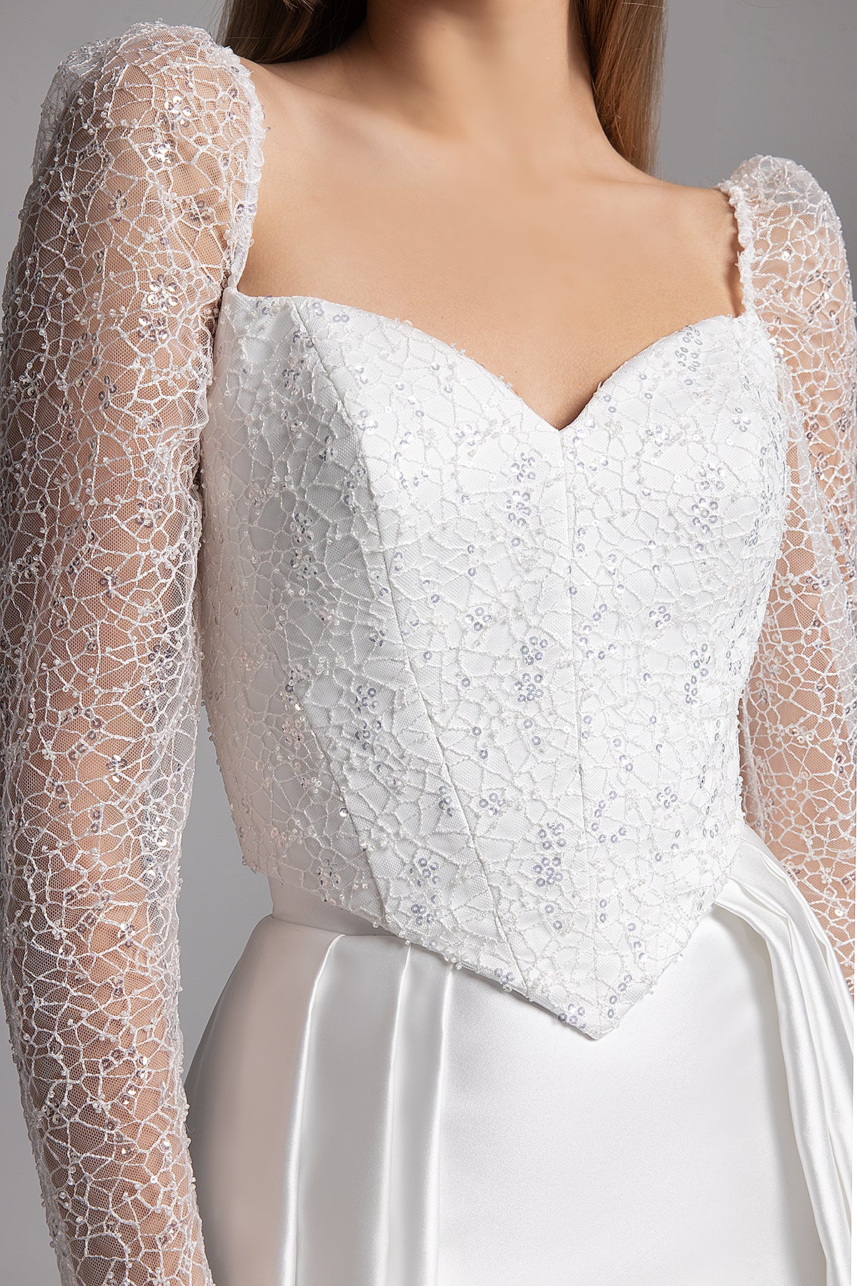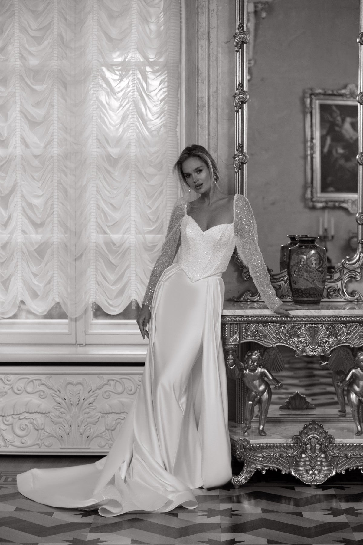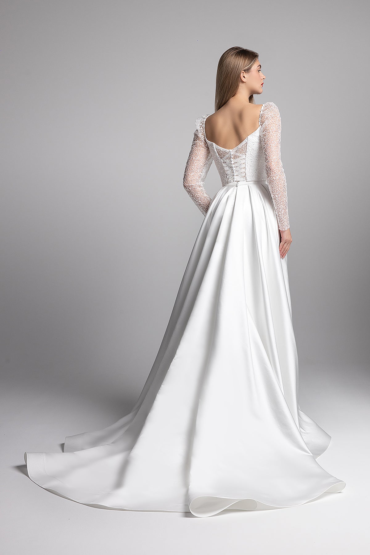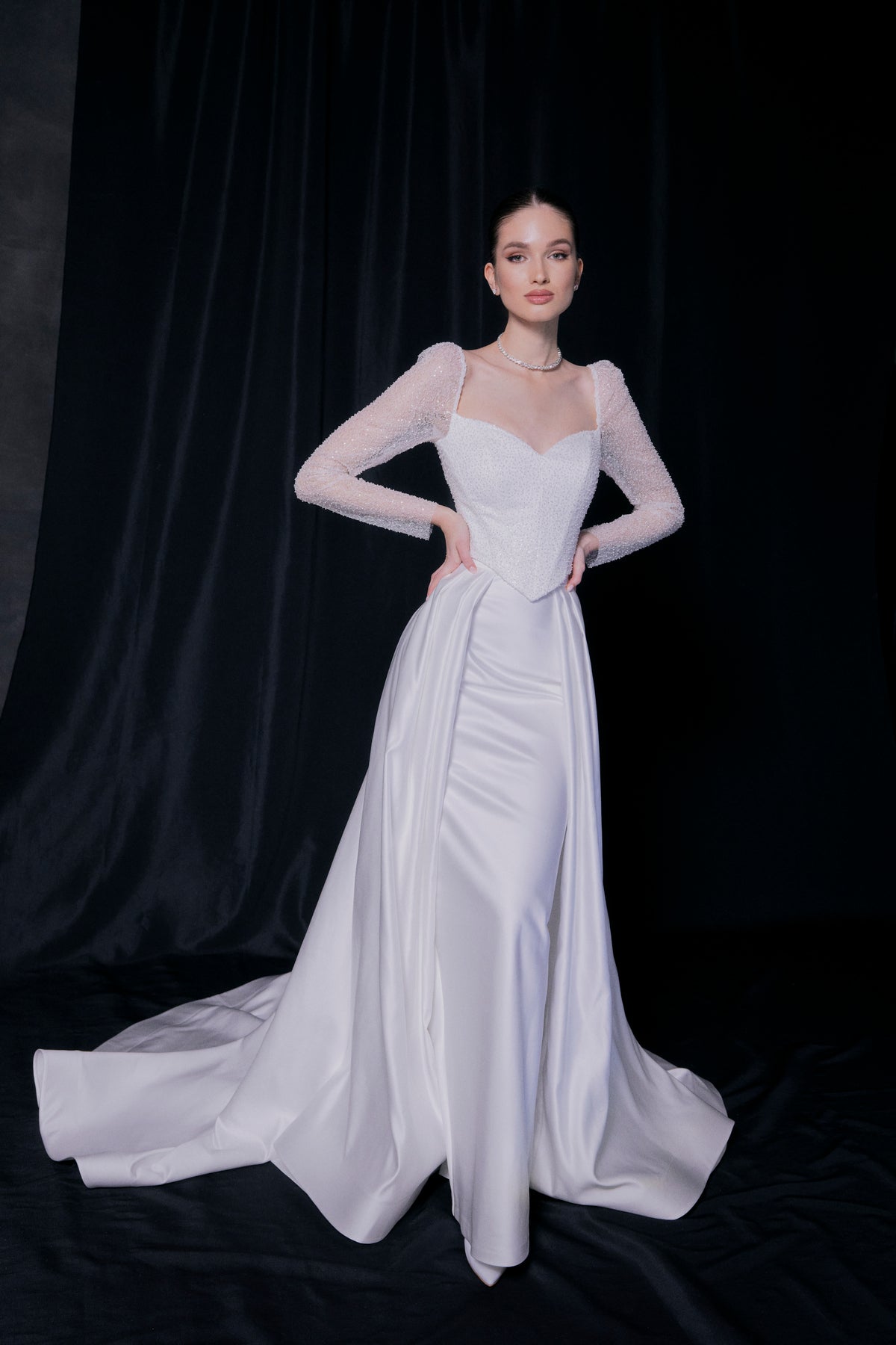 The Charlotte set is all about that retro vibe. It's got thissatin corset with embossing and shimmery lace down the front. The sleeves are long and gathered at the shoulders, and the back is laced up with see-through lace straps and a button closure. The skirt is a sleek pencil style in satin with an A-line detachable skirt with a train.
