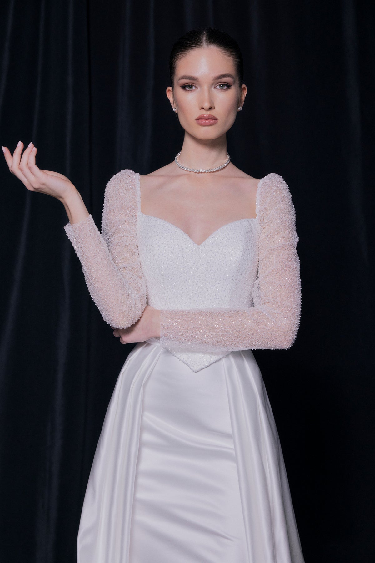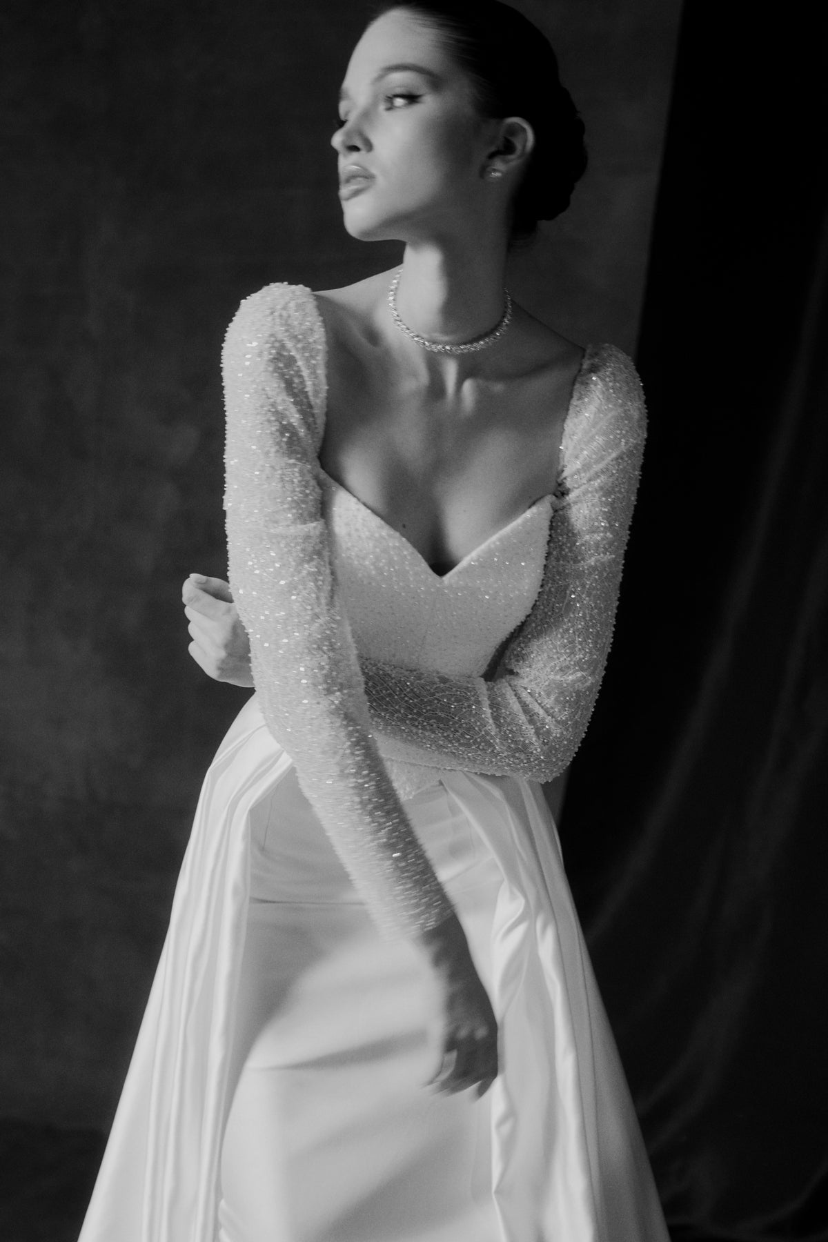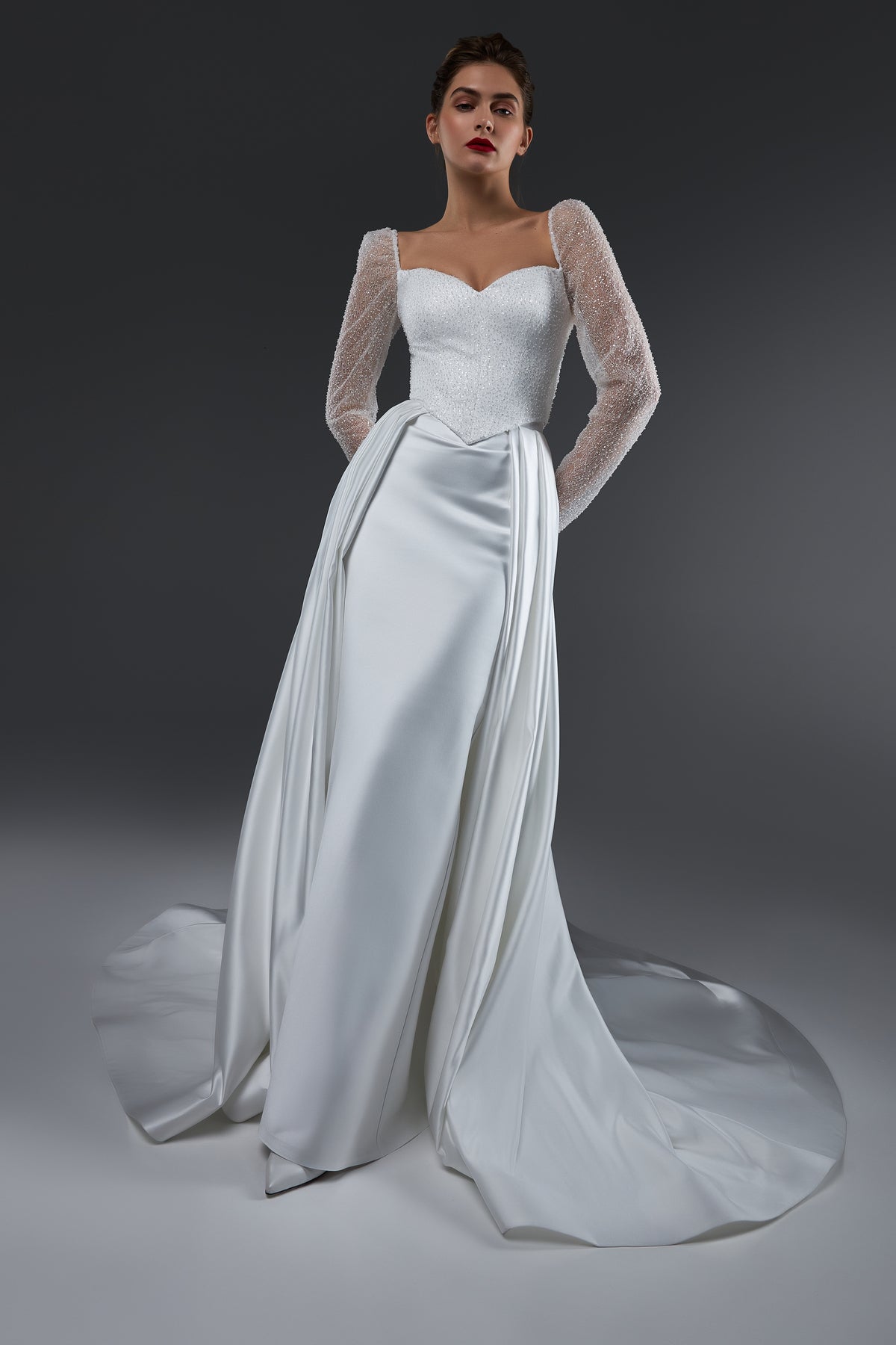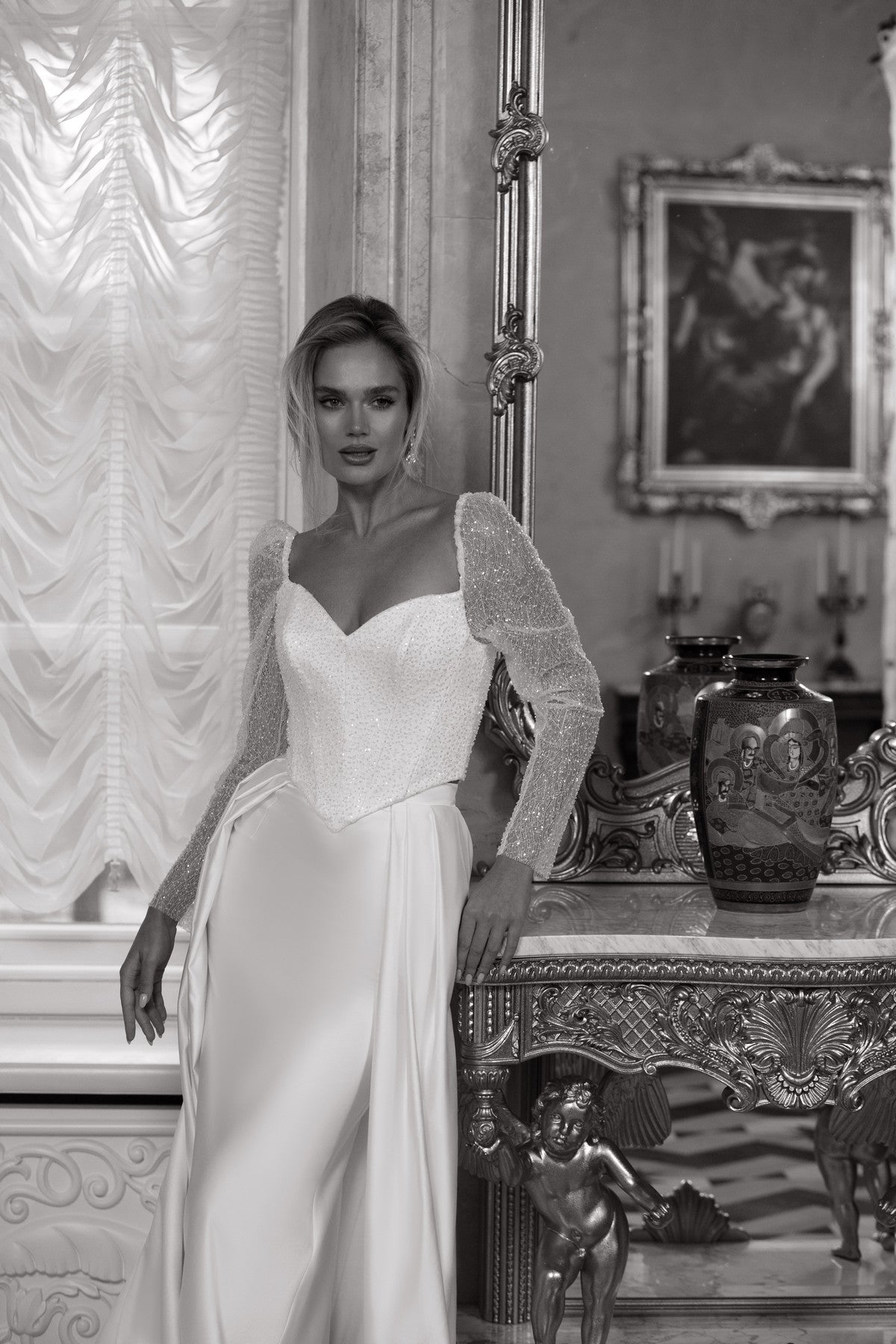 The Charlotte set is all about that retro vibe. It's got thissatin corset with embossing and shimmery lace down the front. The sleeves are long and gathered at the shoulders, and the back is laced up with see-through lace straps and a button closure. The skirt is a sleek pencil style in satin with an A-line detachable skirt with a train.