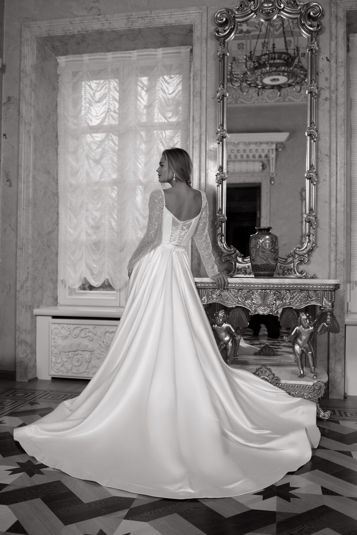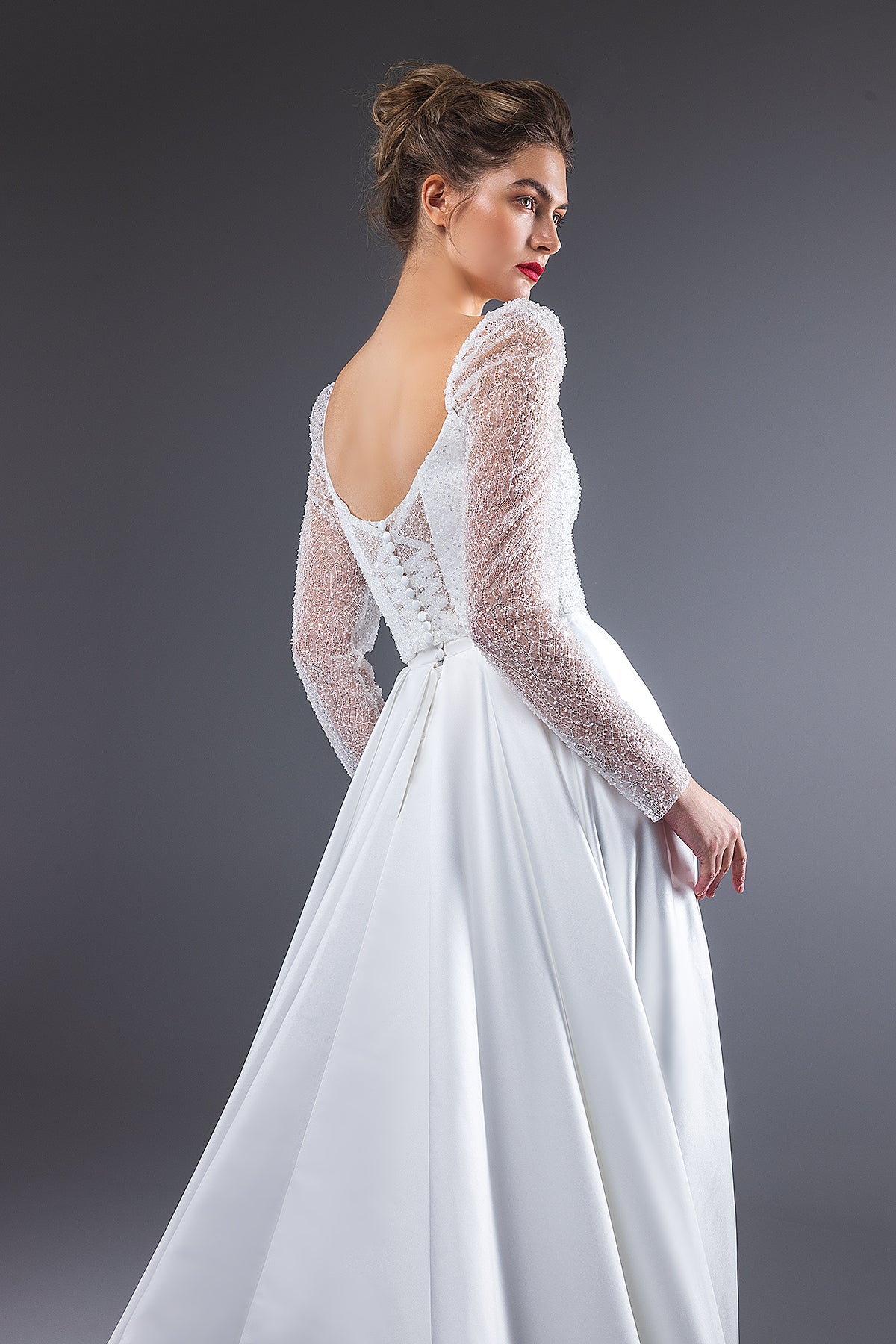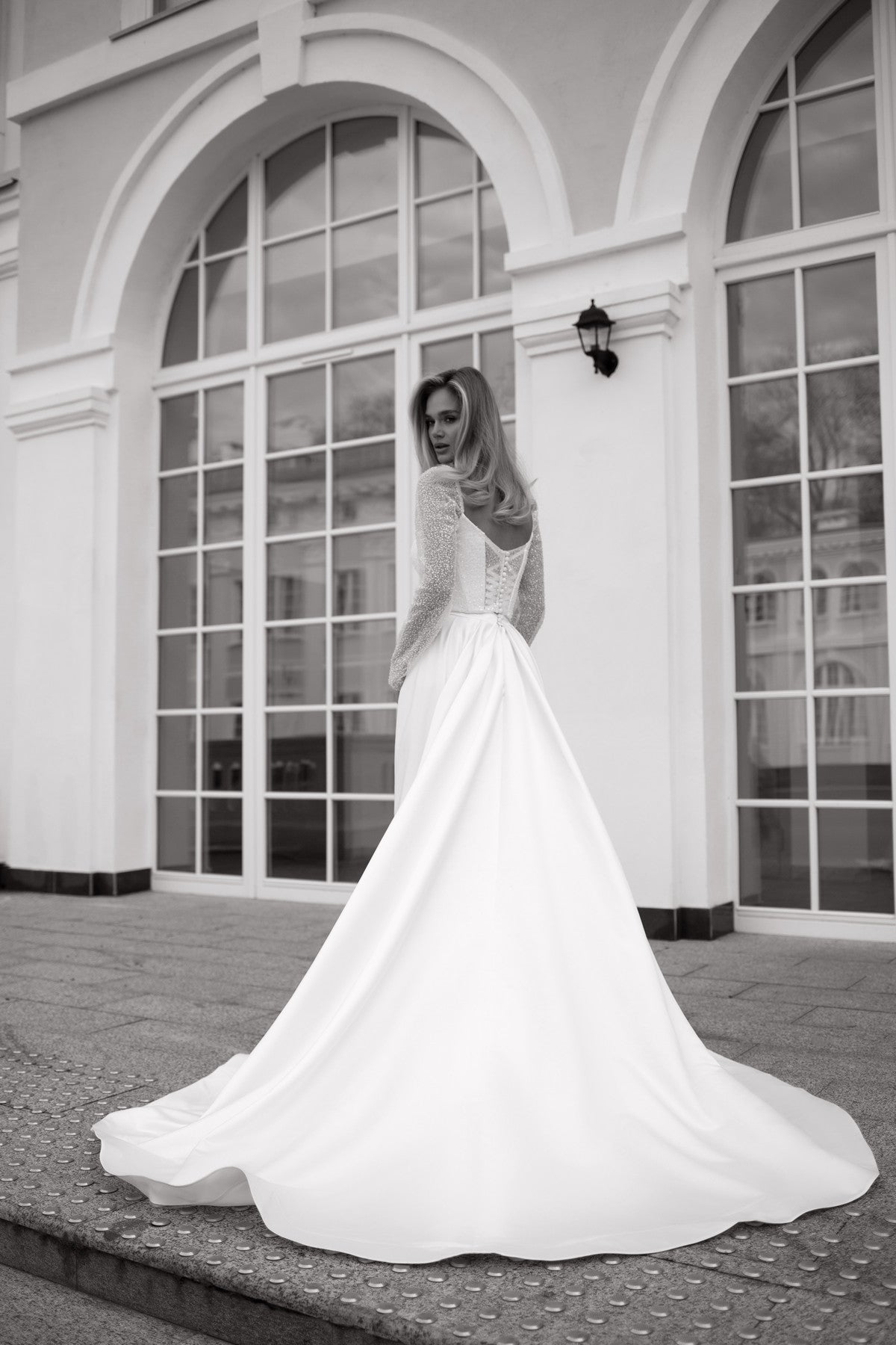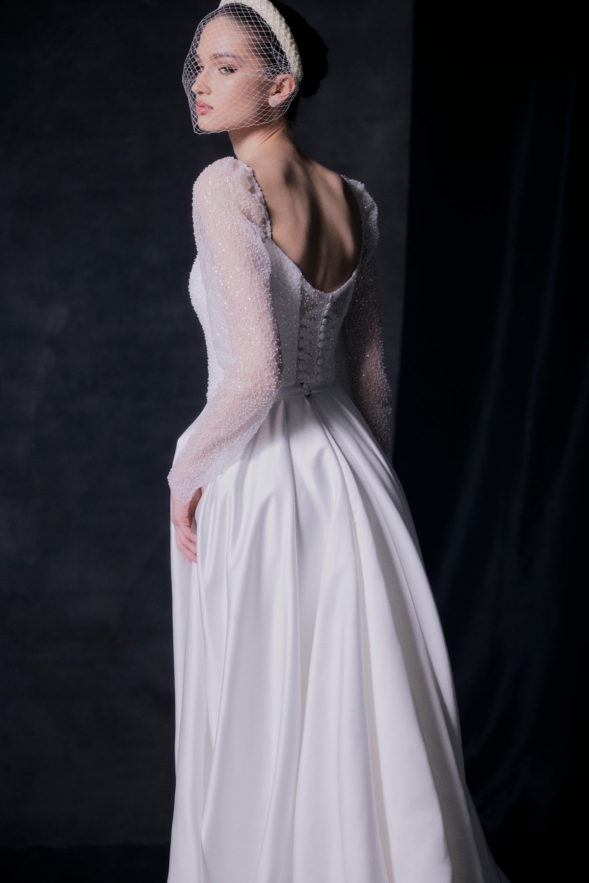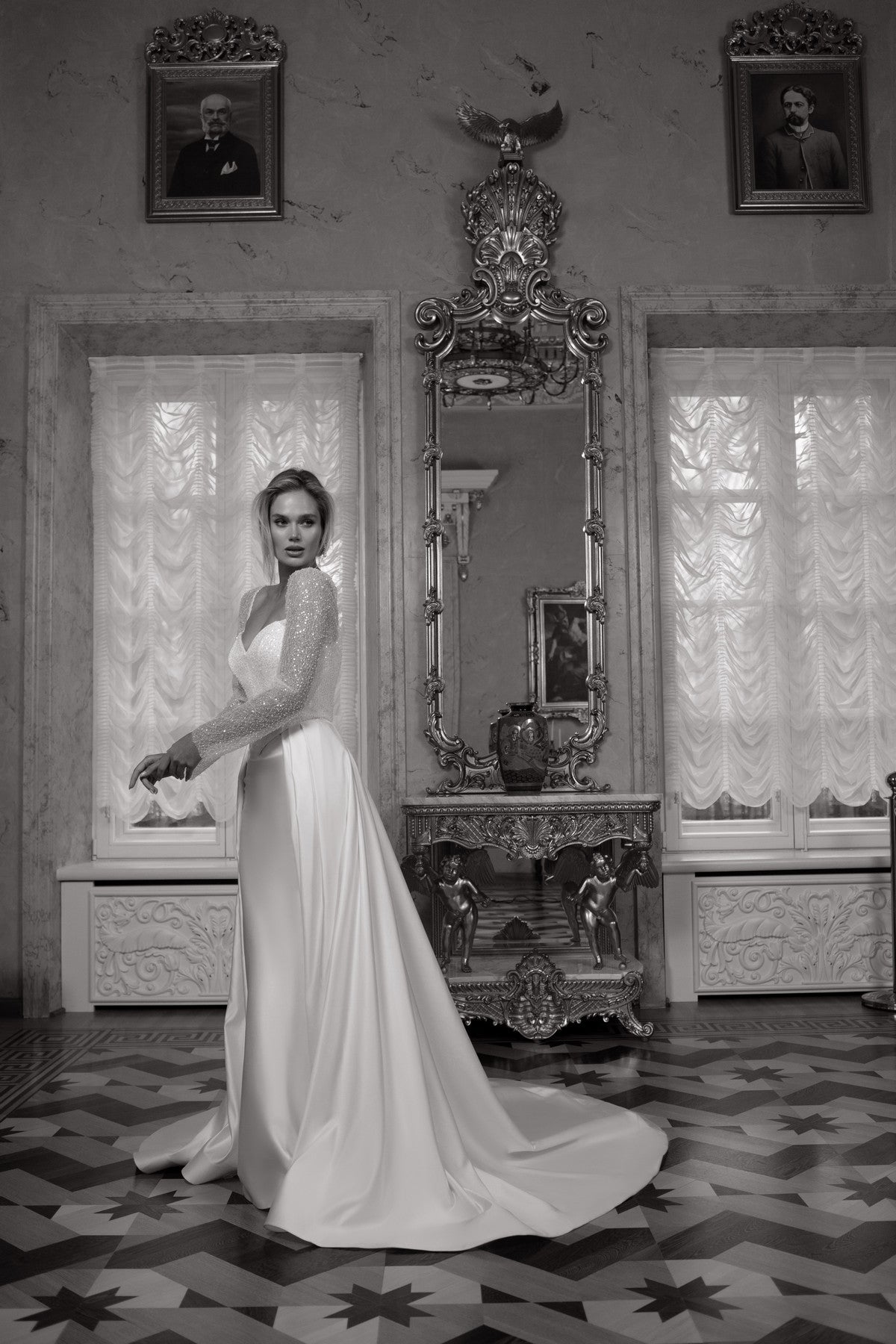 The Charlotte set is all about that retro vibe. It's got thissatin corset with embossing and shimmery lace down the front. The sleeves are long and gathered at the shoulders, and the back is laced up with see-through lace straps and a button closure. The skirt is a sleek pencil style in satin with an A-line detachable skirt with a train.