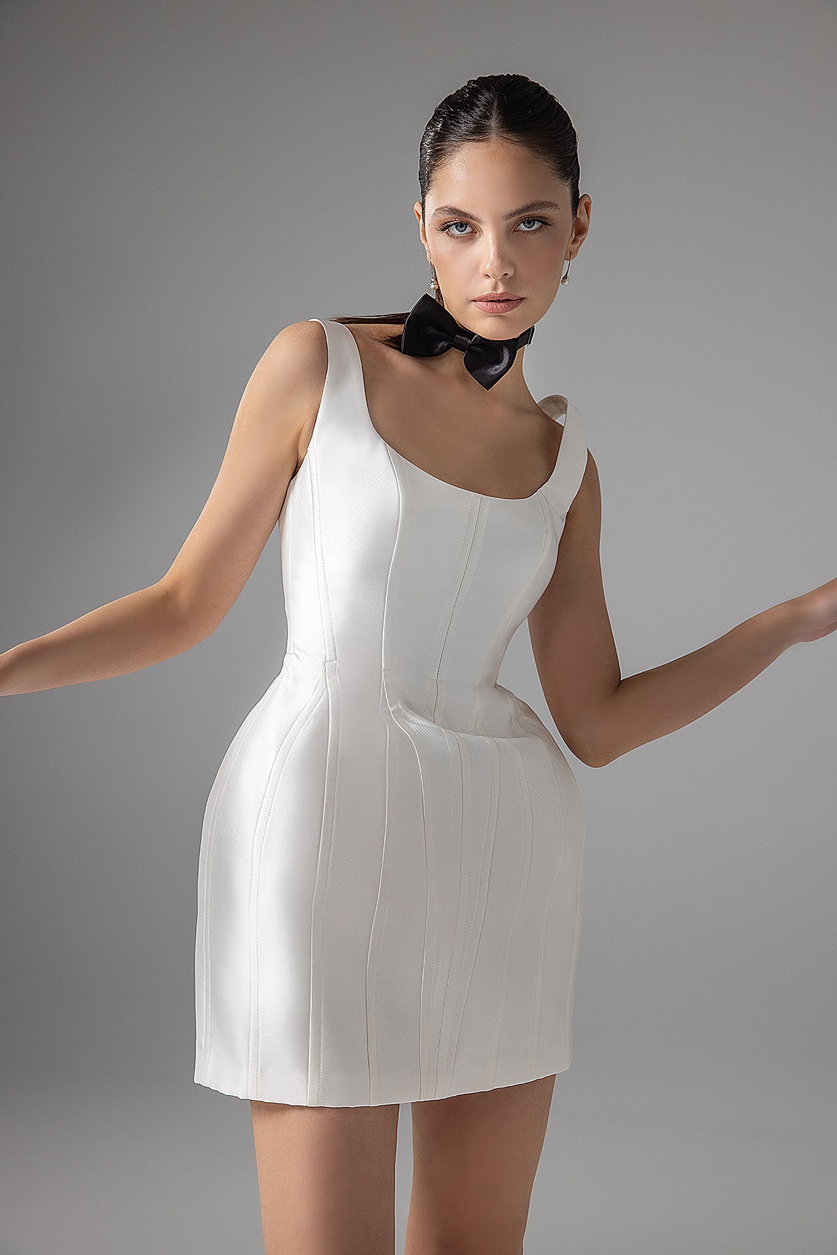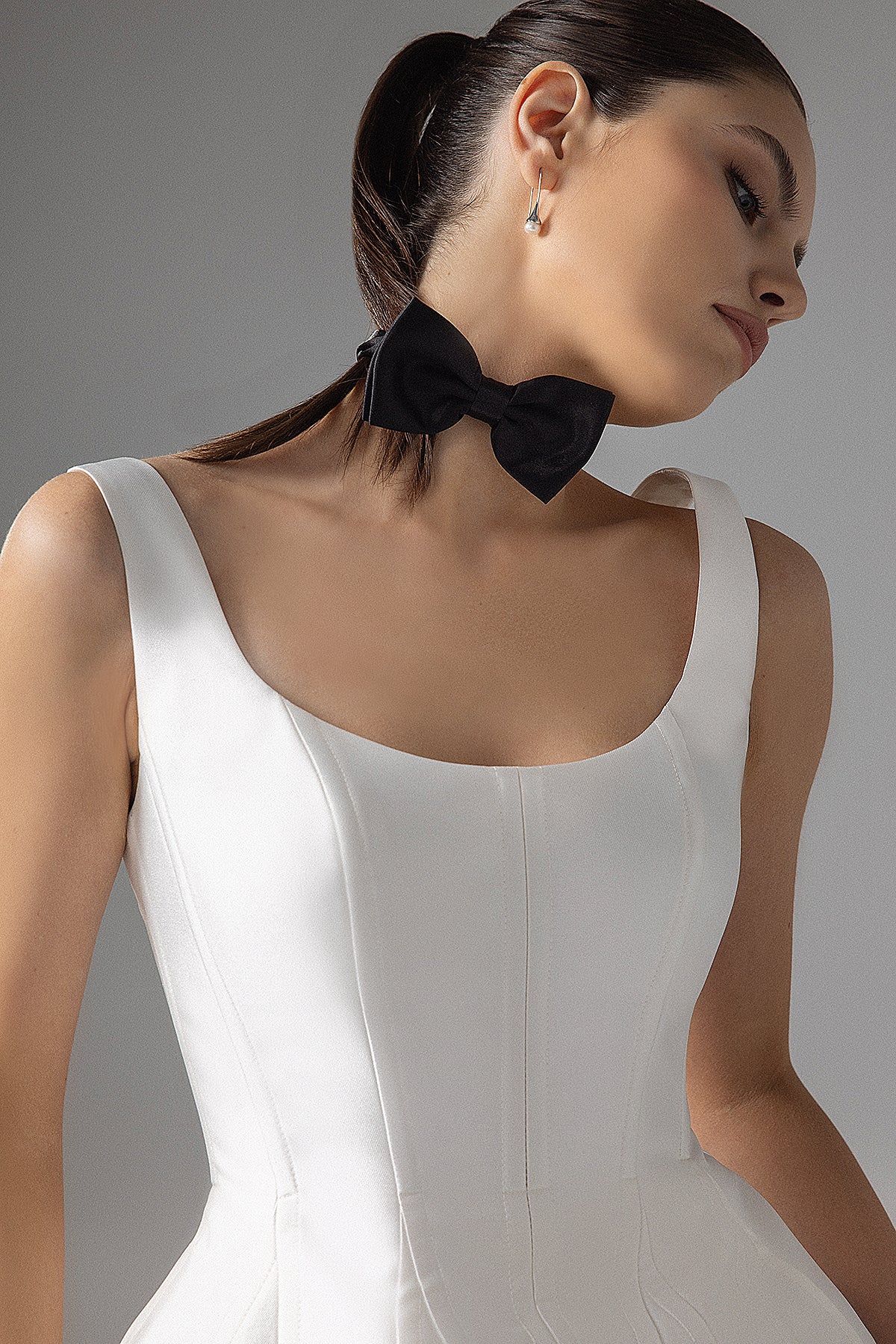 A cute little wedding dress made from mikado fabric that has a luminous finish. It has a hidden corset for extra support and a playful, bubble skirt for a fun touch. You can pair it with our Bella bow or Harper train for a two-in-one look.
