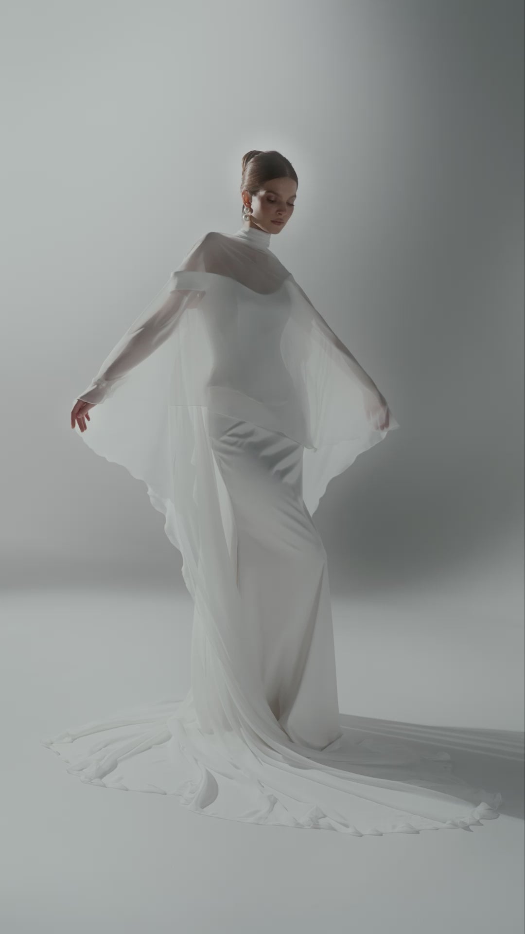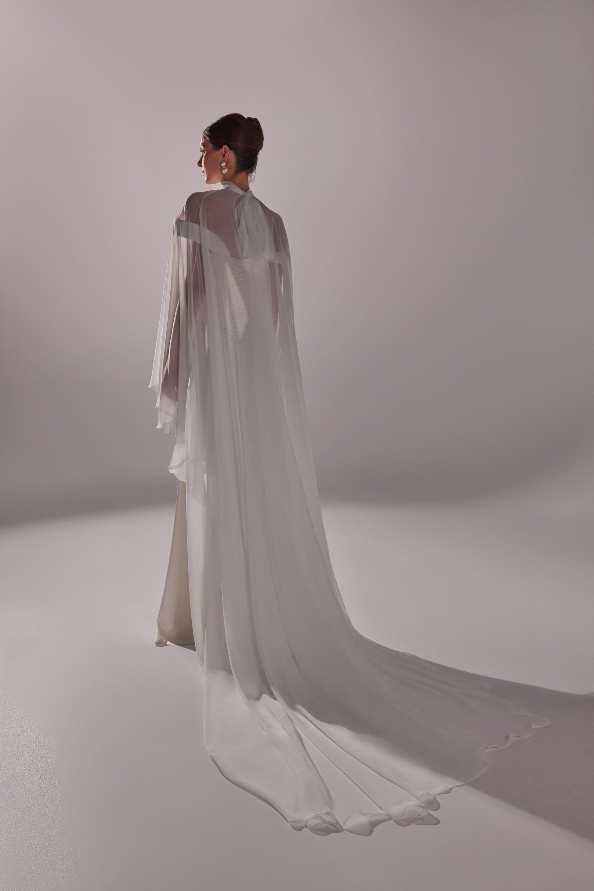 A contemporary chiffon cape with a long train, it is a simple alternative to a veil, providing a modern accessory and transformation for the bride. Enhance your wedding dress with our cape for a more striking effect. It effortlessly complements our wedding gowns, allowing you to find your ideal dress and create a unique look.