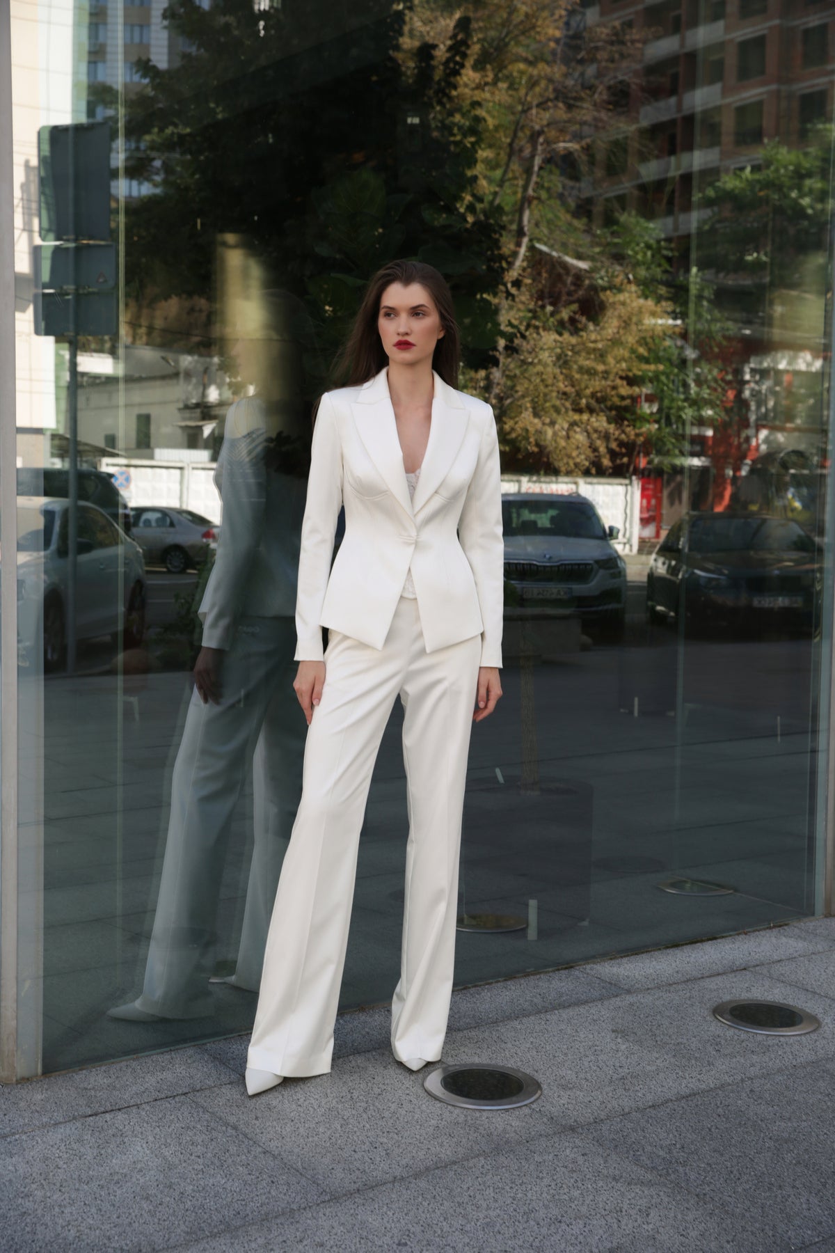 Wedding suits for women are on the rise. Tailoring has taken over women's clothing in the past few years, creeping into dress codes everywhere, from offices to dinner parties. Made from luxurious stretch satin, this set includes gently-flared pants and a sculpted one-button blazer with statement details. A lace drop waist corset completes the look - it's a great investment that will be worth every penny!
