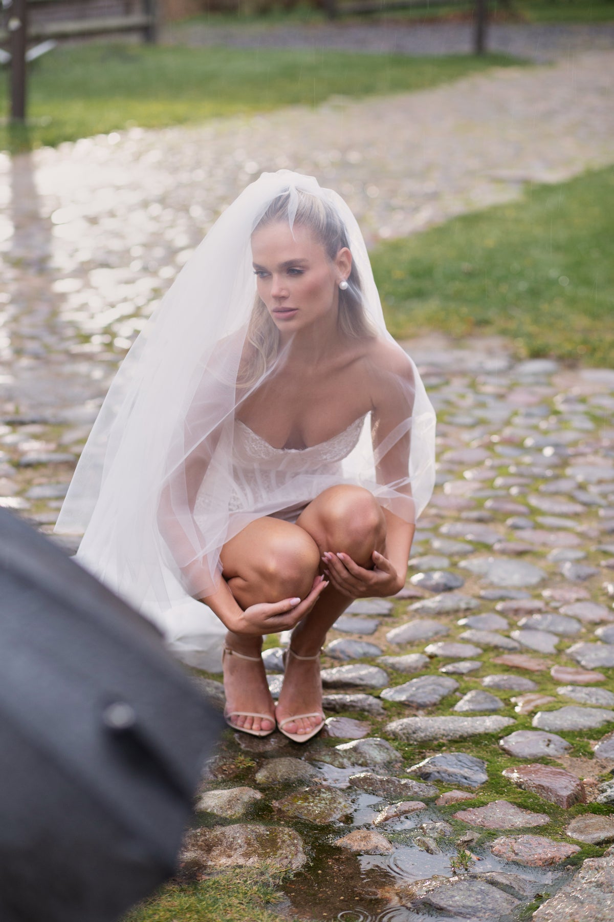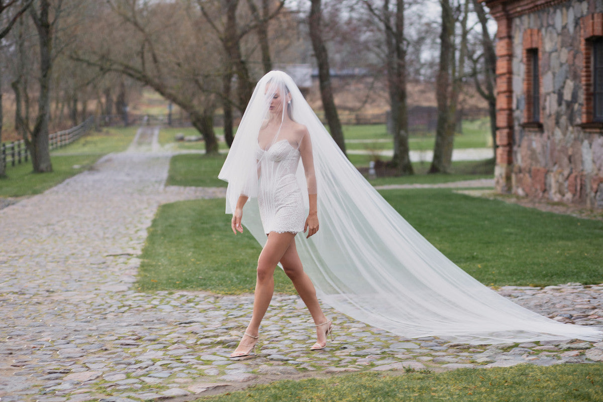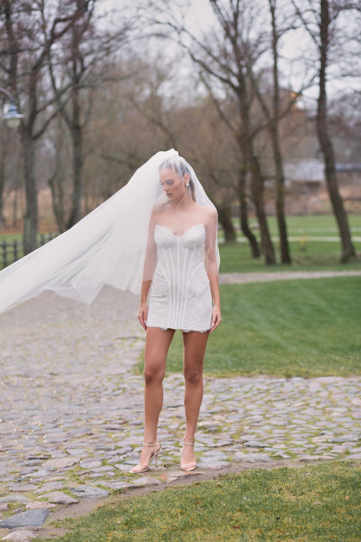 This mini dress in bridal style with a corset top exudes so much romantic charm, with all that delicate lace! The strapless top really shows off the bride's shoulders and cleavage, and the short length makes it perfect for a spring or summer wedding. This is the perfect dress for someone who wants to look enchanted and feel comfortable at the same time.