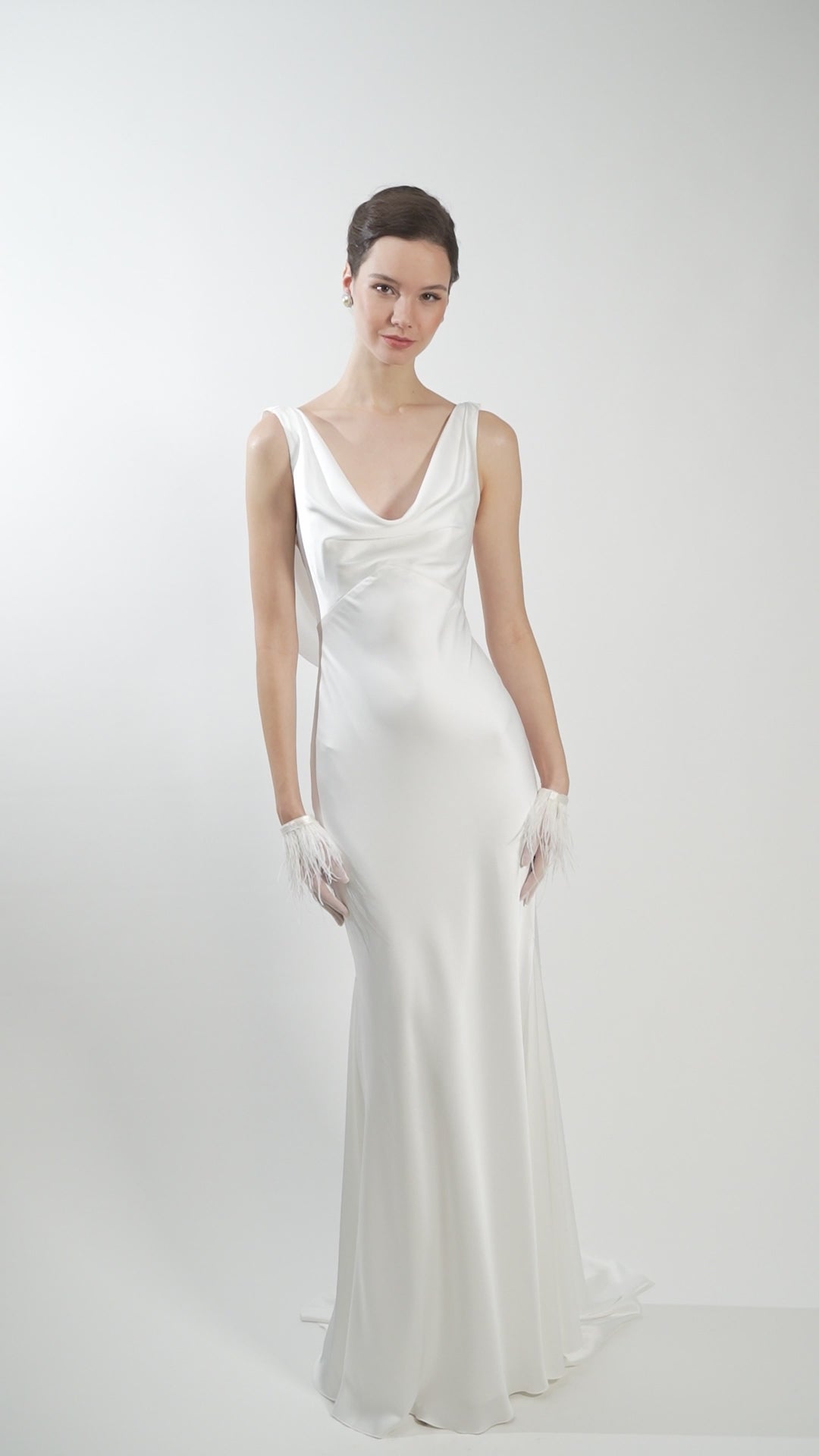 Crafted from luxurious stretch satin, this minimalist wedding dress hugs your figure in a flattering way, then gently flows into a long train, showing off your curves with elegance. Cowl neckline is so soft and romantic, and the wide shoulder straps give it just the right amount of structure and comfort. The back is stunning, with delicate satin draping that creates an ethereal effect and adds drama. Every angle shows off the perfect balance of simplicity and boldness, making this dress truly unforgettable.