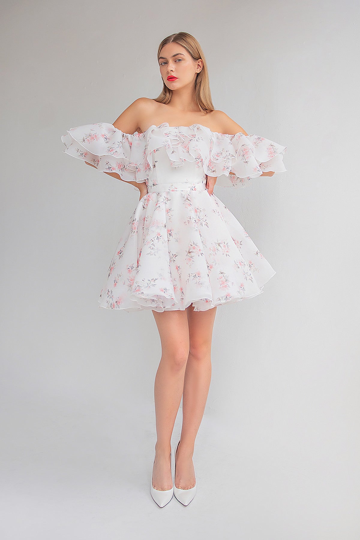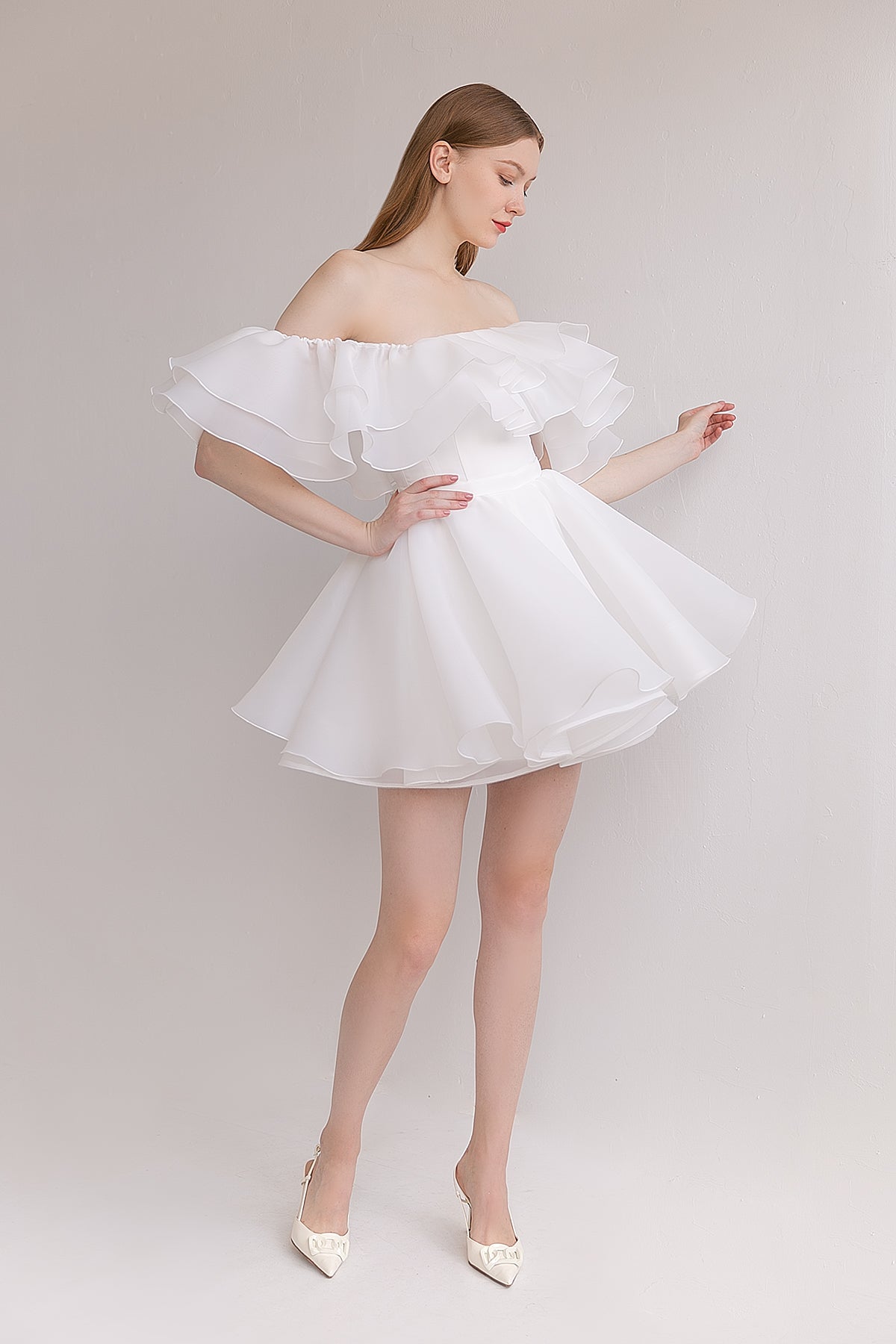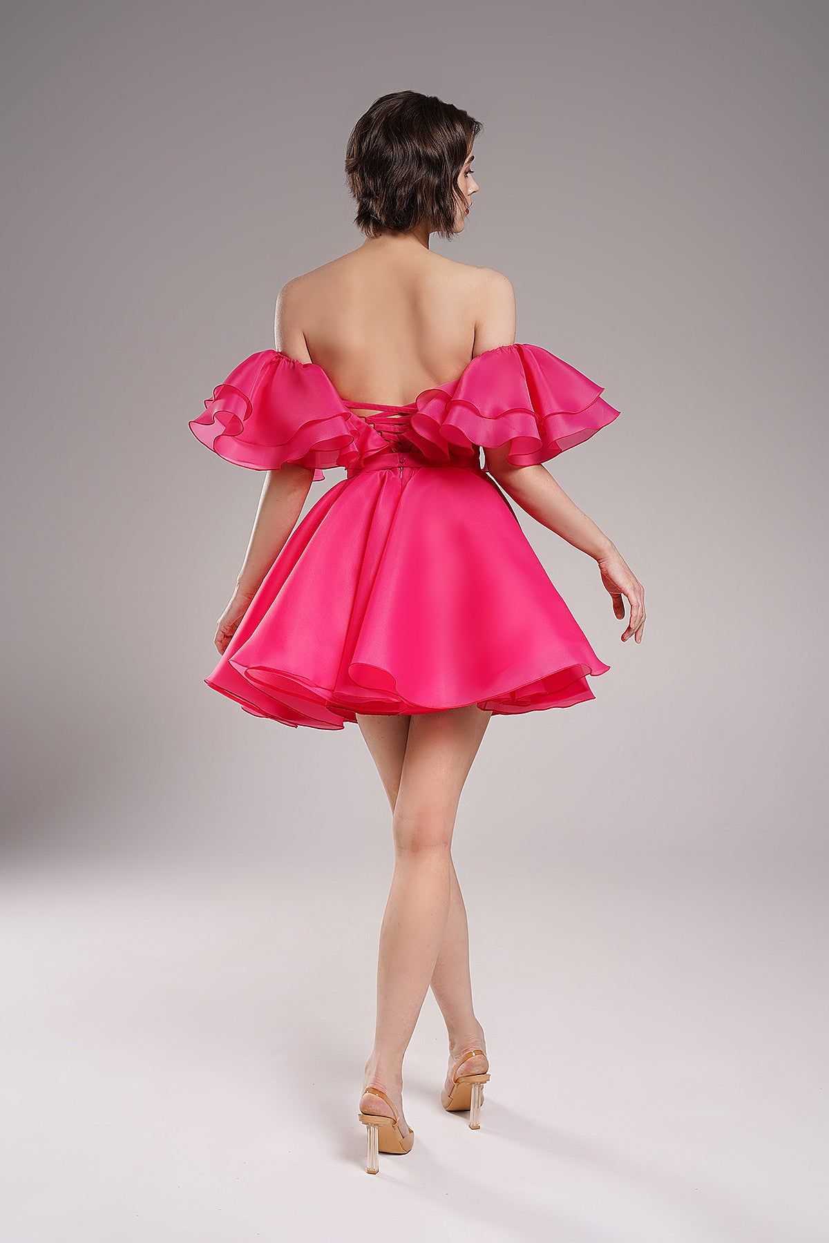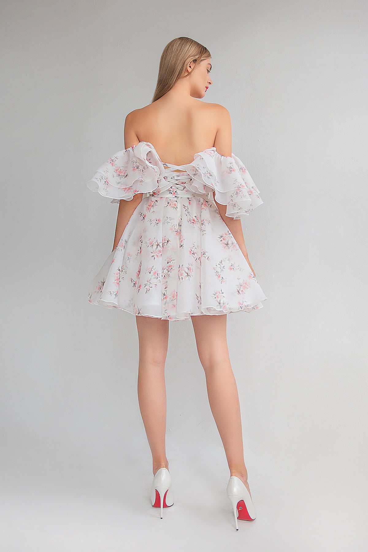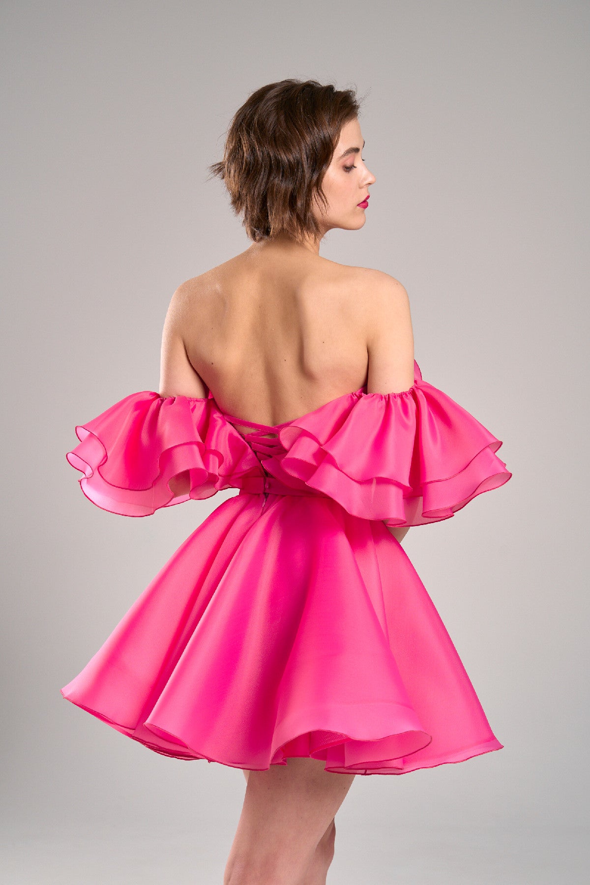 Playful corset mini dress made of organza with open lacing and a full skirt in the Baby Doll style. There are flounces along the edges of the corset, creating flowing sleeves that fall off the shoulders.