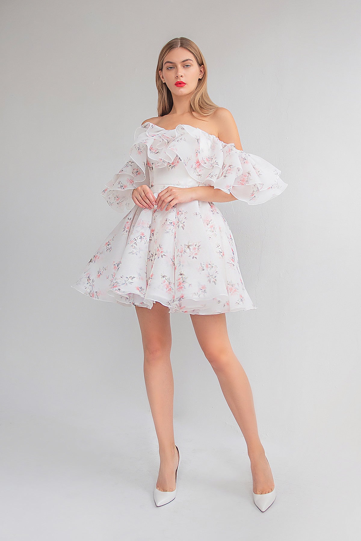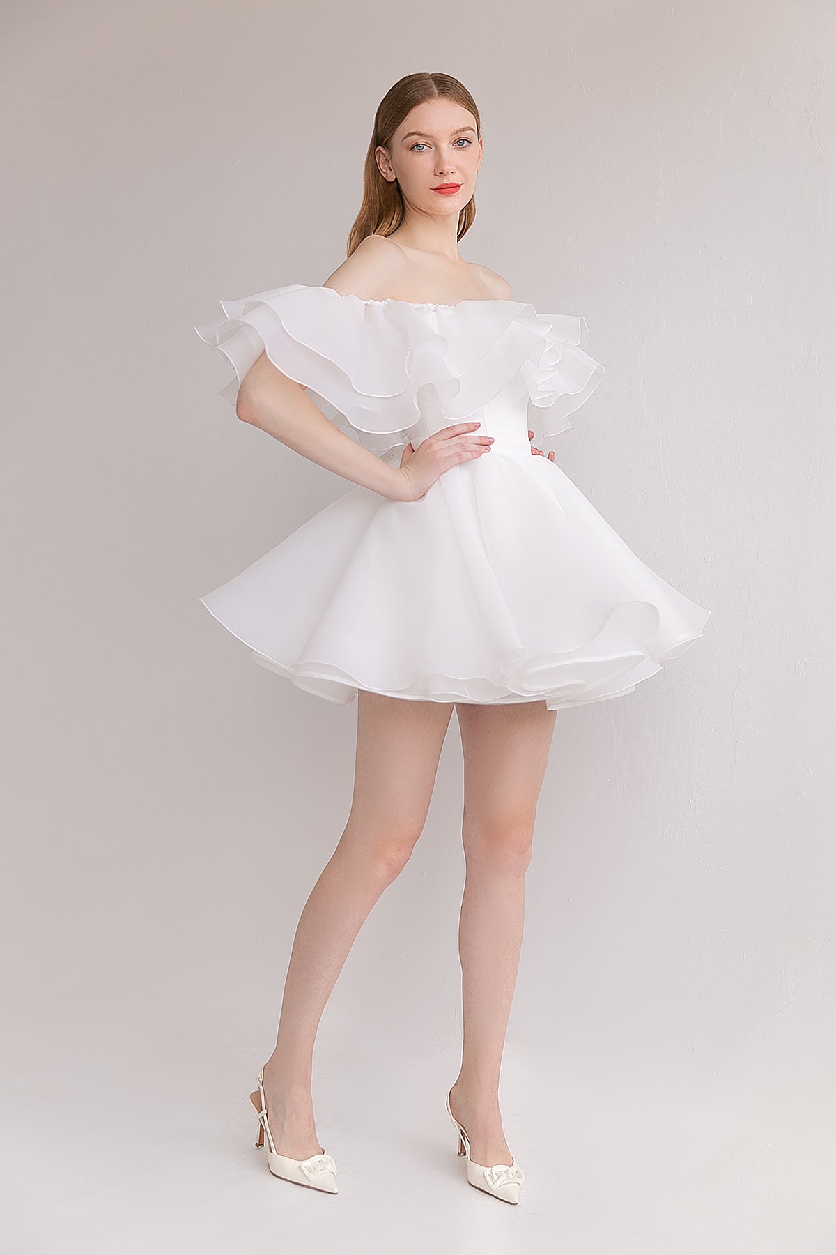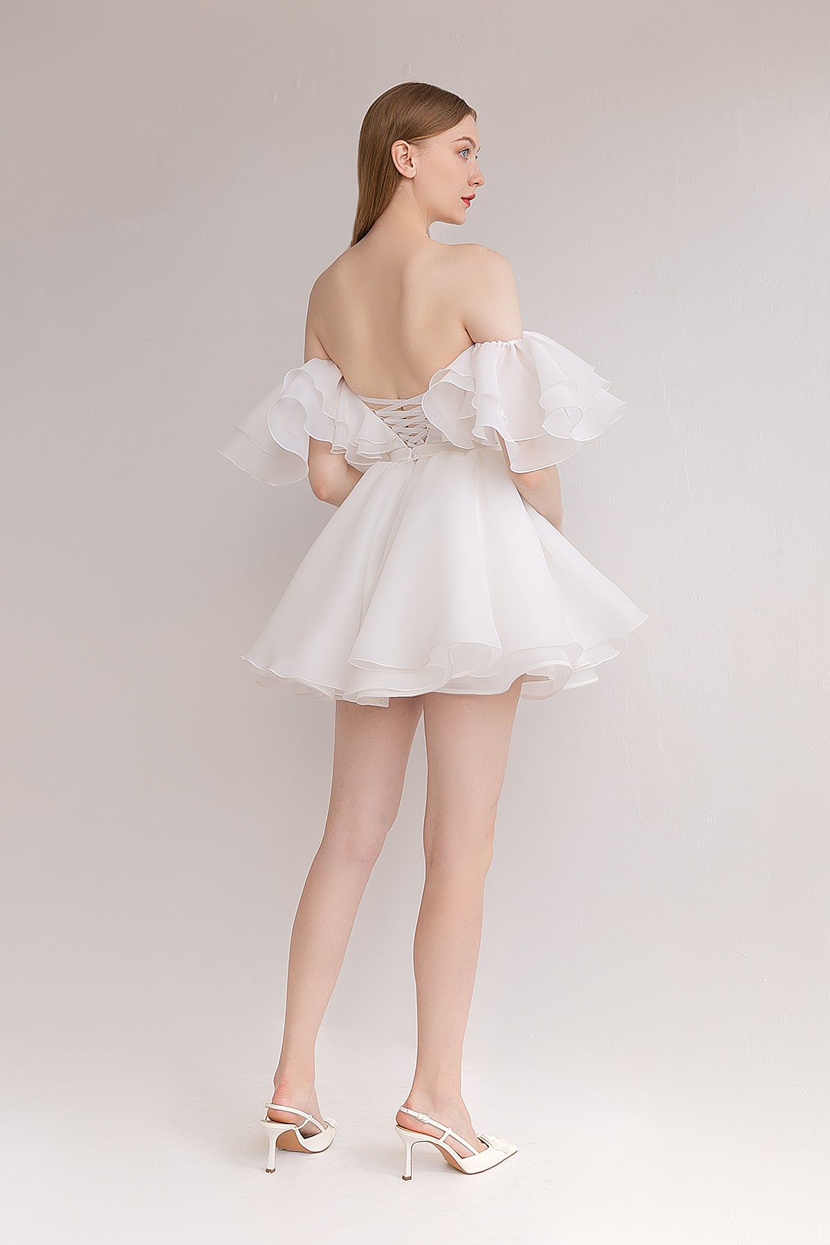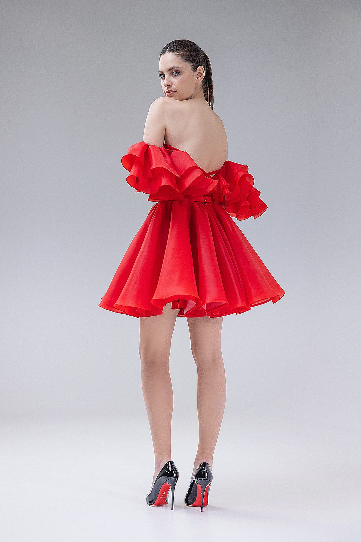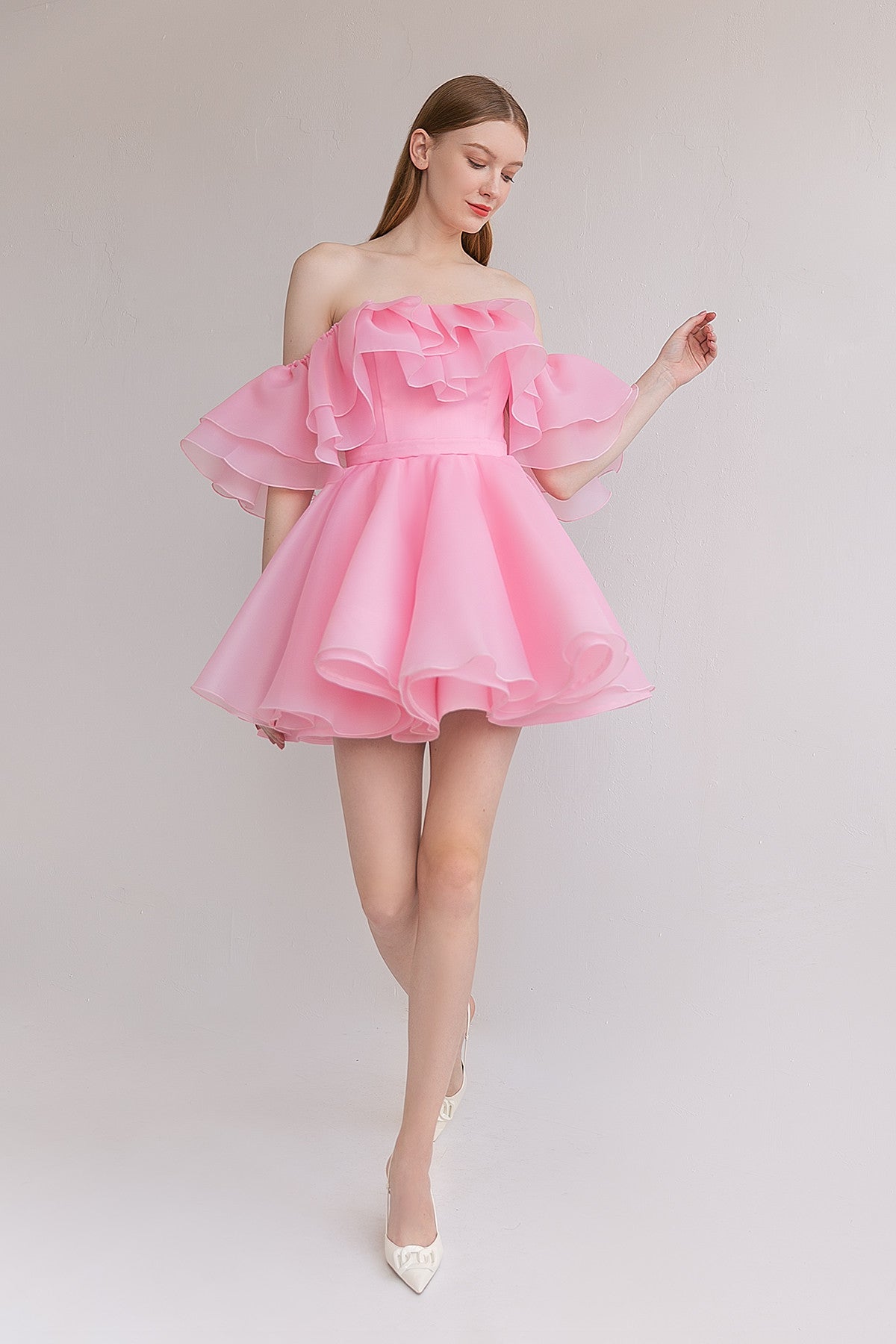 Playful corset mini dress made of organza with open lacing and a full skirt in the Baby Doll style. There are flounces along the edges of the corset, creating flowing sleeves that fall off the shoulders.