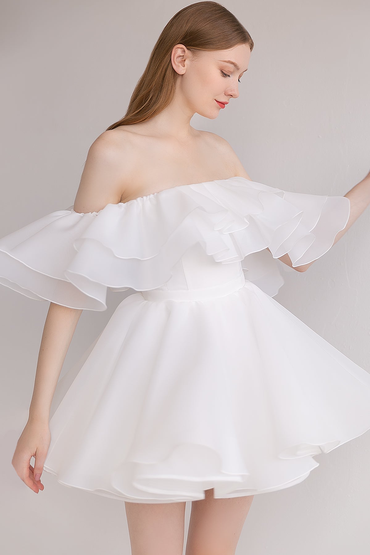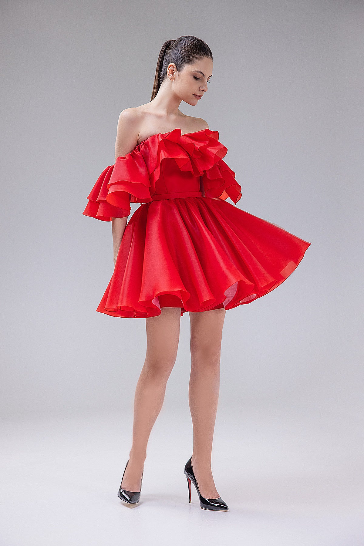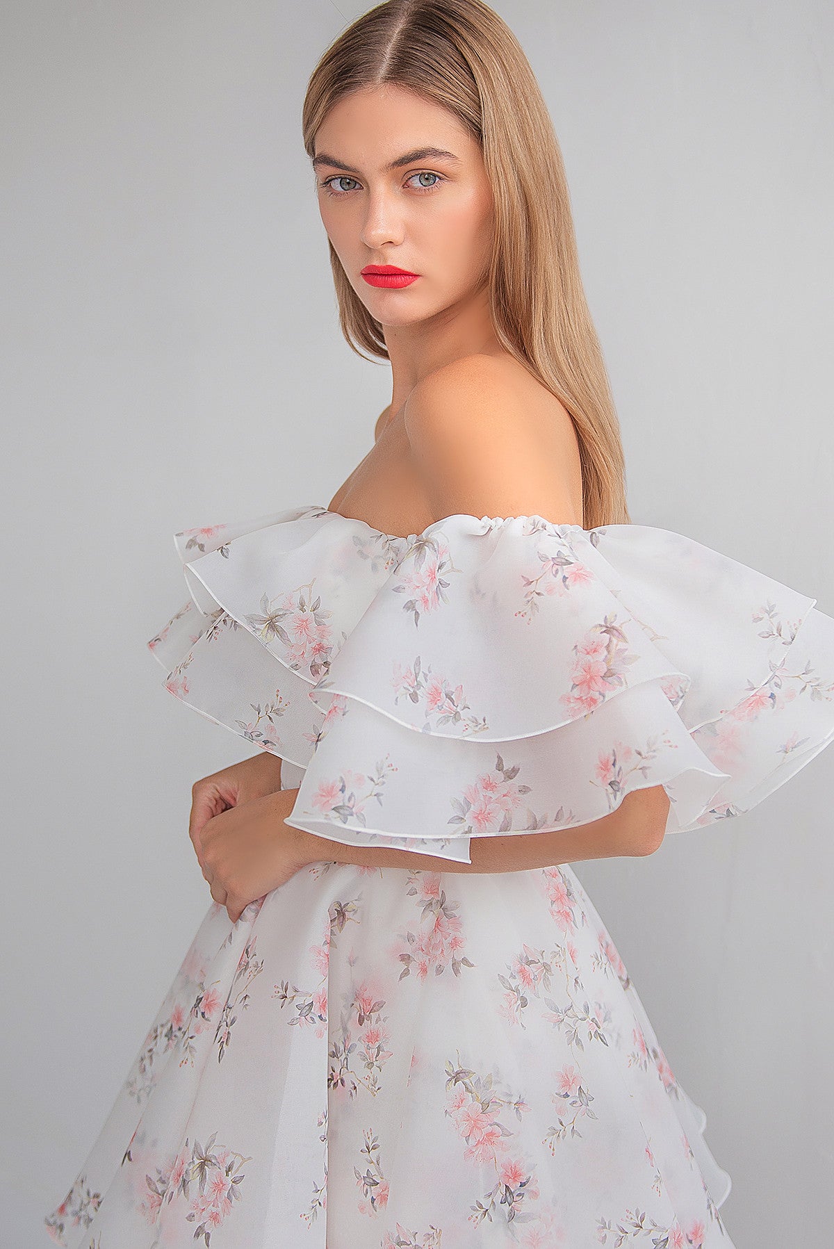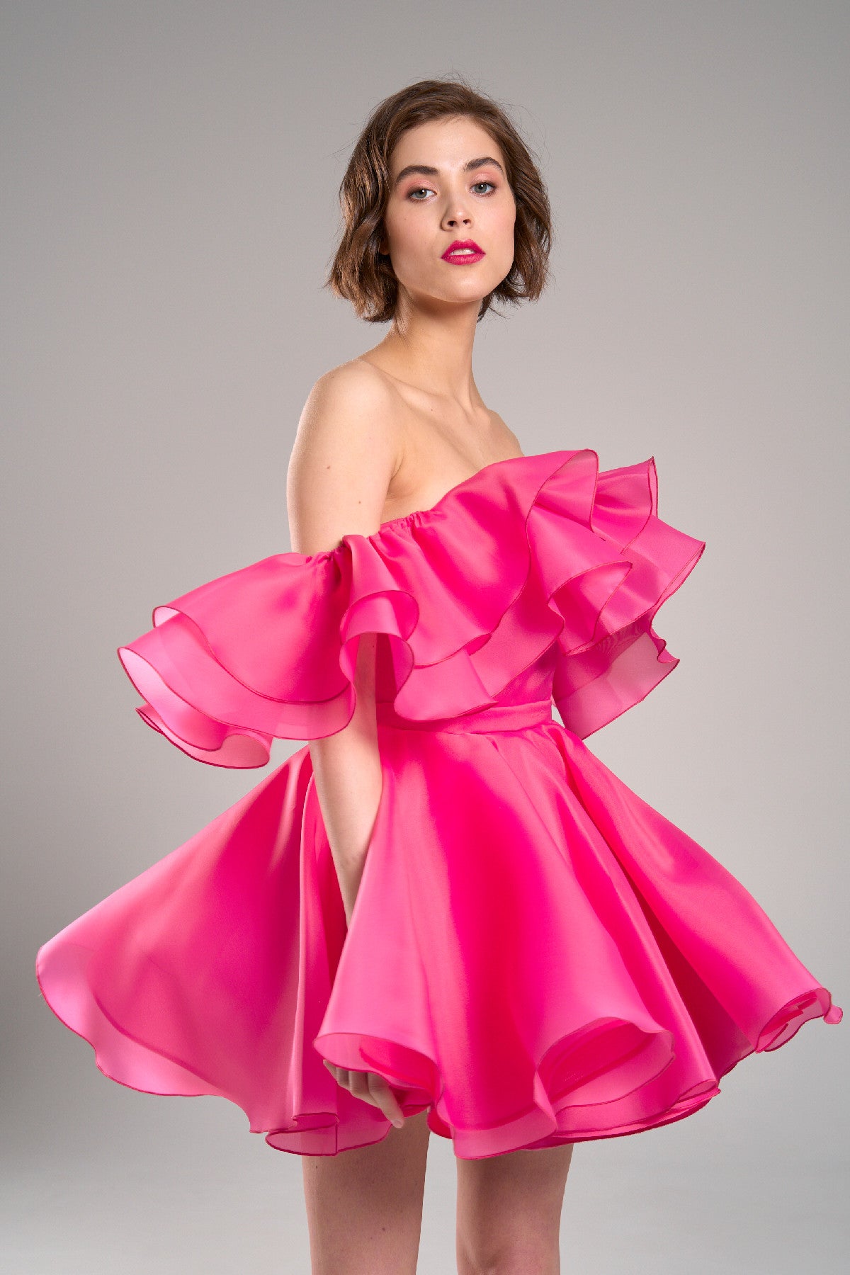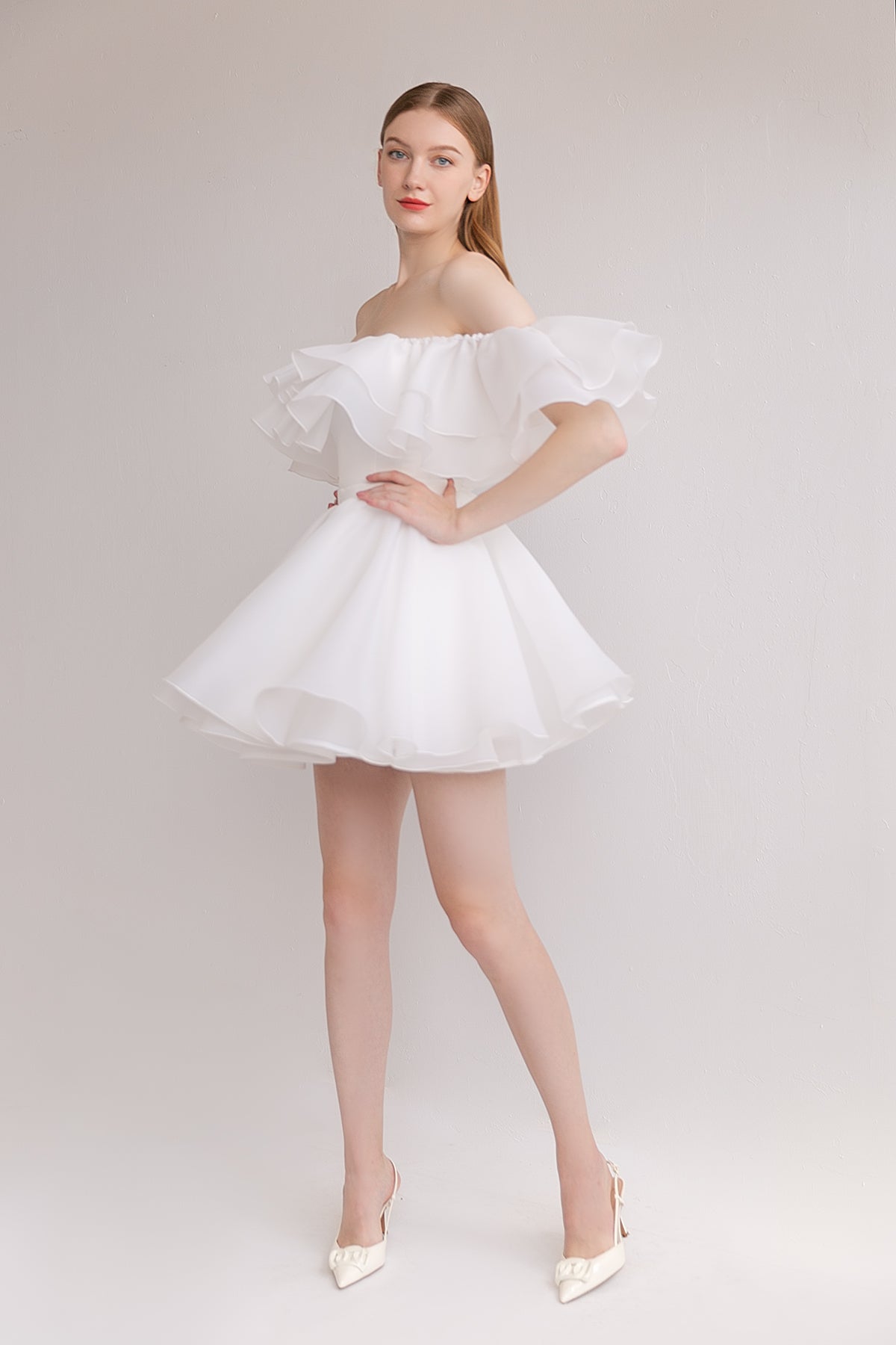 Playful corset mini dress made of organza with open lacing and a full skirt in the Baby Doll style. There are flounces along the edges of the corset, creating flowing sleeves that fall off the shoulders.