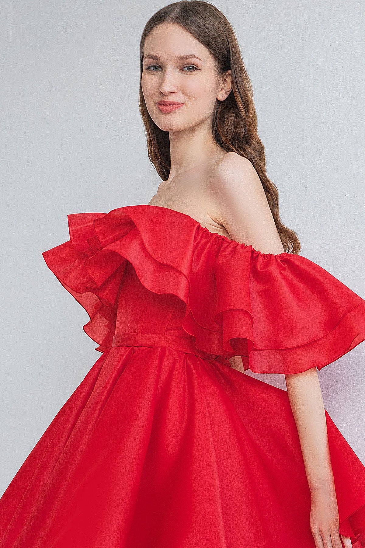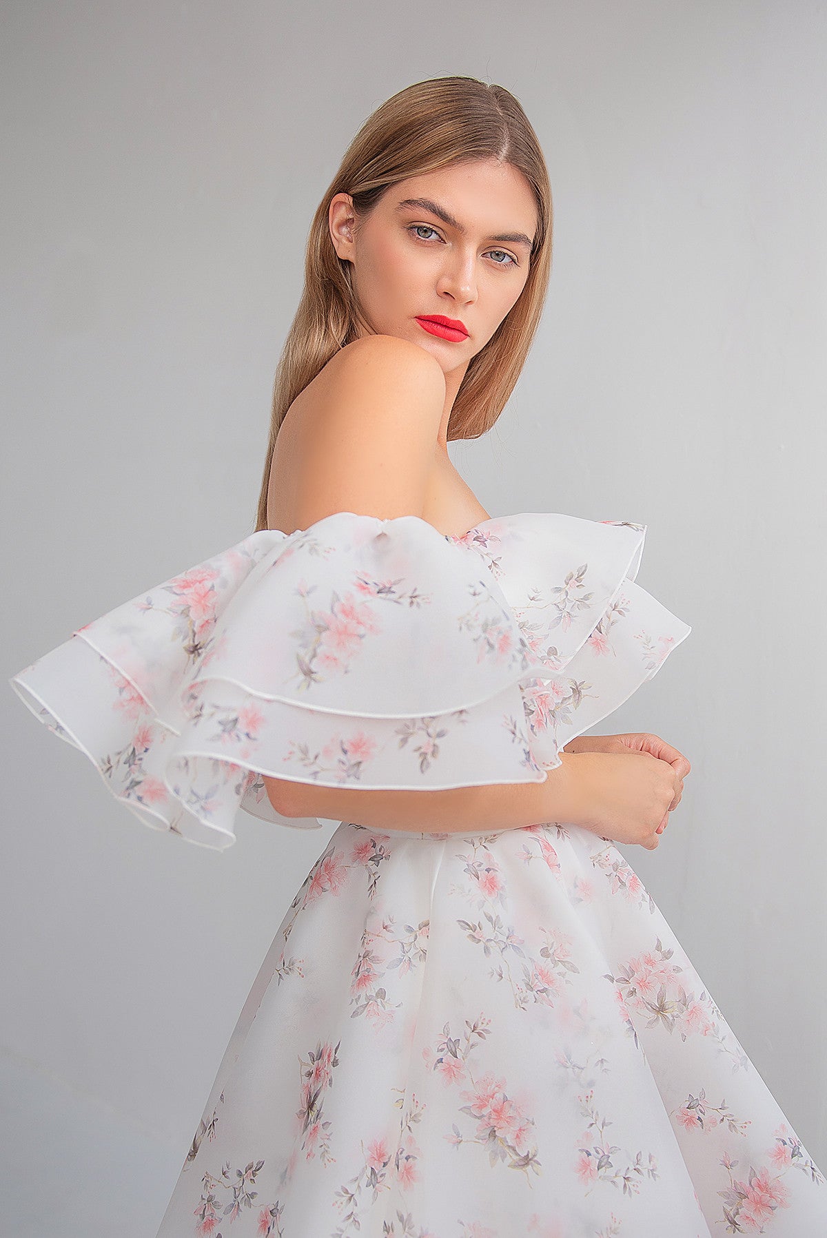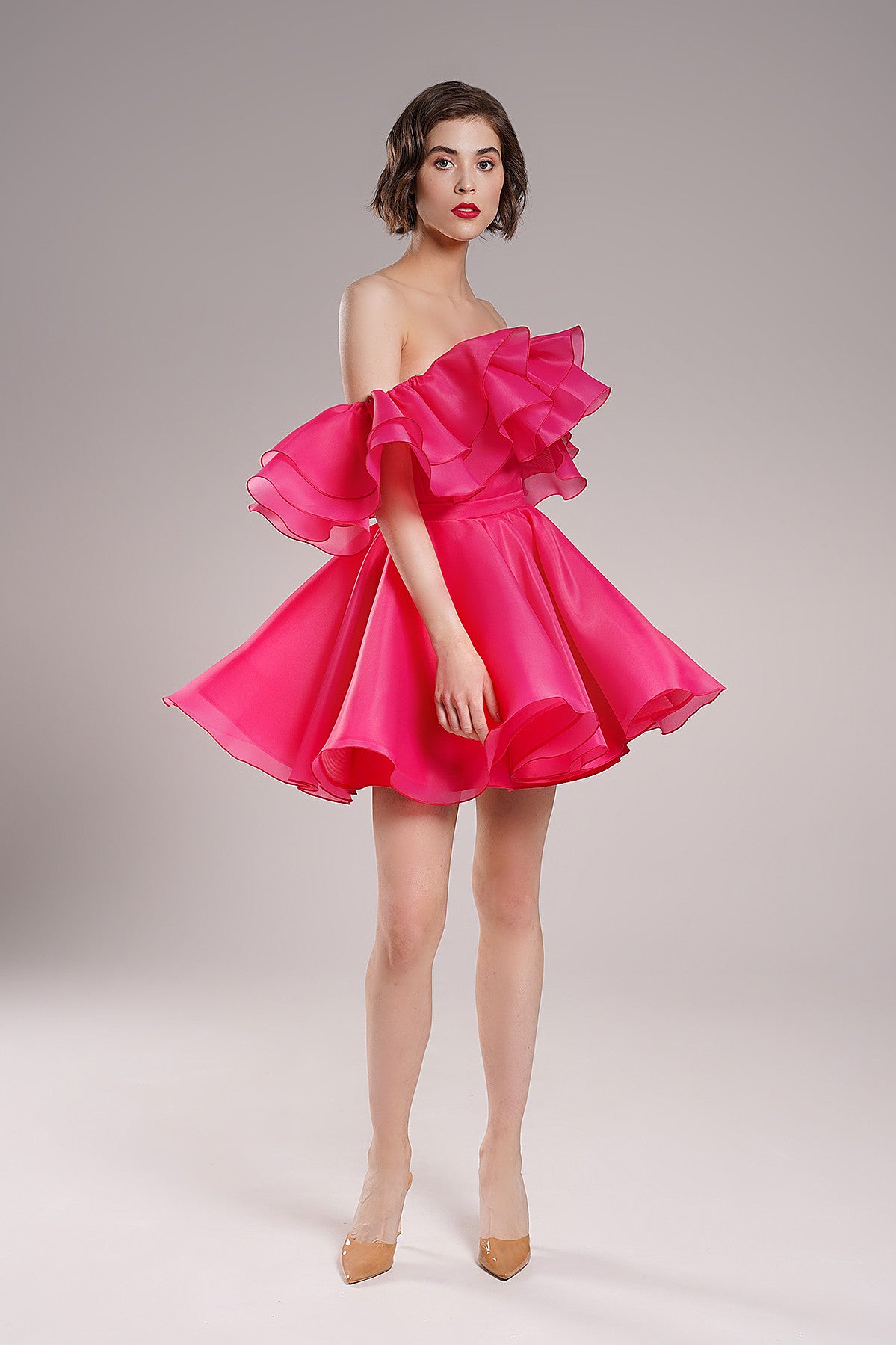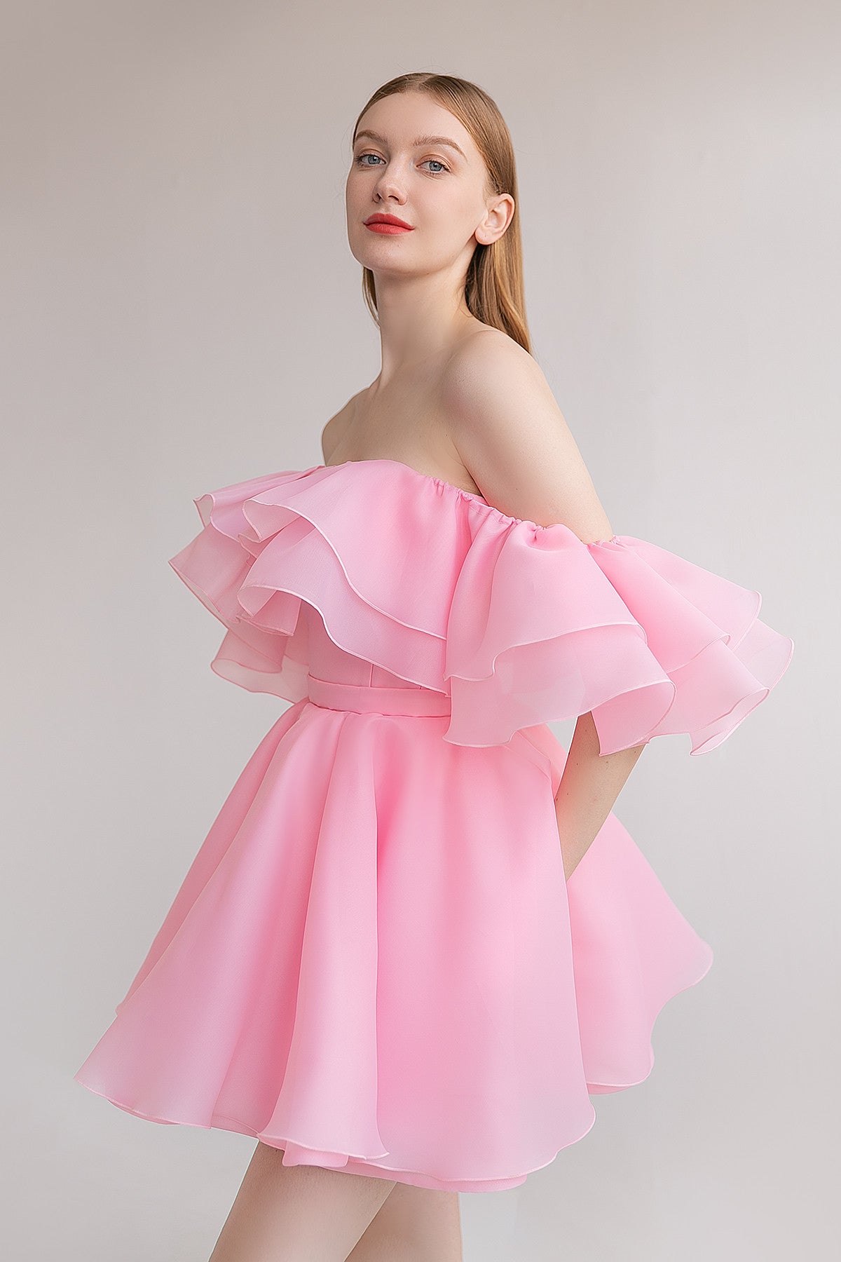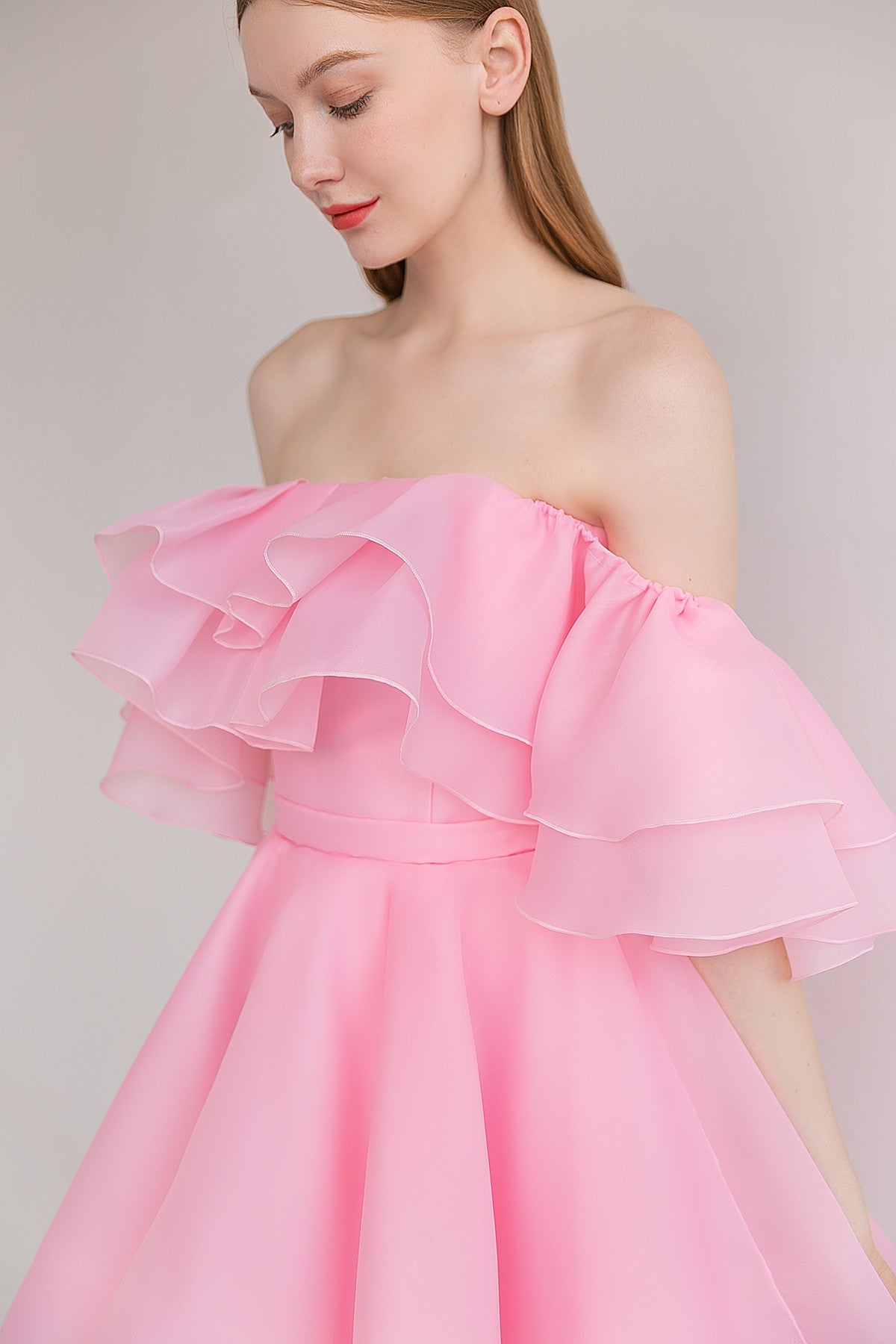 Playful corset mini dress made of organza with open lacing and a full skirt in the Baby Doll style. There are flounces along the edges of the corset, creating flowing sleeves that fall off the shoulders.