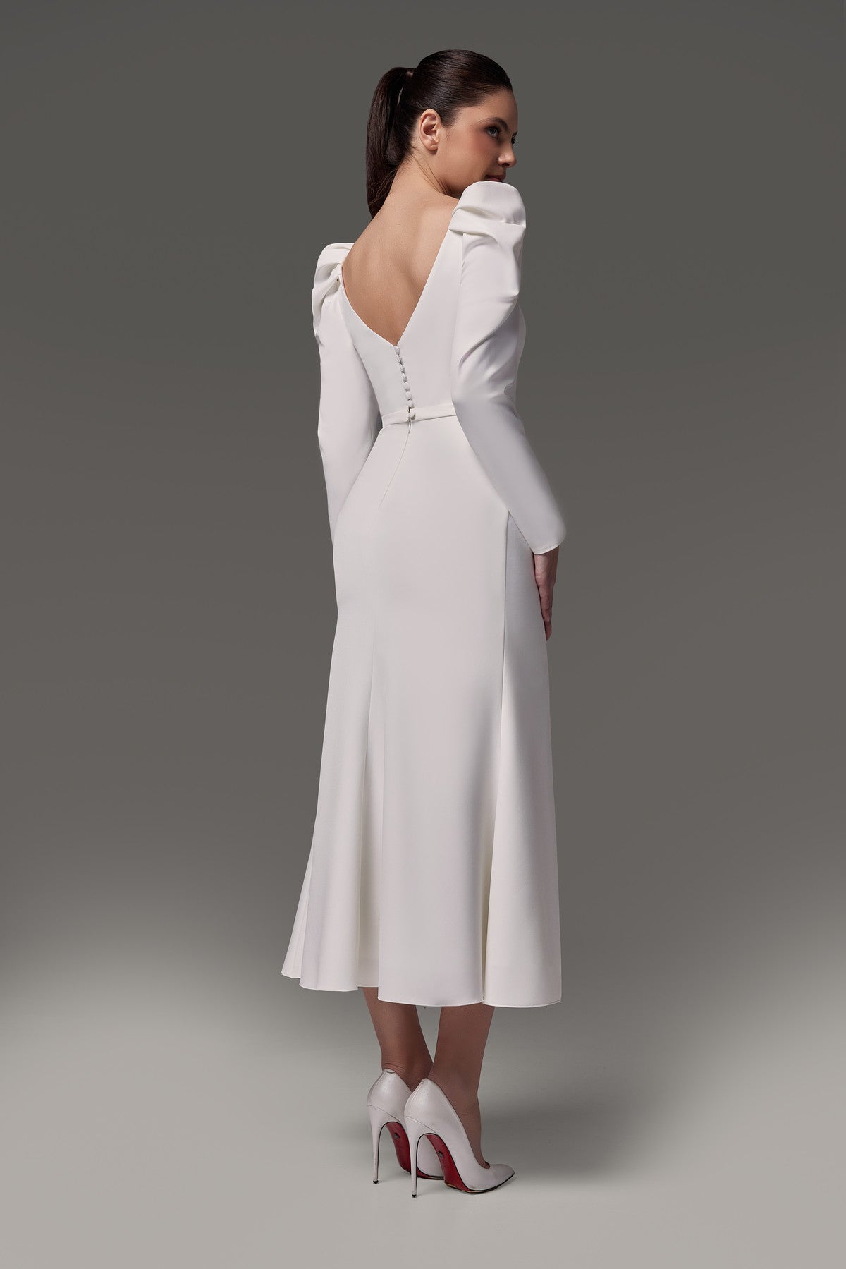 This simple wedding dress features a sophisticated pairing of square neckline and long sleeves, as well as a fit & flare skirt of tea length. In timeless luxe neutral shades, this style will live in your closet for years to come and look gorgeous every time. Our elegant and simple wedding dress is the perfect choice for brides who want a modest and minimalistic wedding dress.