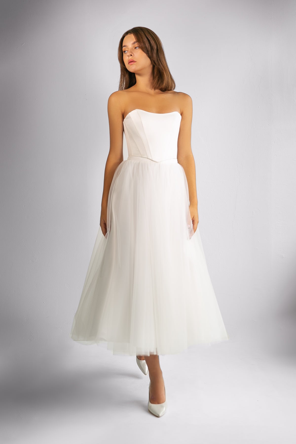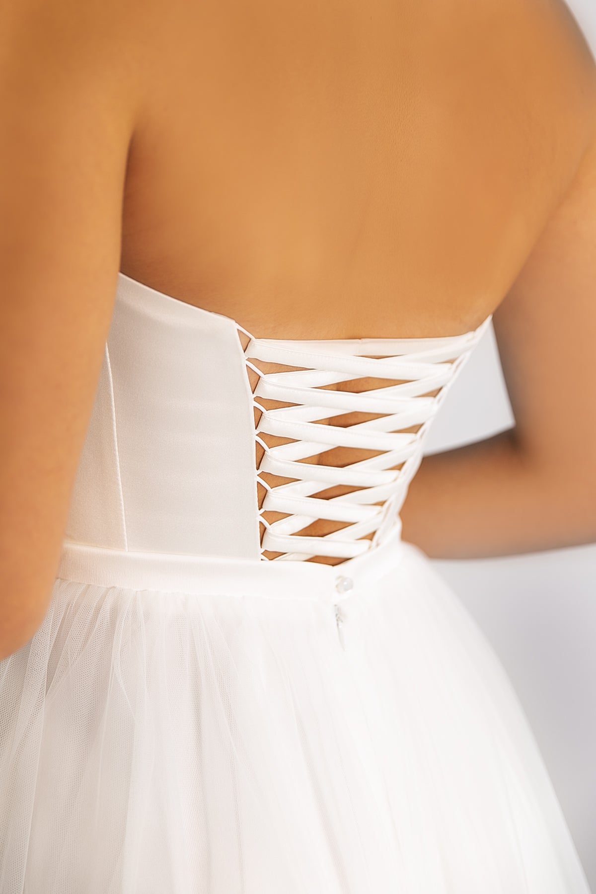 A satin strapless corset with lacing at the back, which can be paired with a puffy skirt or trousers to create a modern and stylish wedding look.