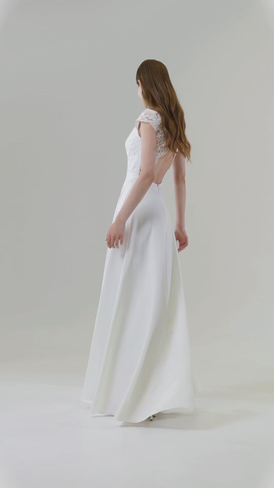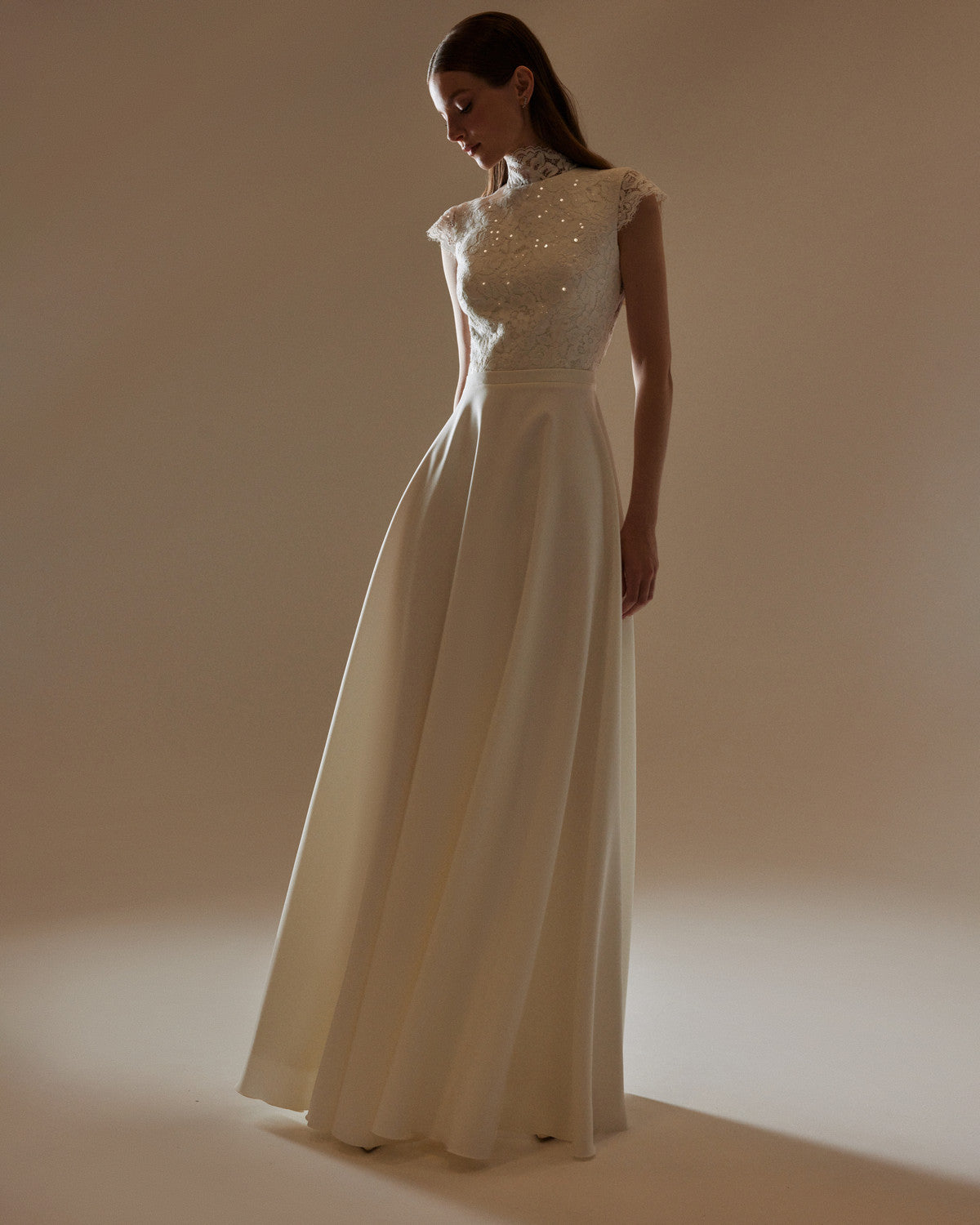 Elegant High Neck Lace Wedding Dress Anabel with Open Back and Flowing Satin Skirt