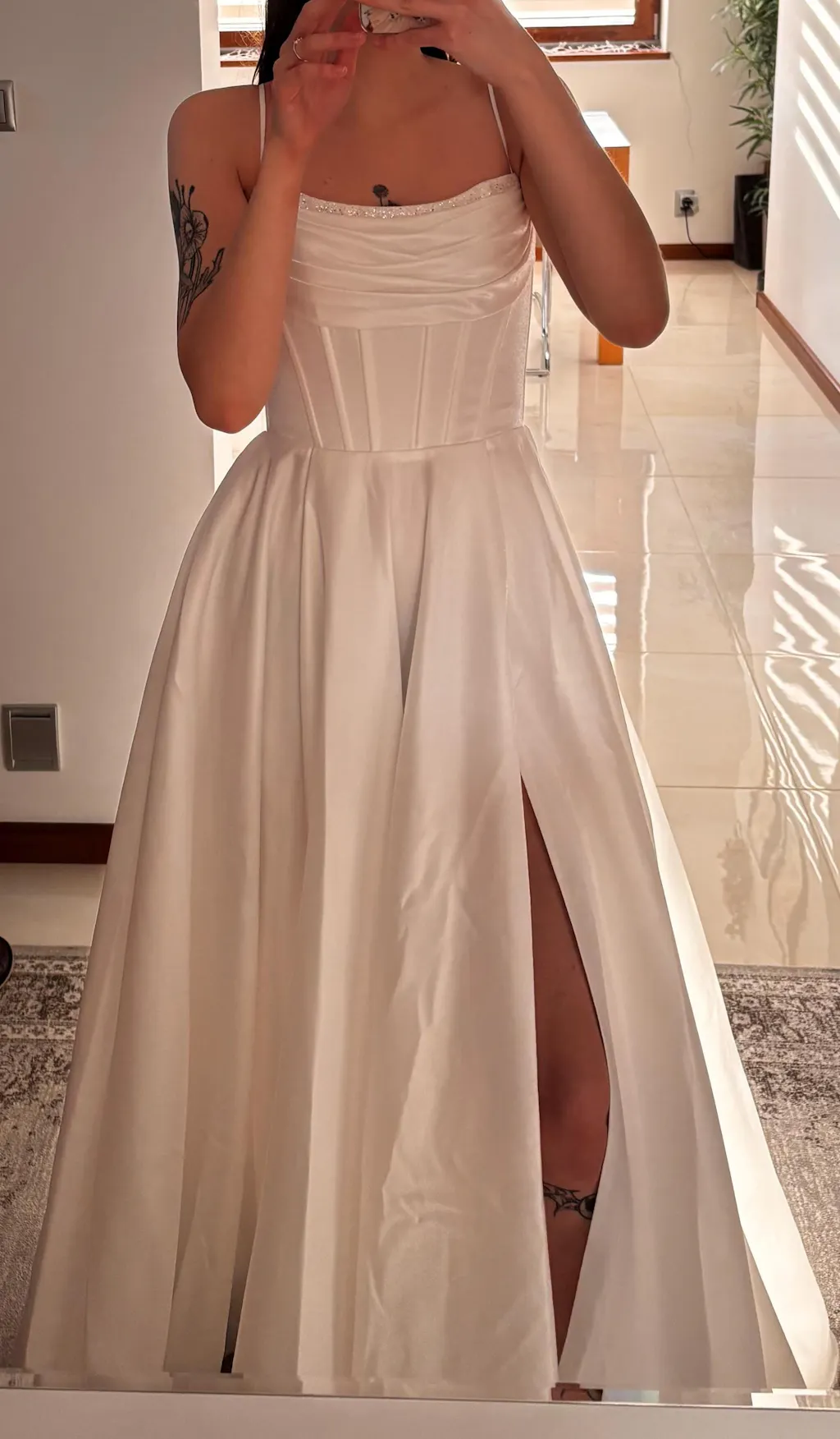 Elegant White Corset Wedding Dress with Slit Rihanna | Minimalist A-Line Bridal Gown with Draped Bodice