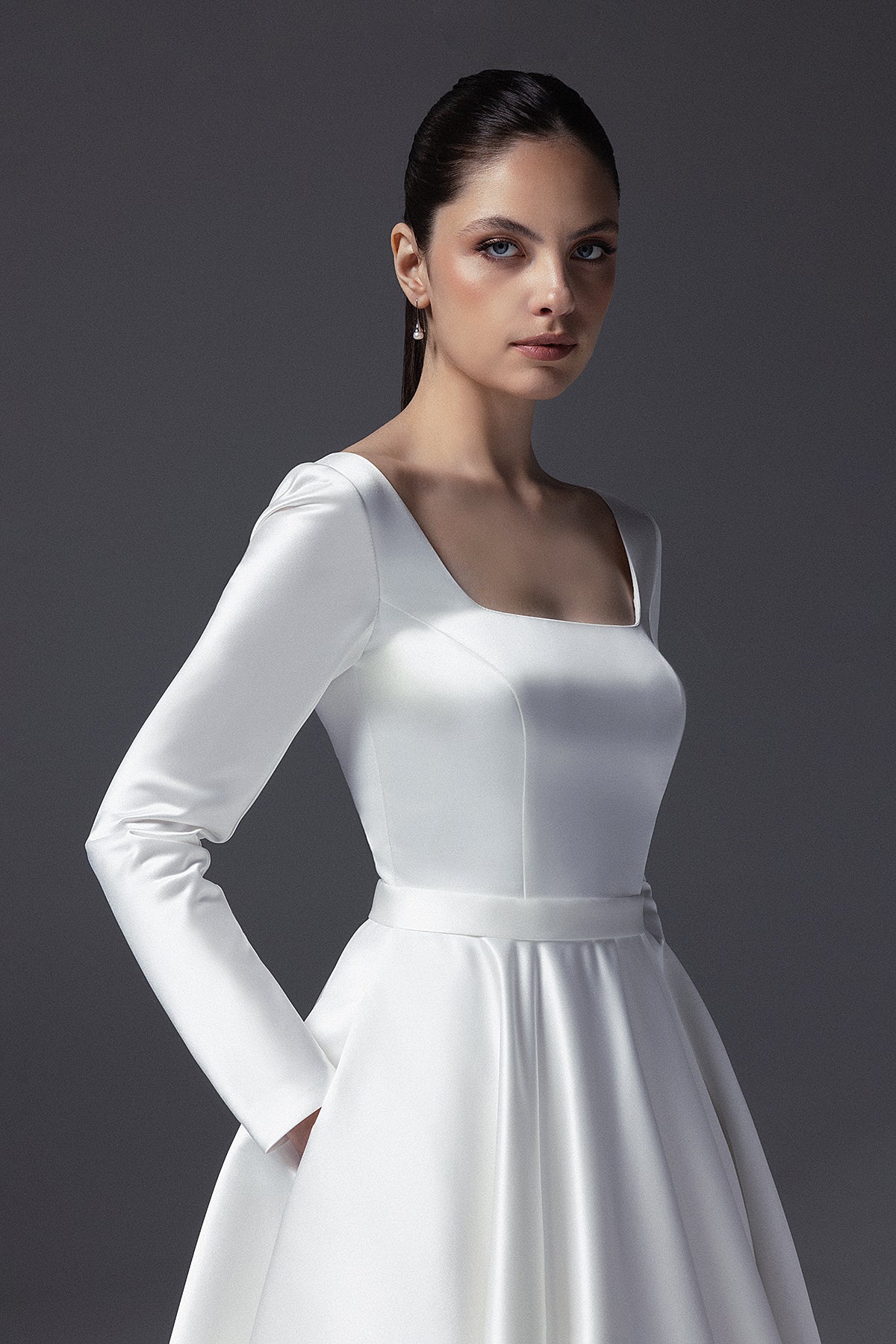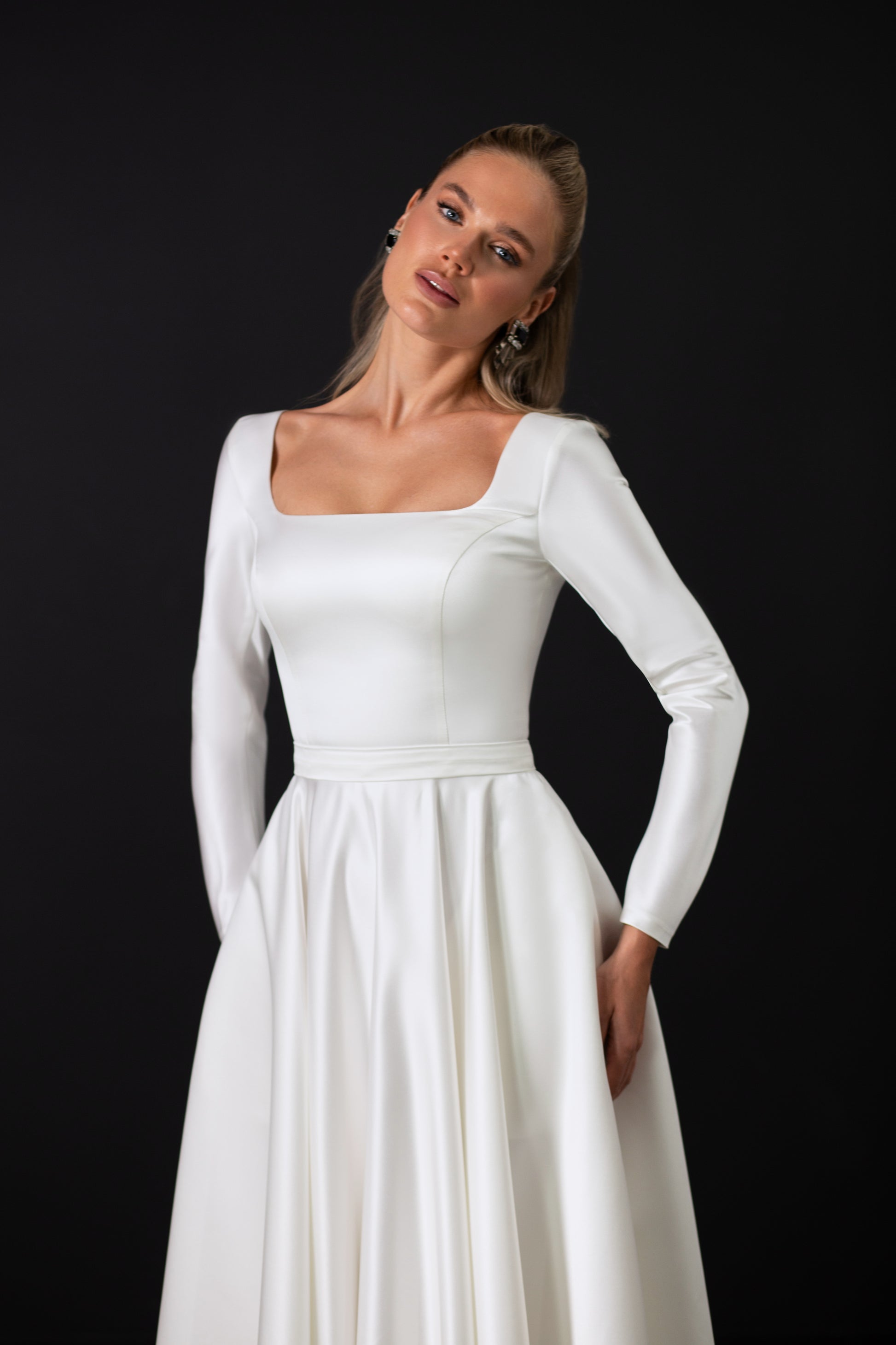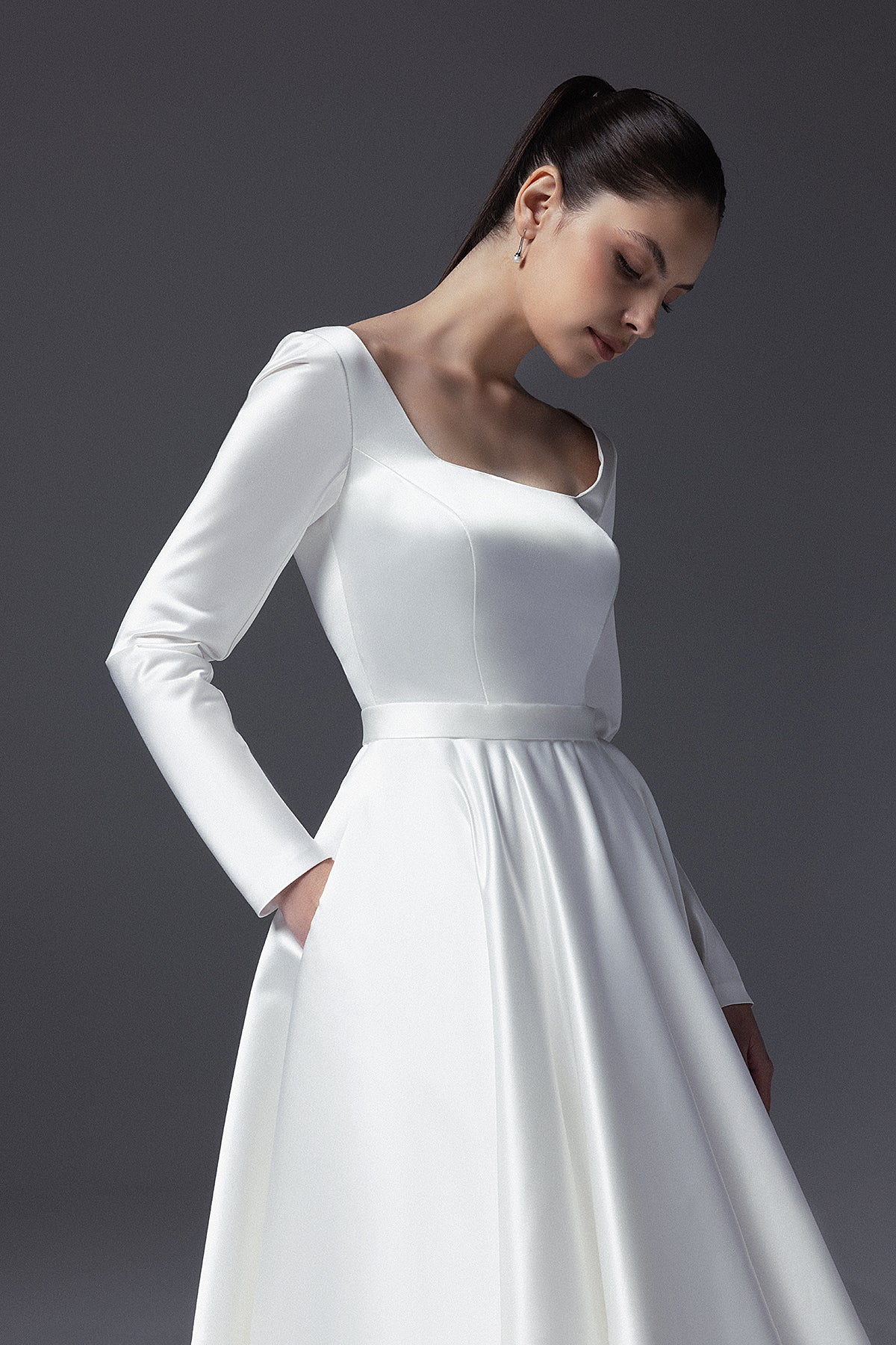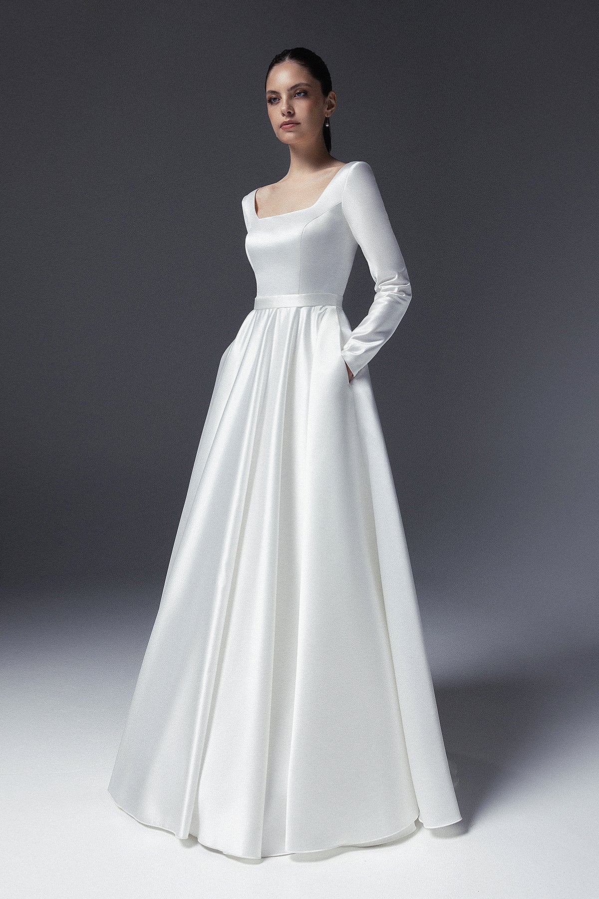 A-line wedding gown with a square neck and a touch of elegance. The princess seams and satin belt make it look so graceful and stunning. The pleats on the skirt add volume and drama to the classic satin dresses, and there are even pockets for a trendy touch! This satin dress is available in white or ivory and has long sleeves for a sophisticated look that works for both traditional and modern wedding styles.