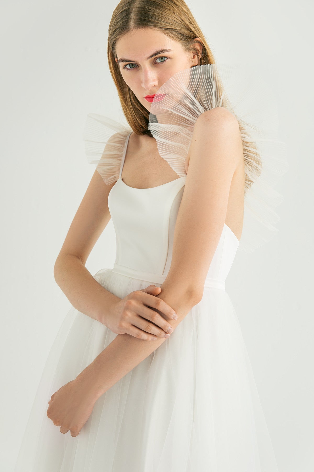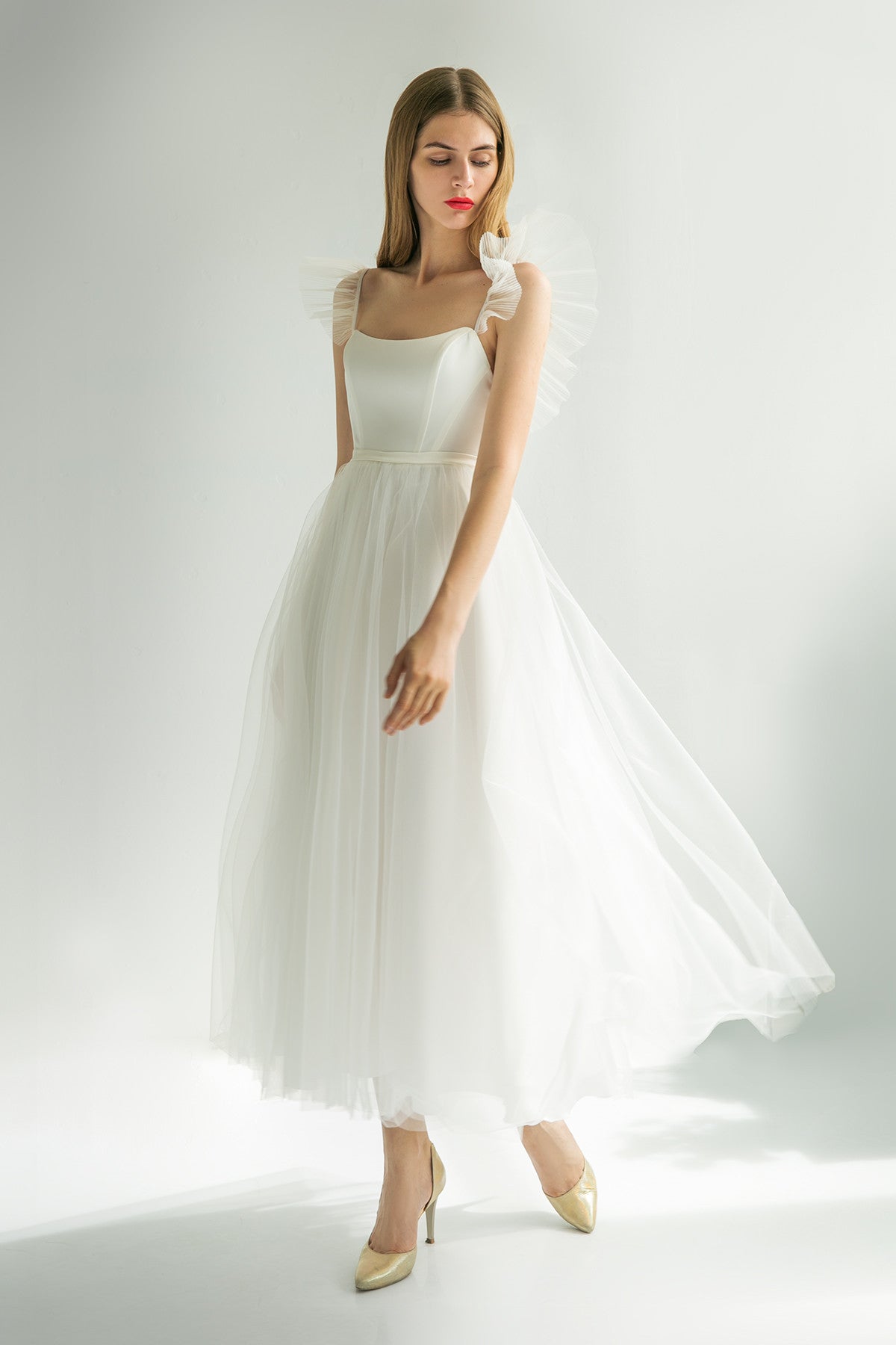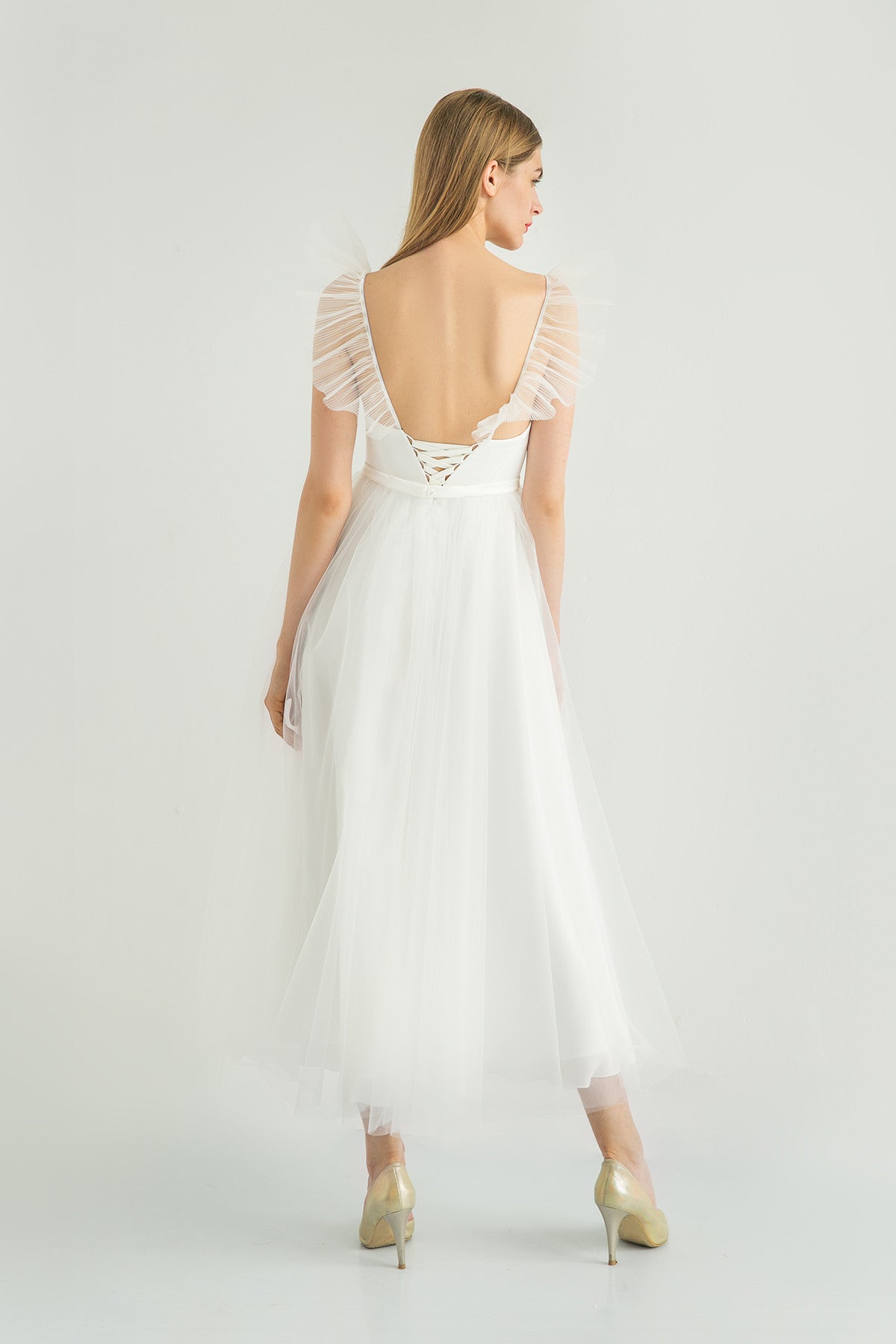 Light and playful, this minimalist wedding dress is perfect for any special occasion. The tea-length dress features a graceful corset with lace-up detailing, an A-line silhouette, and an off-the-shoulder neckline, which is paired with lovely, transparent sleeves. This romantic look is sure to make you feel like a princess. Whether you're attending a prom, civil ceremony, or reception, this dress will add a touch of elegance and charm to your special day.