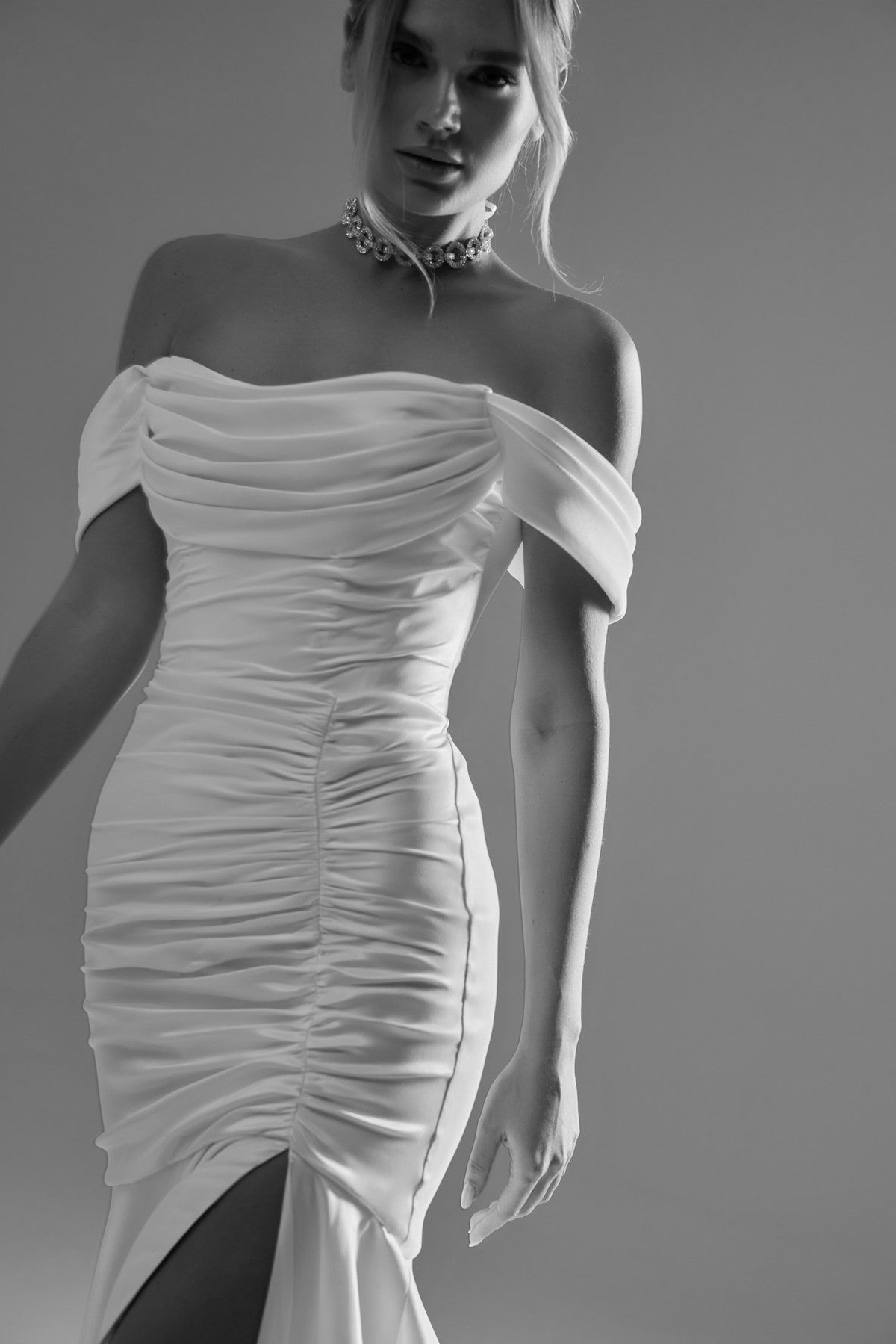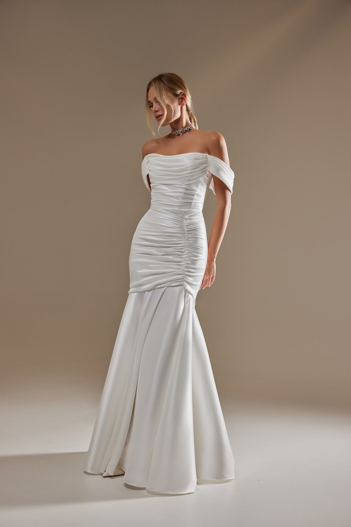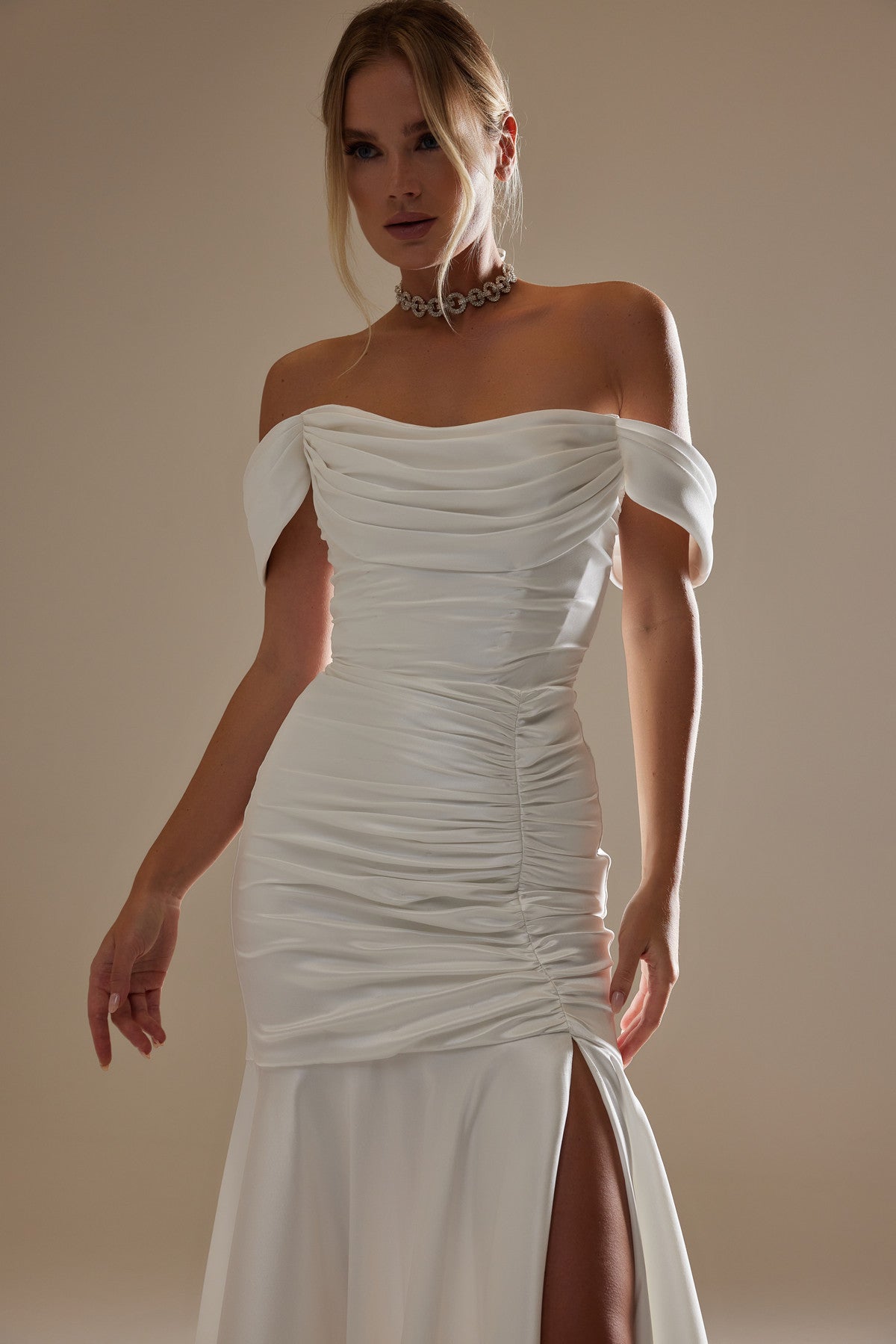 Our take on a classic fit-and-flare wedding gown. This style gives you a perfect blank canvas for accessorizing in your own unique style. It is made from stretchy mikado fabric, with an off-the-shoulder neckline and a lace-up back. The corset and draping provide unparalleled cinching and lifting, while the Mikado drape flows gracefully from the bust to the hips.