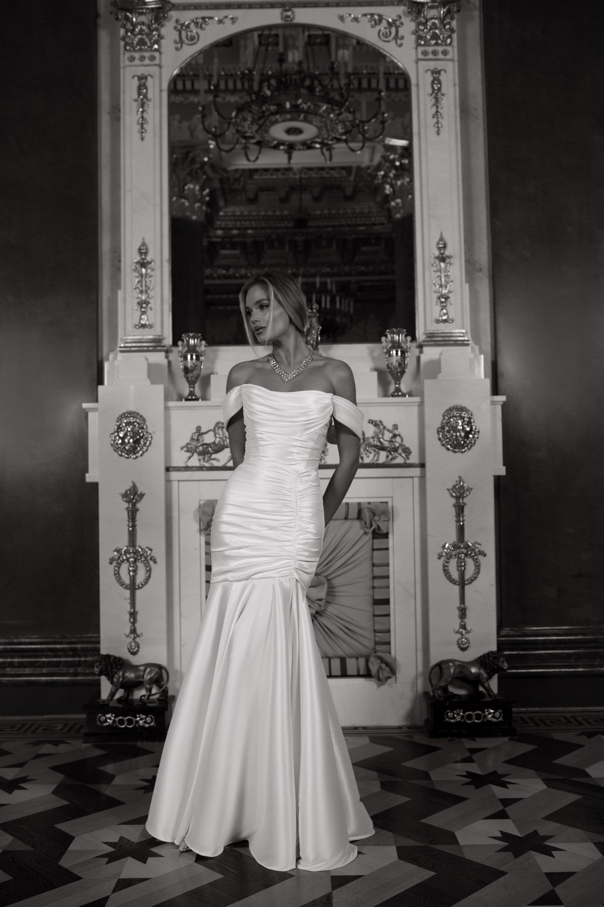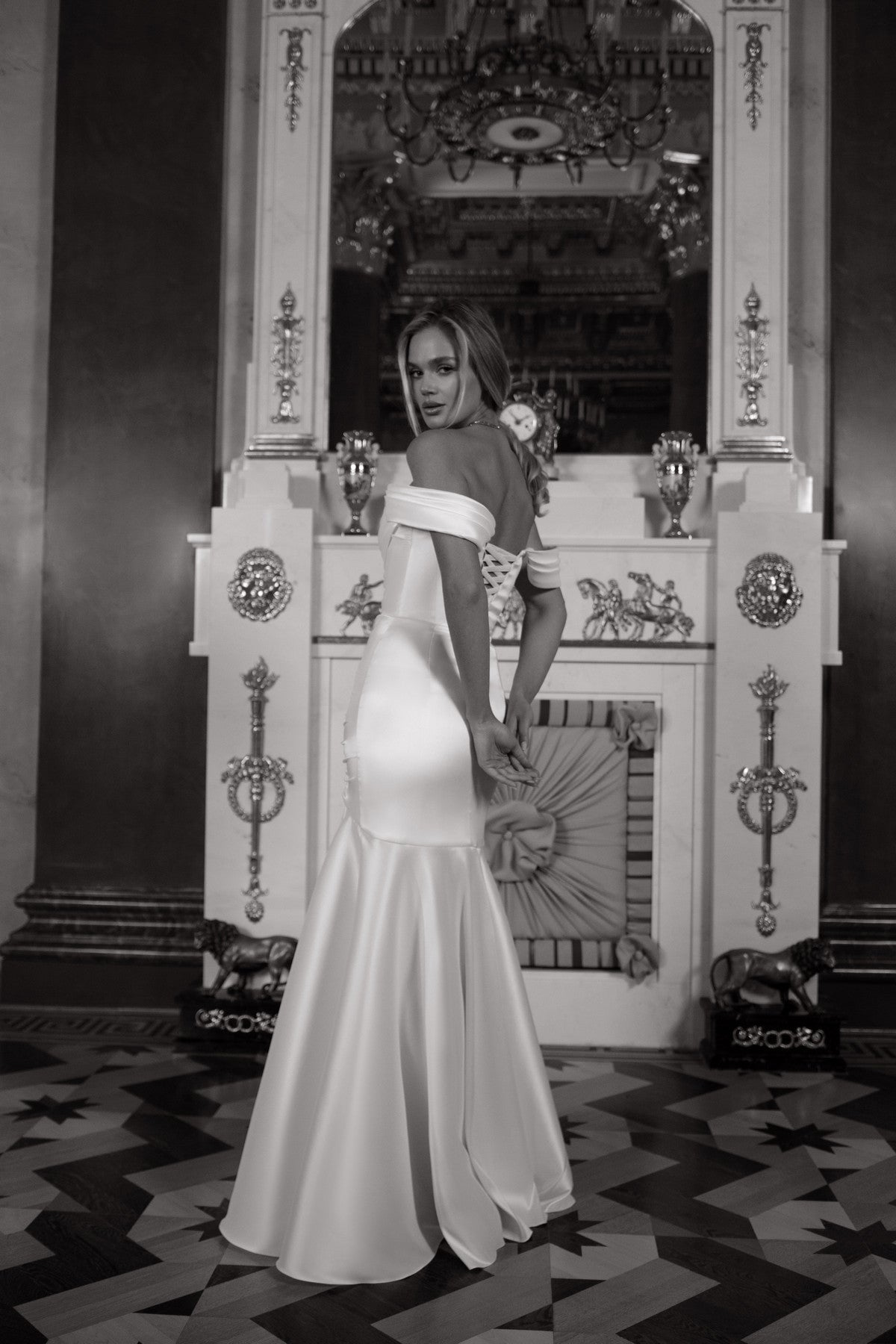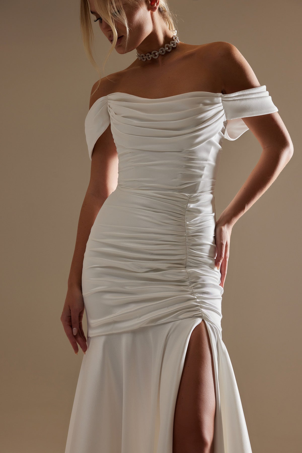 Our take on a classic fit-and-flare wedding gown. This style gives you a perfect blank canvas for accessorizing in your own unique style. It is made from stretchy mikado fabric, with an off-the-shoulder neckline and a lace-up back. The corset and draping provide unparalleled cinching and lifting, while the Mikado drape flows gracefully from the bust to the hips.