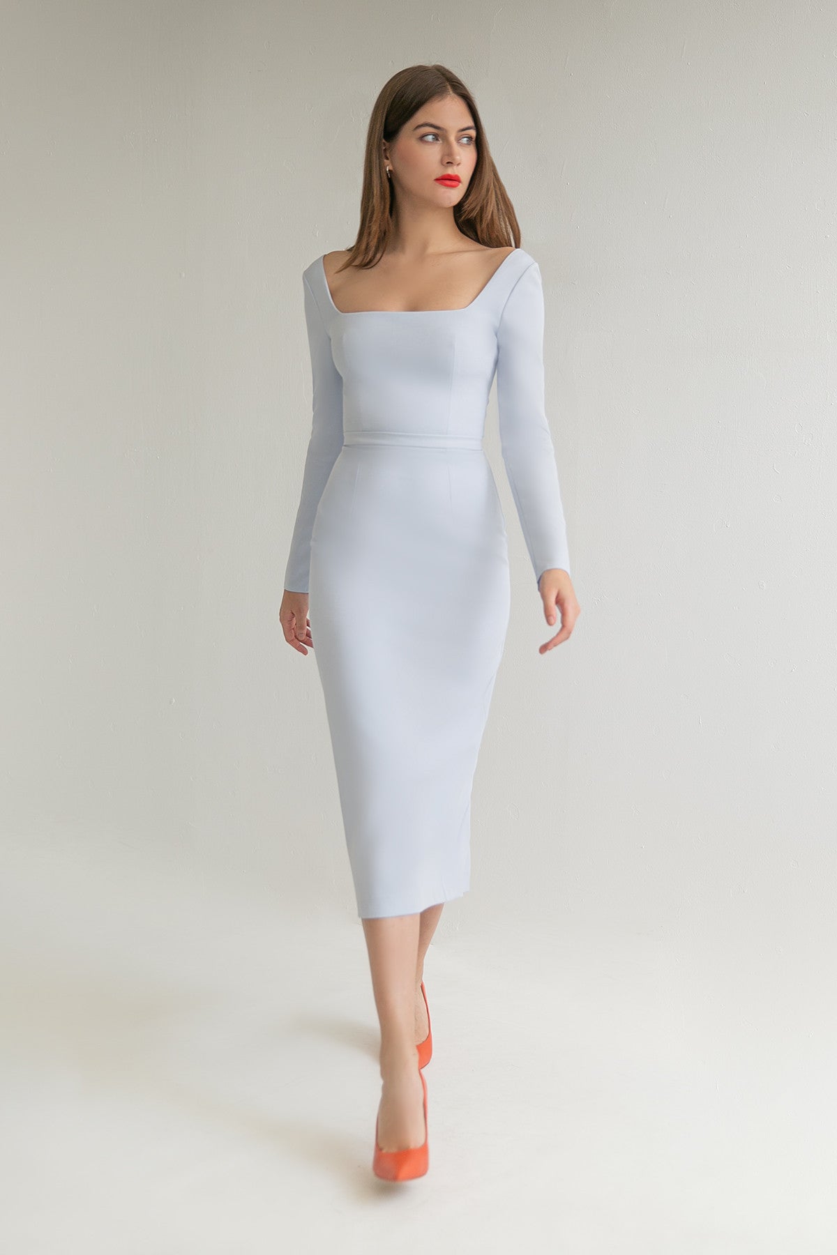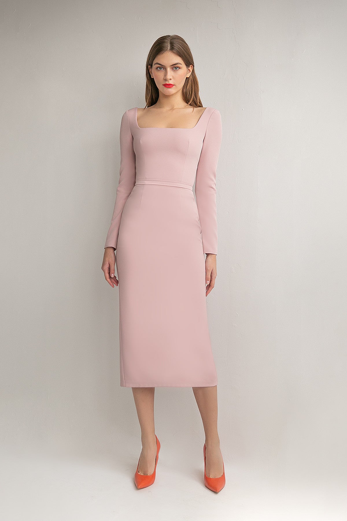 Tailored from smooth, structured crepe, this midi-length silhouette features a clean square neckline and long, slim sleeves - creating a look that is both sleek and timeless. The fitted bodice flows into a straight pencil-style skirt, emphasizing the figure with understated elegance. A subtle waistband detail defines the waist, adding a touch of structure to the minimalistic design.