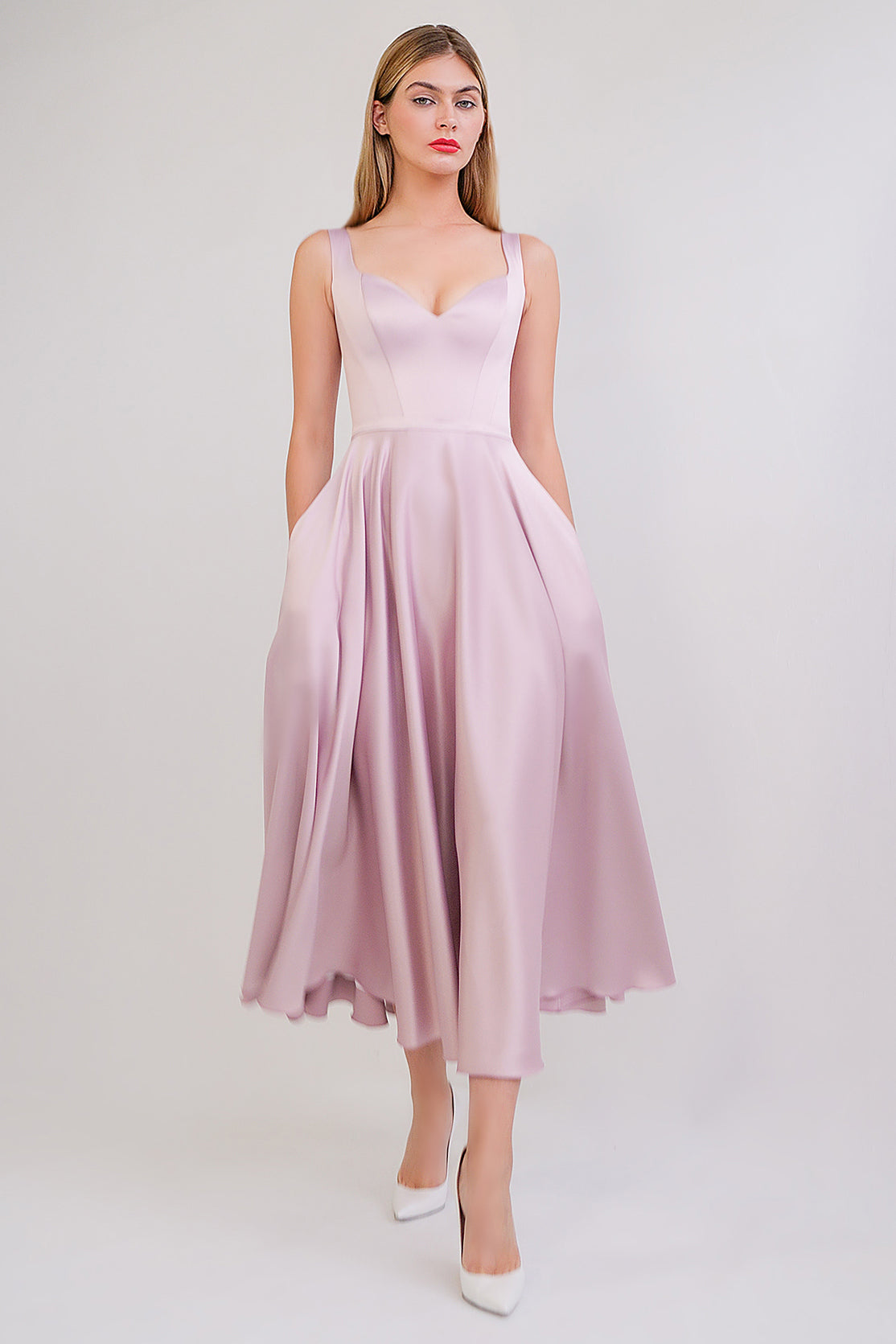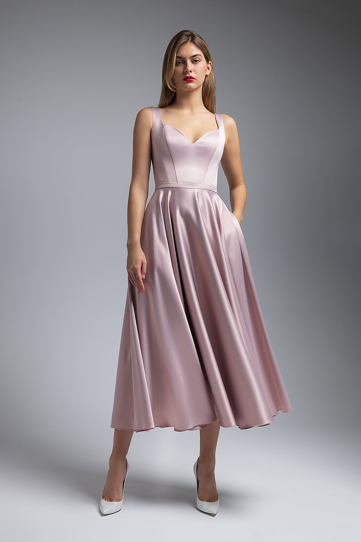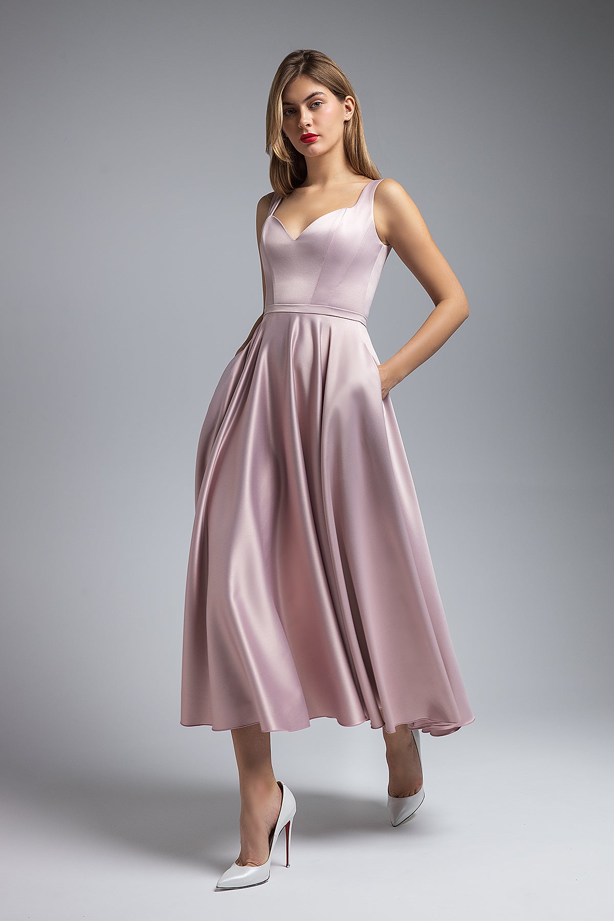 A cute, tea length dress made from stretchy satin with wide straps, a sweetheart neck, and full skirt with pockets.