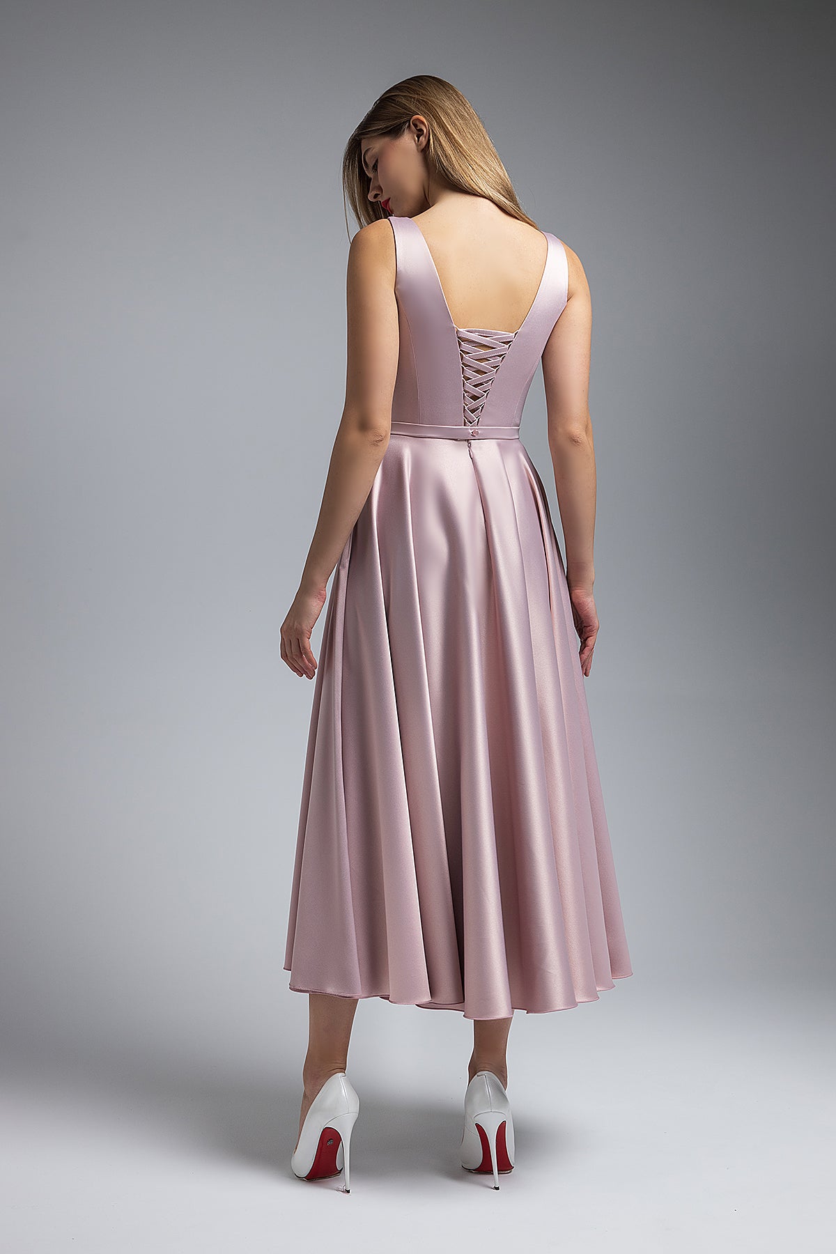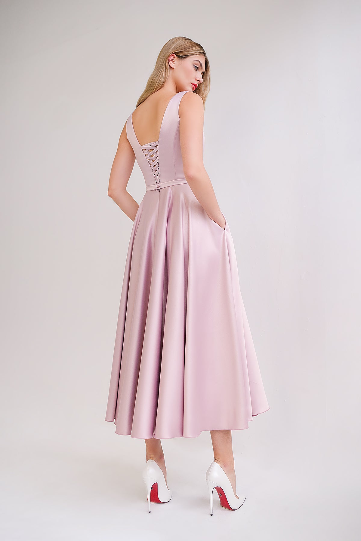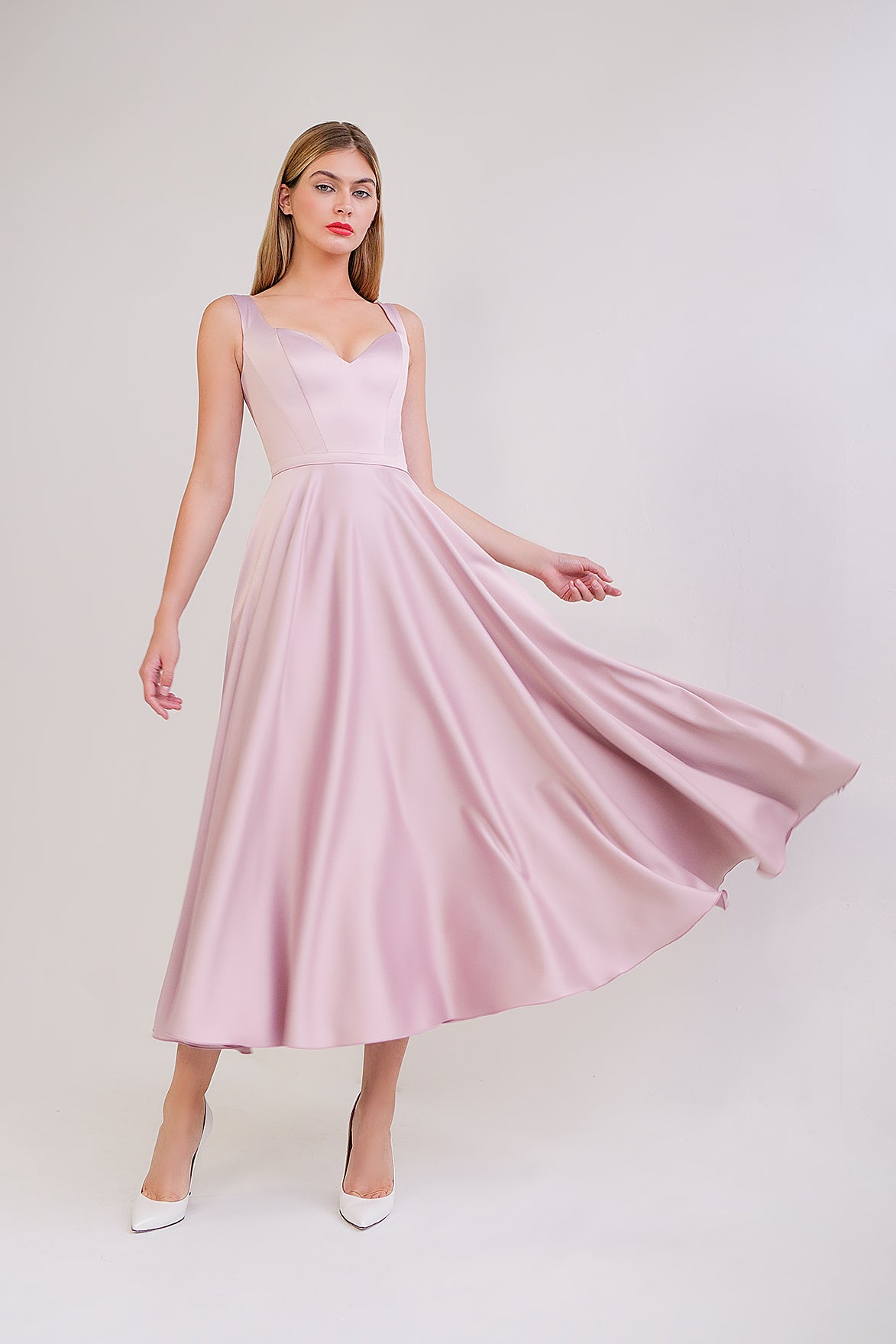 A cute, tea length dress made from stretchy satin with wide straps, a sweetheart neck, and full skirt with pockets.