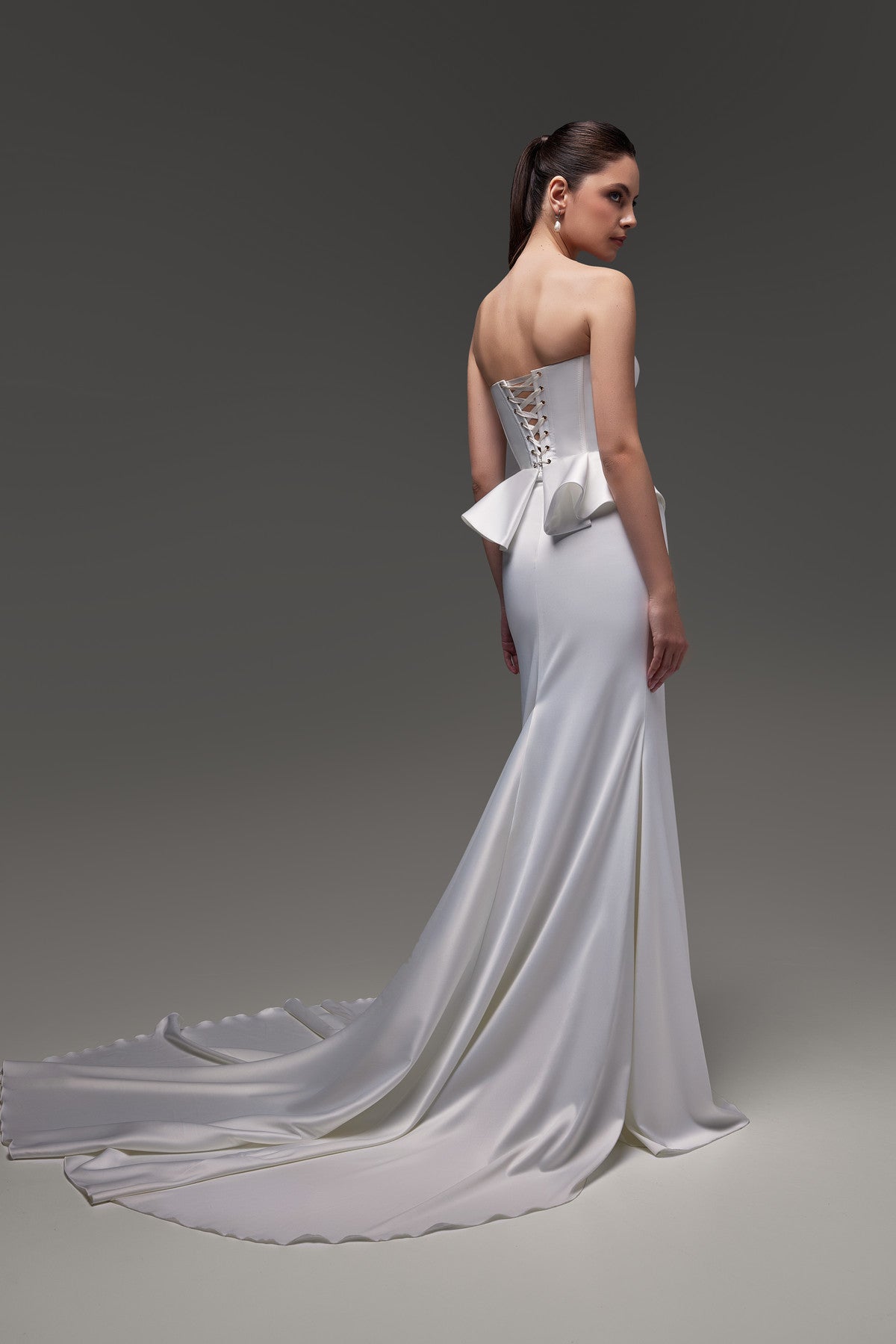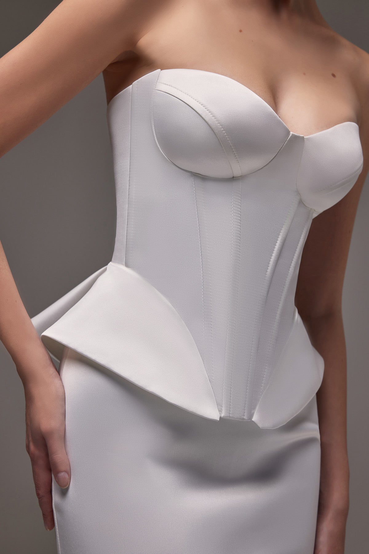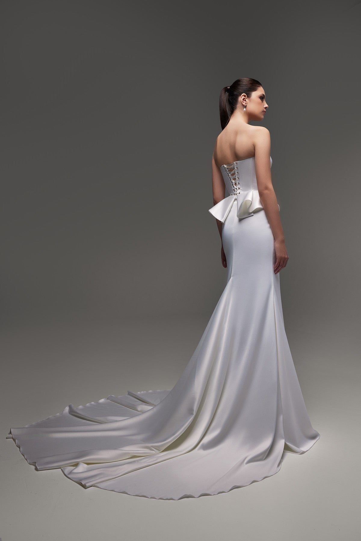 We offer an alternative to the traditional. We strive to break the rules, creating effortless bridal looks for the modern bride. Sparkle in our feminine sculptural corset Gina, made of satin, through a modern and avant-garde lens. Combined with satin fit & flare skirt with a magnificent cathedral train.