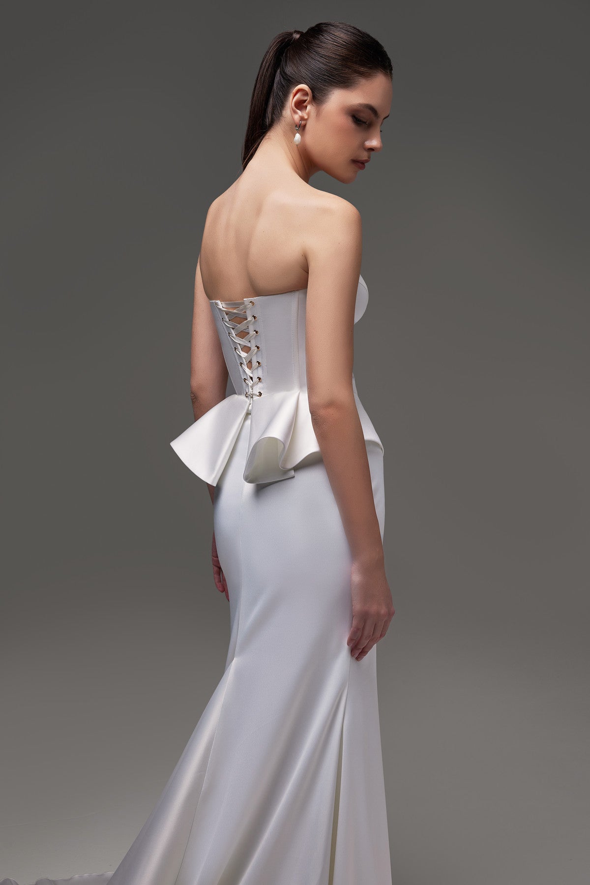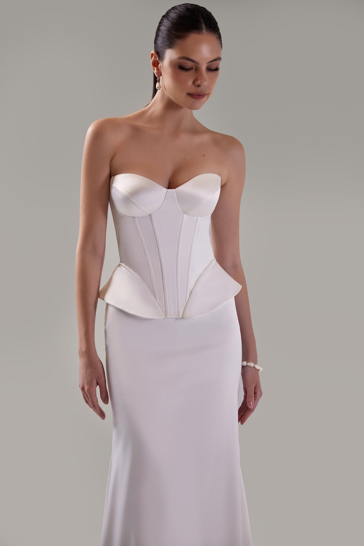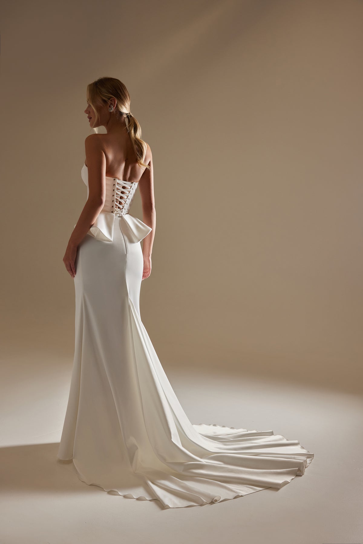 We offer an alternative to the traditional. We strive to break the rules, creating effortless bridal looks for the modern bride. Sparkle in our feminine sculptural corset Gina, made of satin, through a modern and avant-garde lens. Combined with satin fit & flare skirt with a magnificent cathedral train.