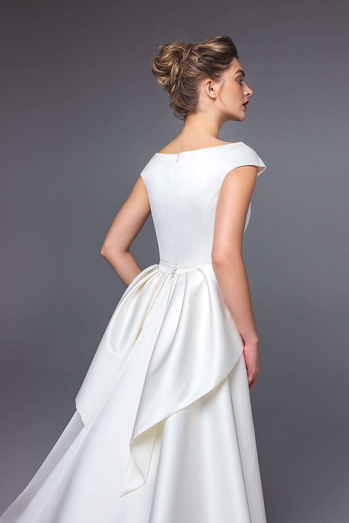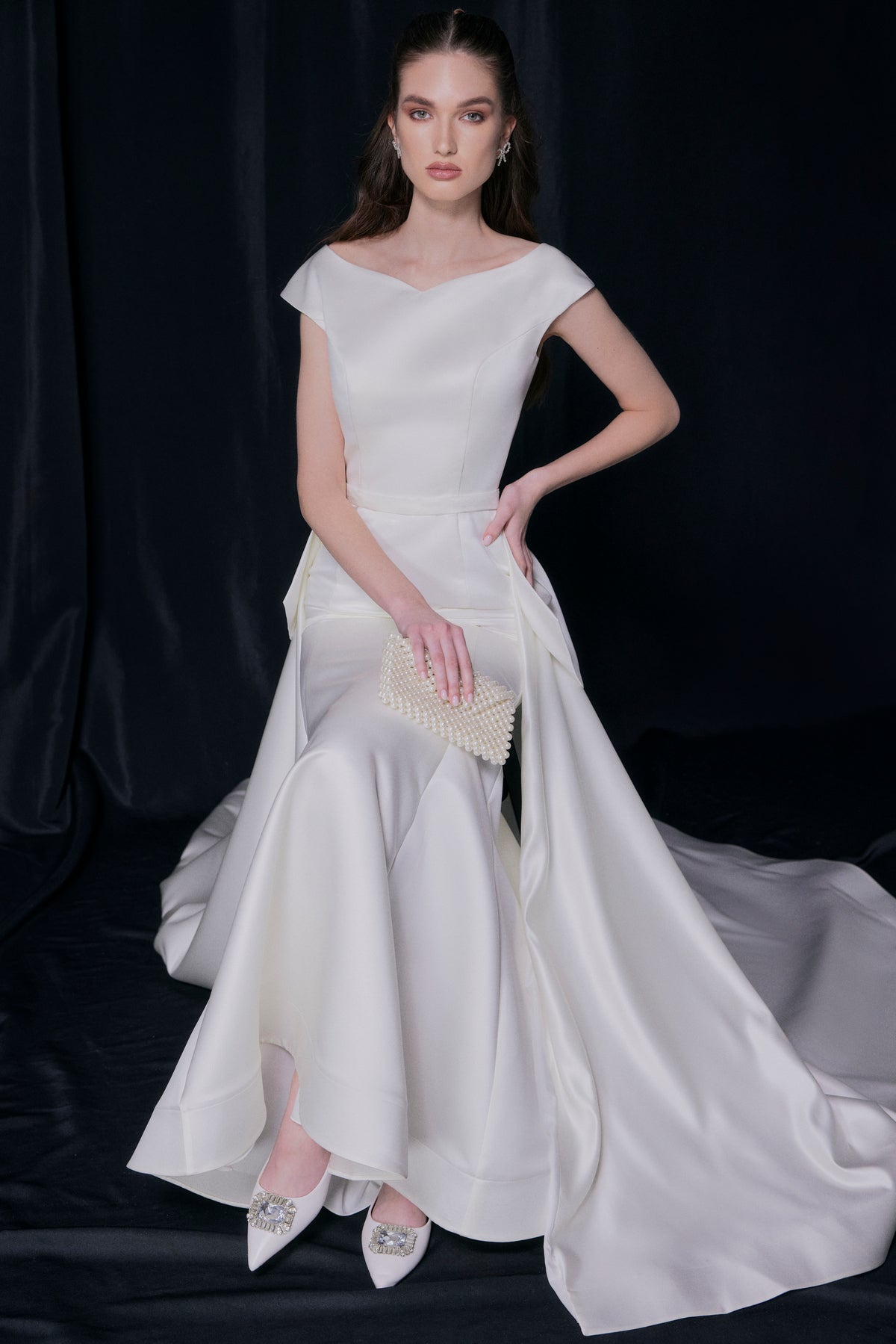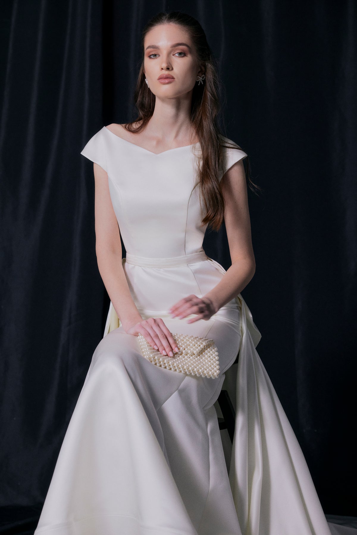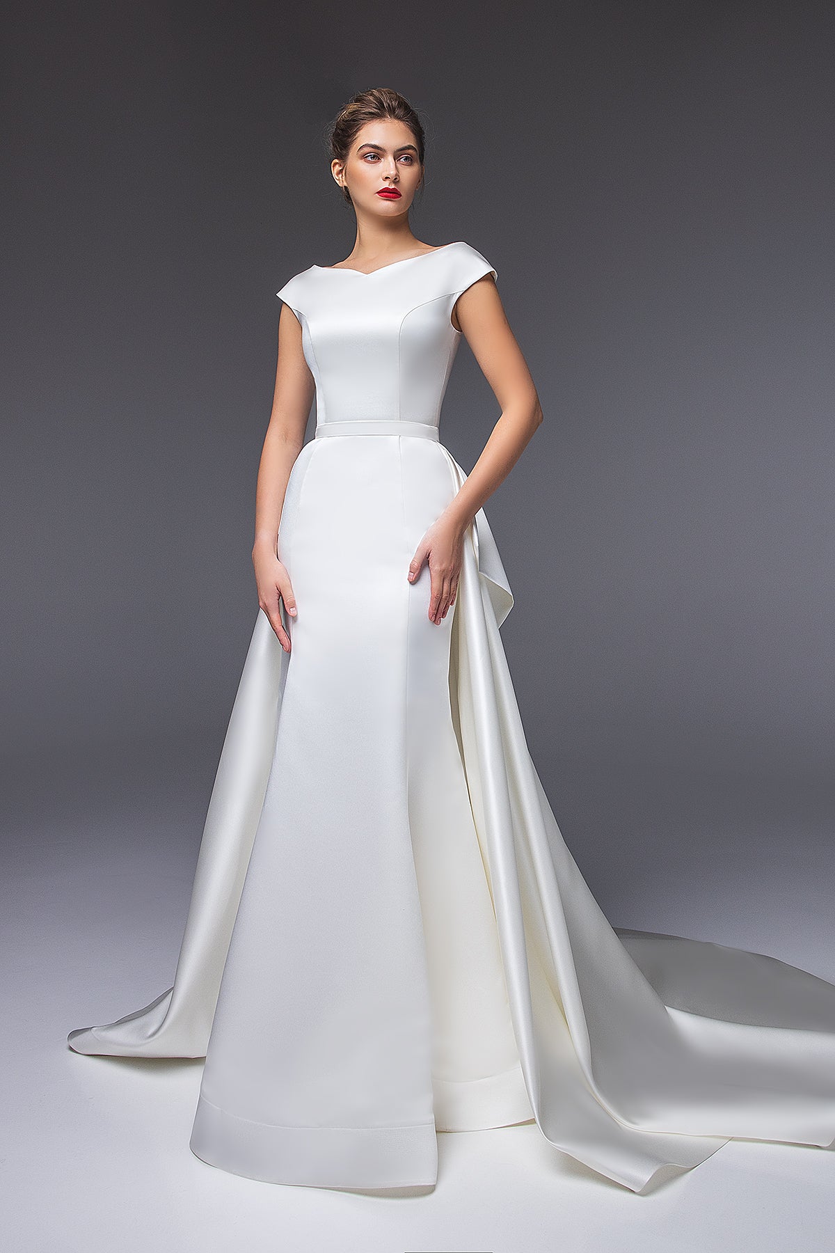 A simple and chic satin dress with a boat neckline and flirty shoulders, teasingly revealing your neck and collar bones. The mermaid skirt with vertical seams visually elongates your figure and emphasizes your feminine curves. The dress comes with a detachable A-line satin skirt with, featuring a stunning bow detail.