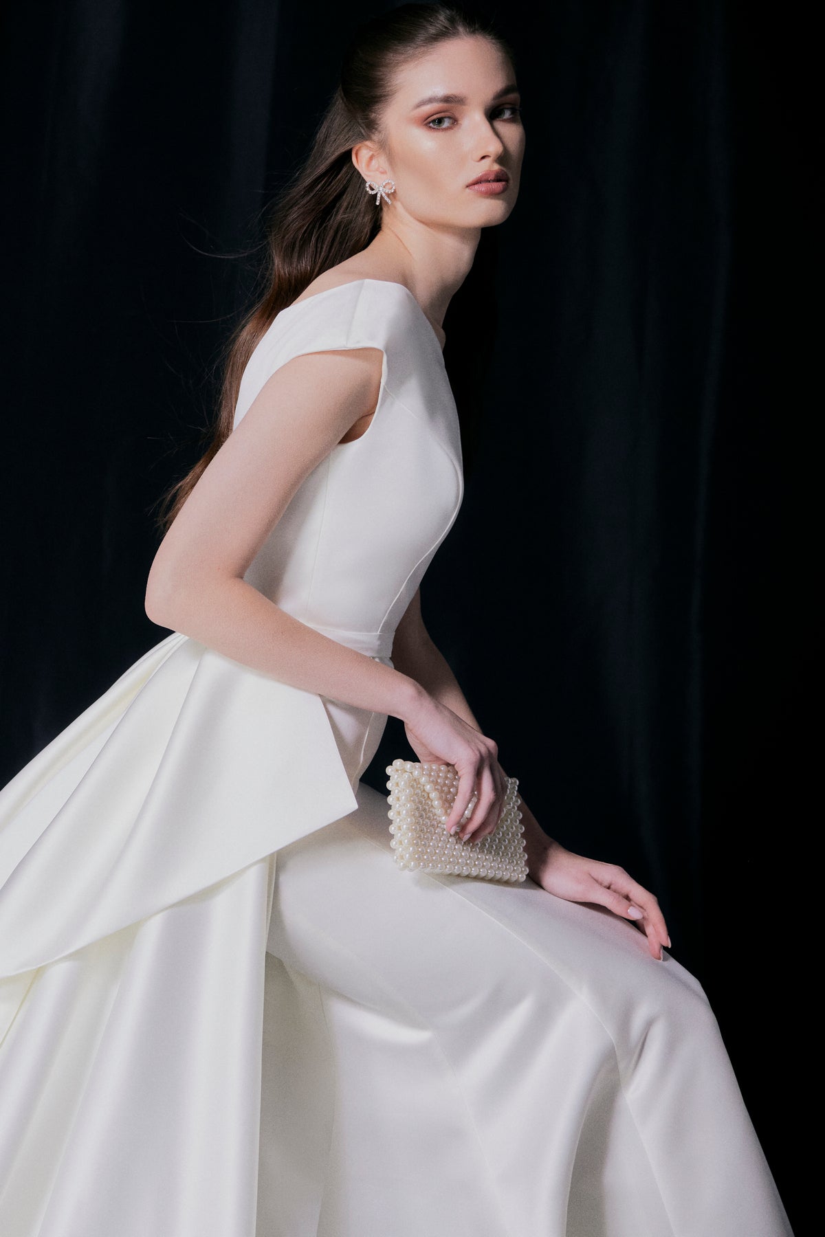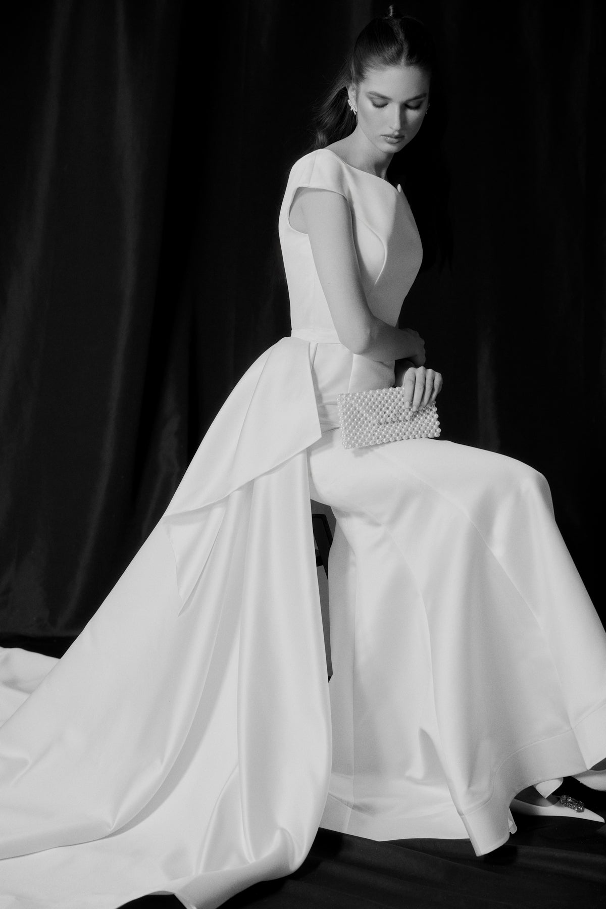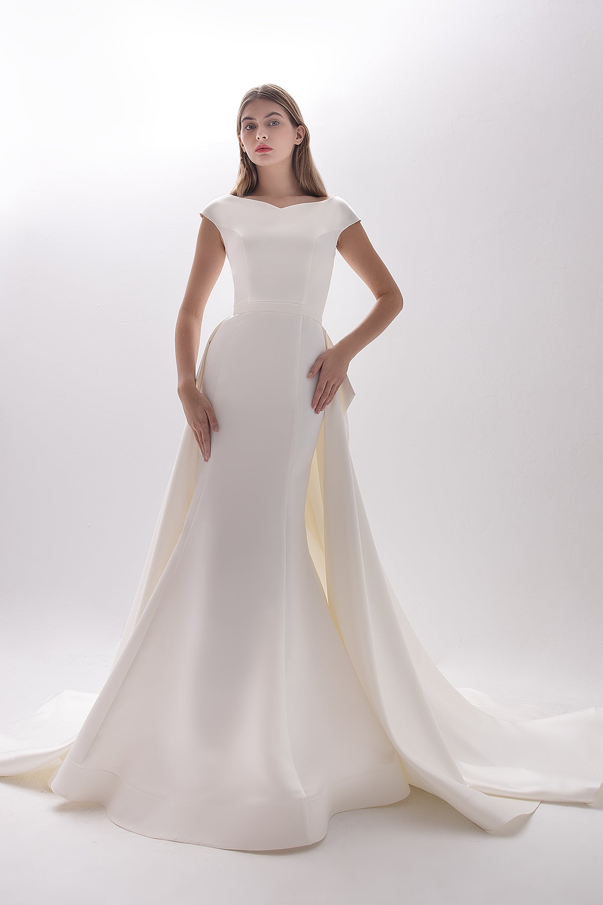 A simple and chic satin dress with a boat neckline and flirty shoulders, teasingly revealing your neck and collar bones. The mermaid skirt with vertical seams visually elongates your figure and emphasizes your feminine curves. The dress comes with a detachable A-line satin skirt with, featuring a stunning bow detail.